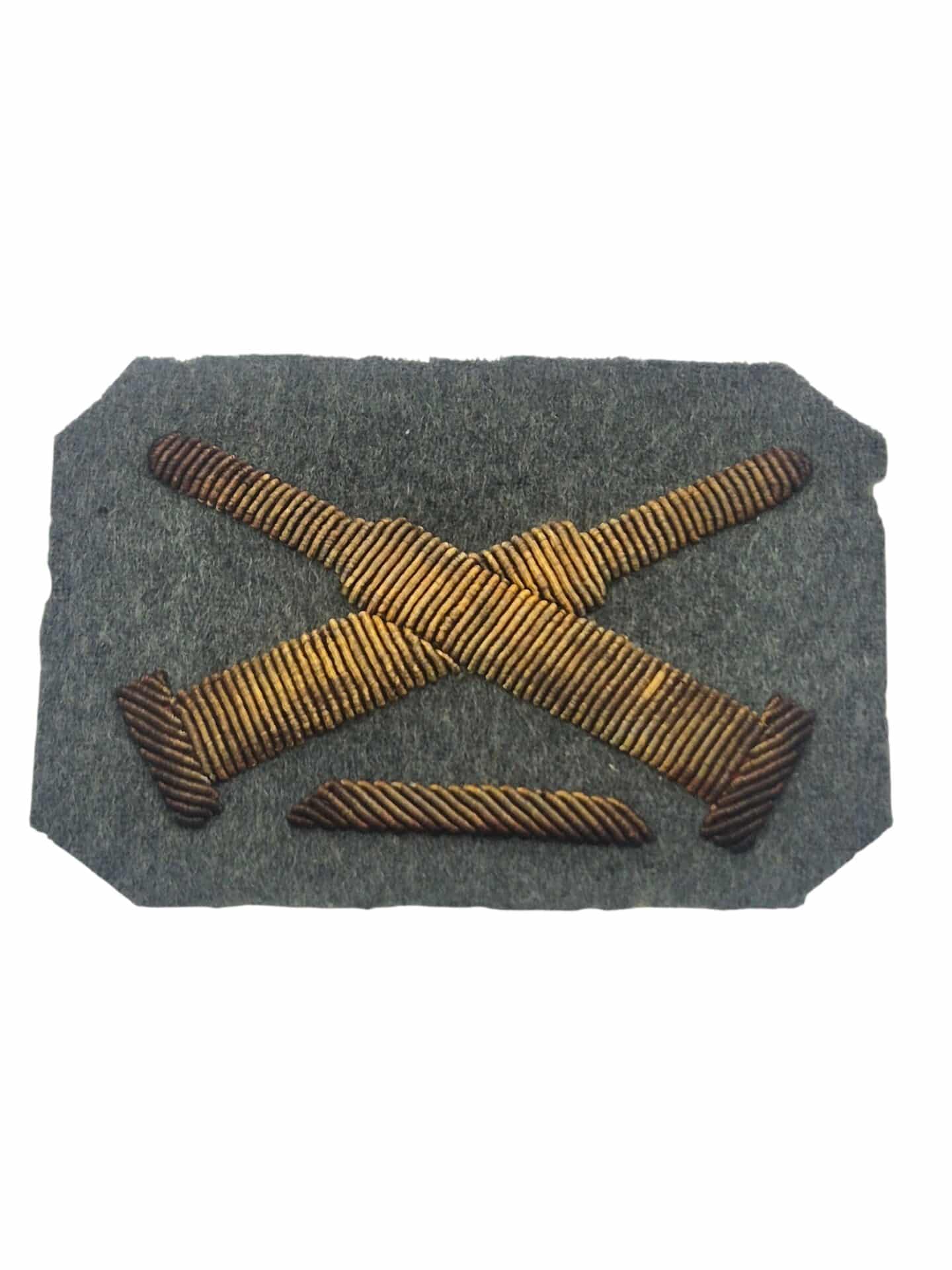 Vooroorlogs Nederlands vaardigheidsembleem scherpschutter zware mitrailleur. Het embleem is gemaakt van gouddraad en geborduurd op stuk veldgrijze stof. Dit embleem werd gedragen door onderofficieren.