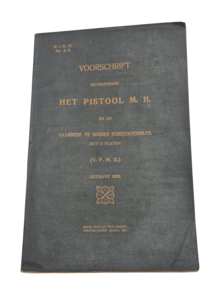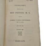 Extreem zeldzaam voorschrift voor het M11 pistool, de “Nederlandse” Luger. Deze was vooral in gebruik bij de mariniers en in het KNIL. Het voorschrift is in een goede staat met alleen op de laatste plaat een klein beetje schade door ongedierte. Het voorschrift is voorzien van bijlagen en aanpassingen en nog alle 5 de platen zijn aanwezig. Het voorschrift is op naam van Vos, er is ooit een mariniershelm verkocht met deze achternaam erin.