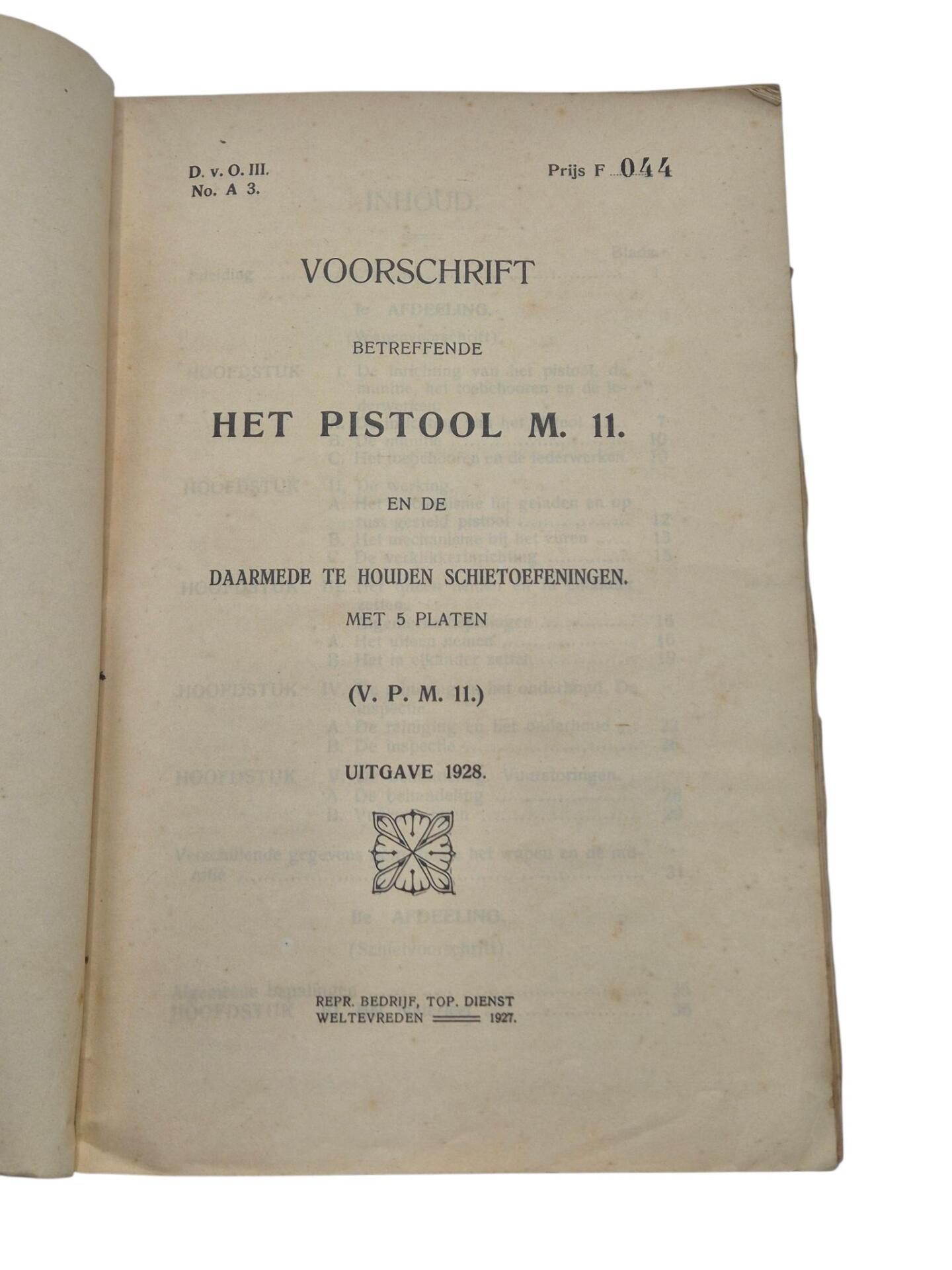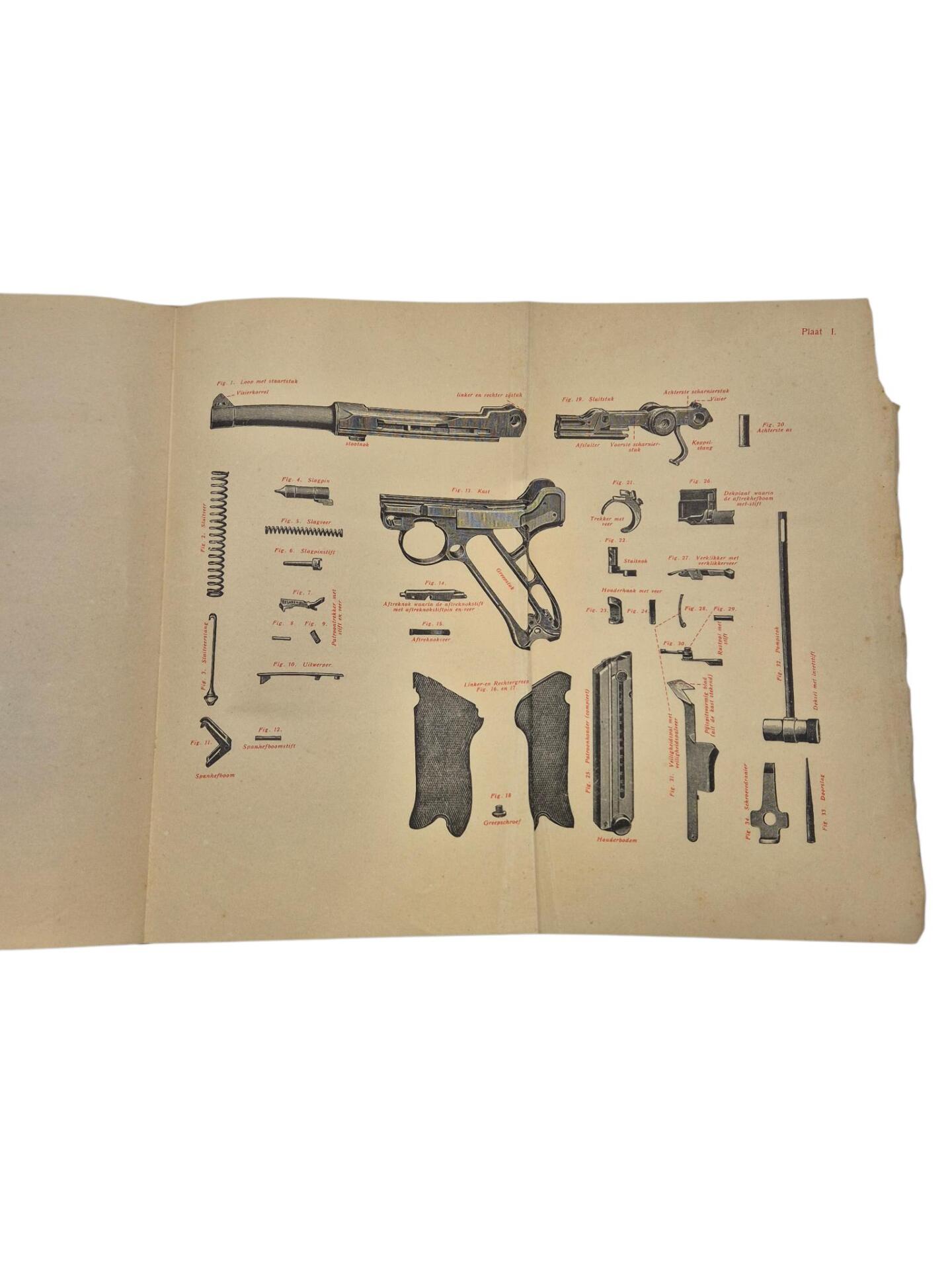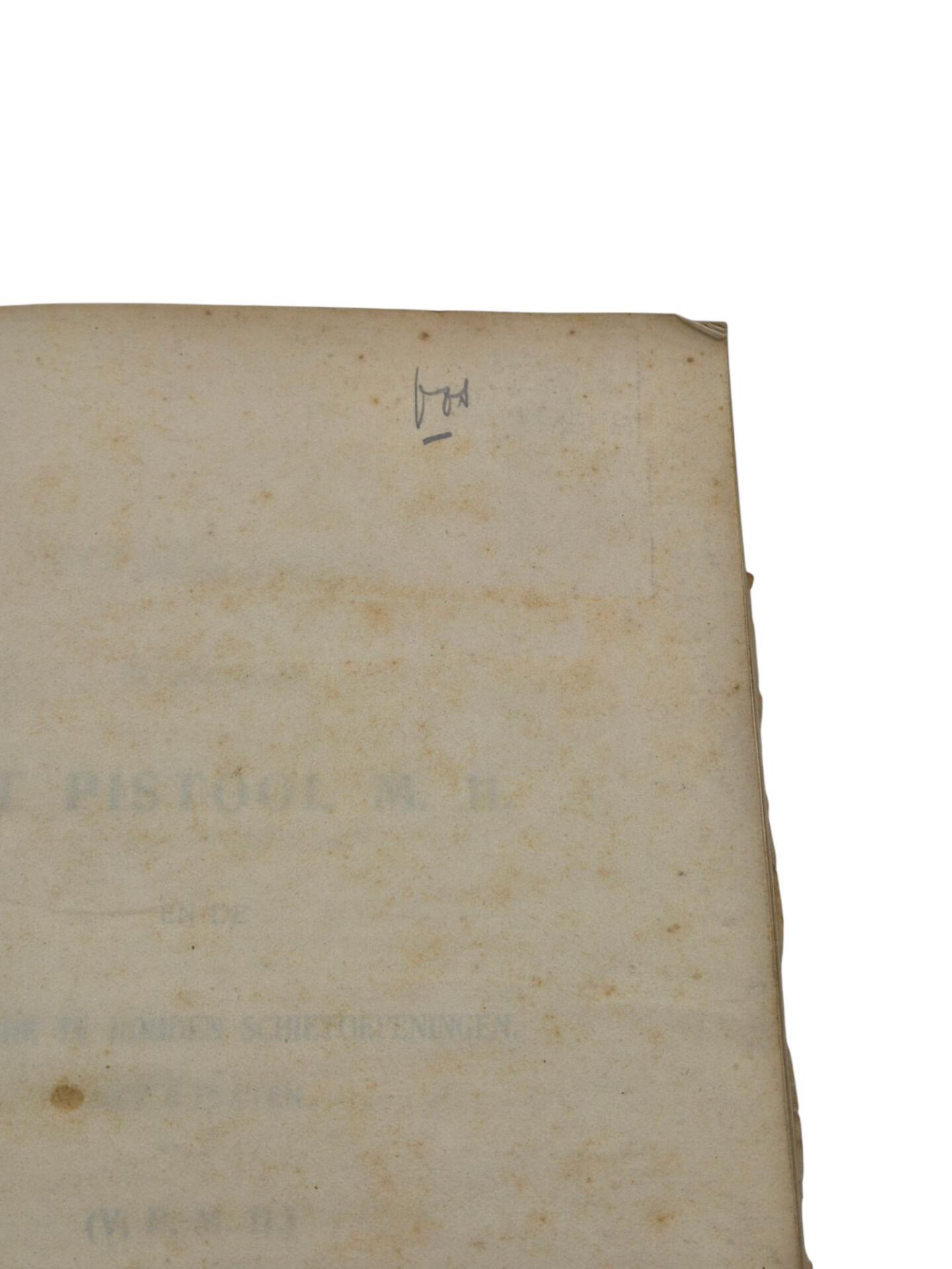 Extreem zeldzaam voorschrift voor het M11 pistool, de “Nederlandse” Luger. Deze was vooral in gebruik bij de mariniers en in het KNIL. Het voorschrift is in een goede staat met alleen op de laatste plaat een klein beetje schade door ongedierte. Het voorschrift is voorzien van bijlagen en aanpassingen en nog alle 5 de platen zijn aanwezig. Het voorschrift is op naam van Vos, er is ooit een mariniershelm verkocht met deze achternaam erin.