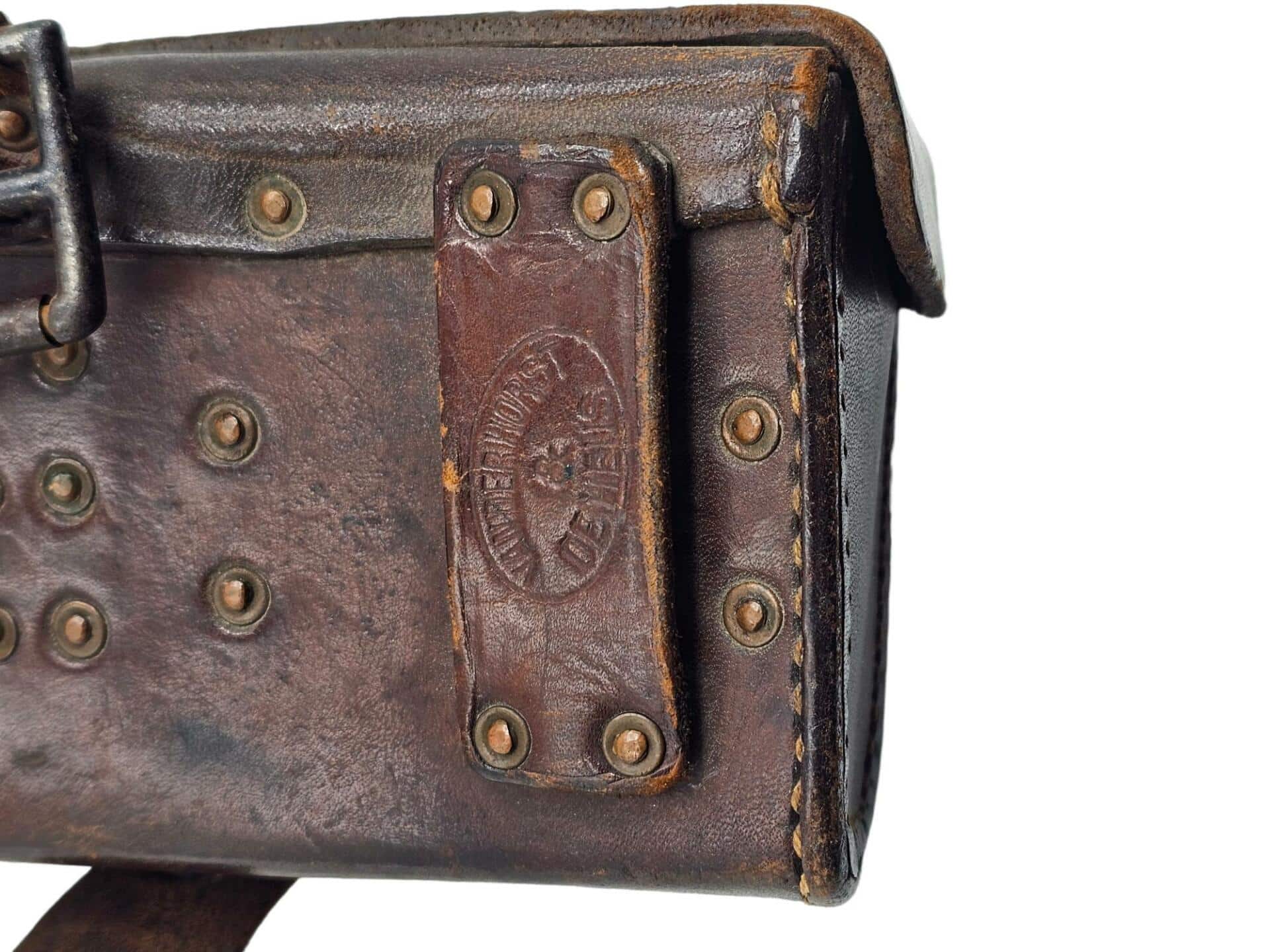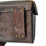 Nederlandse Hembrug M.95 bloktassen set. De tassen verkeren nog in een nette staat. Het sluitleertje is bij de tas zonder sleutel aan 1 zijde ingescheurd maar dit is niet zichtbaar als de tassen op de pop bevestigd zitten. De lederen binnen voering is nog aanwezig bij de tas zonder sleutelvakje in de tas met sleutelvakje is het binnenwerk wel gedeeltelijk verwijderd wat vaker gebeurde om de munitie beter passend te krijgen. De tas met sleutel vak is CM 1916 gestempeld de ander CM1917. Aan de voorzijde is het wapennummer in het leer gestempeld. Het vakje voor de geweersleutel is niet uitgescheurd. Een mooie set bruine bloktassen!