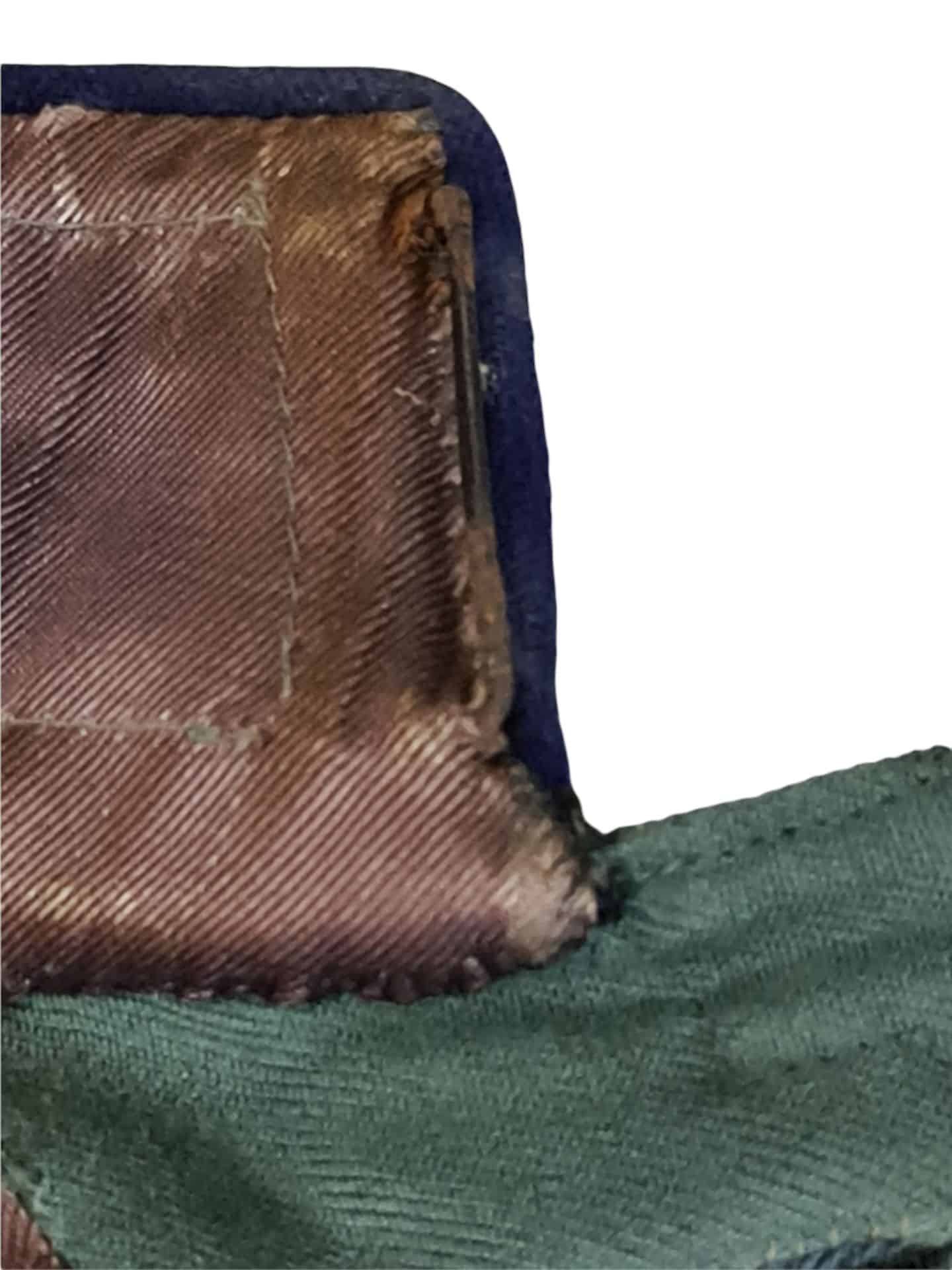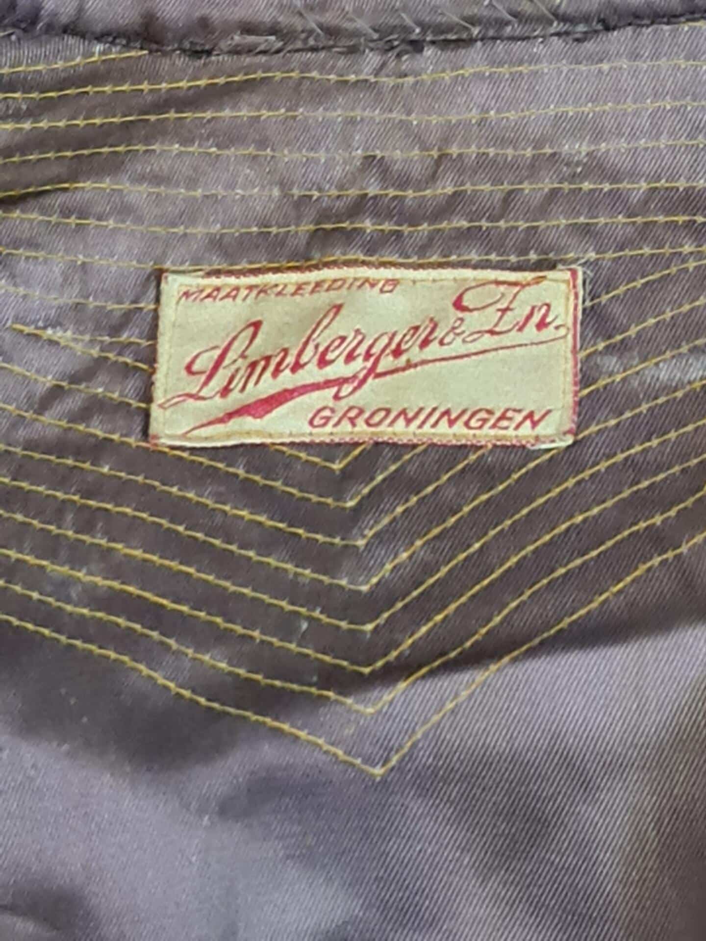 Veldgrijs buitenmodel uniformjas van een 1e luitenant dienend bij de infanterie in het vooroorlogse Nederlandse leger. De jas ziet er van de voorkant netjes uit . Aan de achterzijde van de jas zitten meer beschadigingen. De jas is netjes gelabeld met een kleermakers label van Limberger en zoon Groningen, een niet veel voorkomende kleermaker. De jas is niet op naam. Op de kraag zitten de sterren die behoren tot de rang van een eerste luitenant.