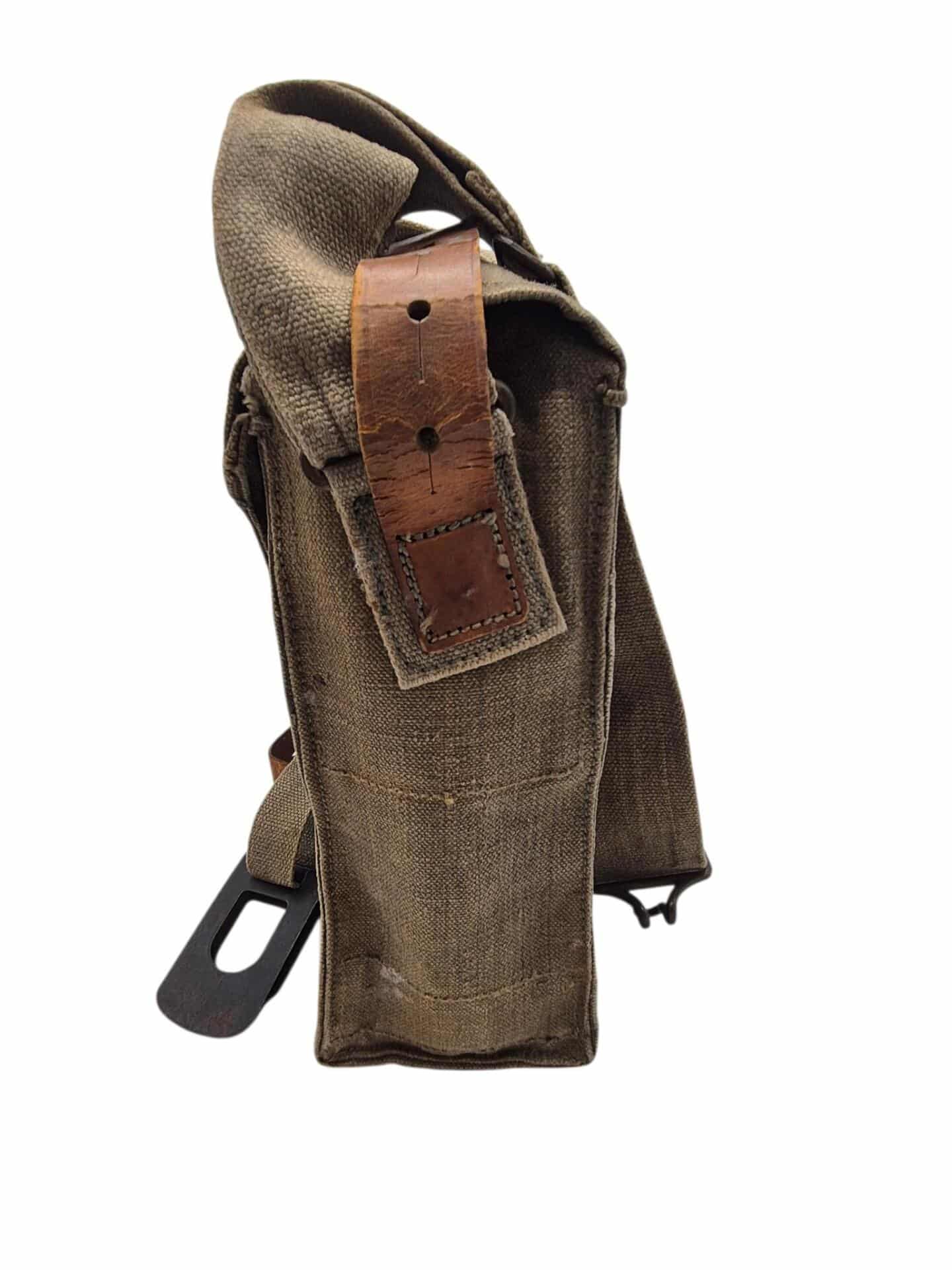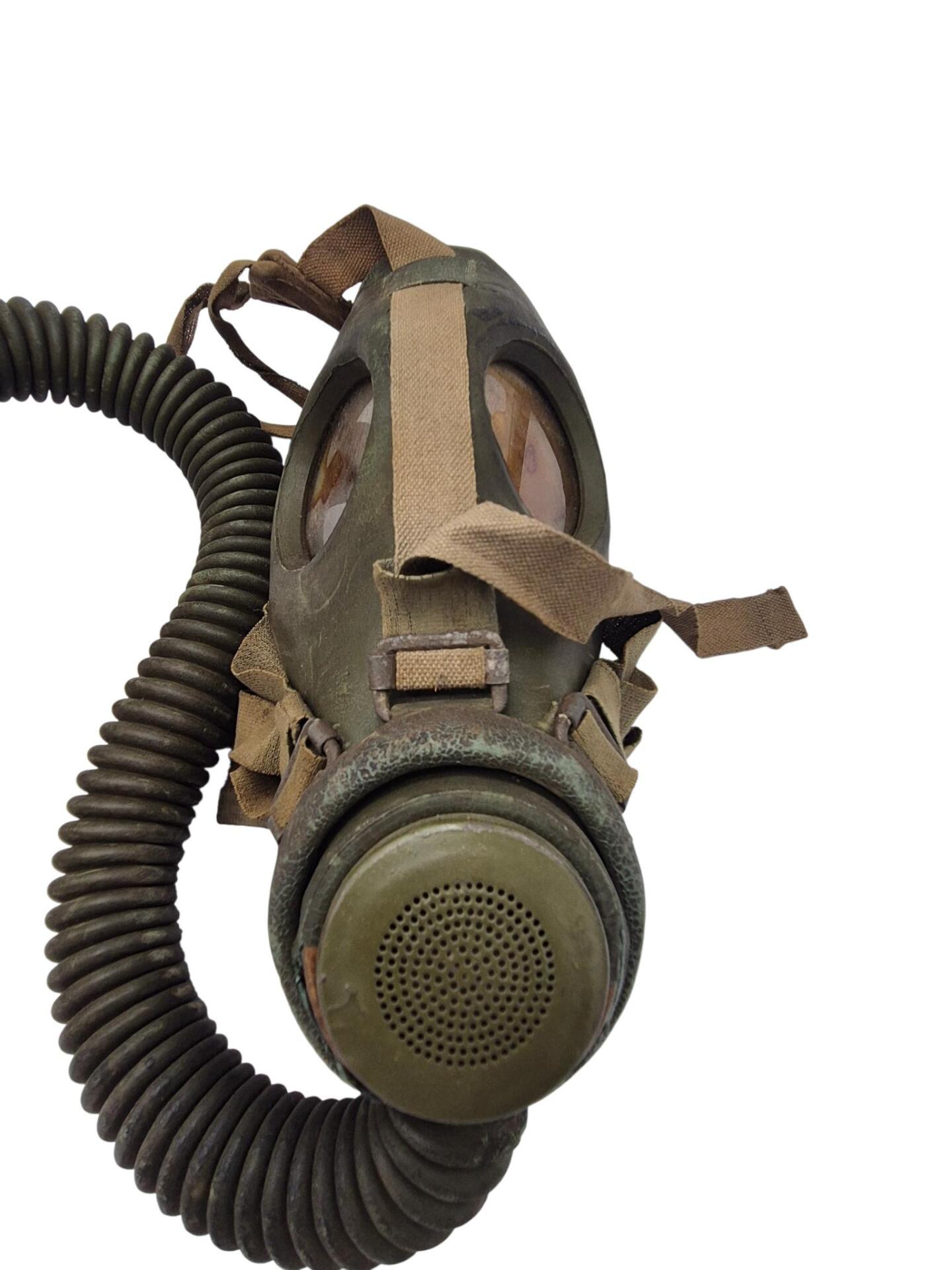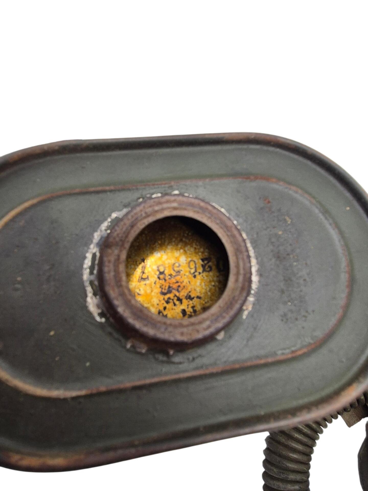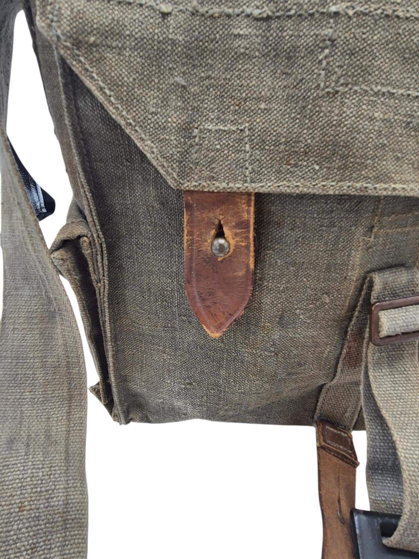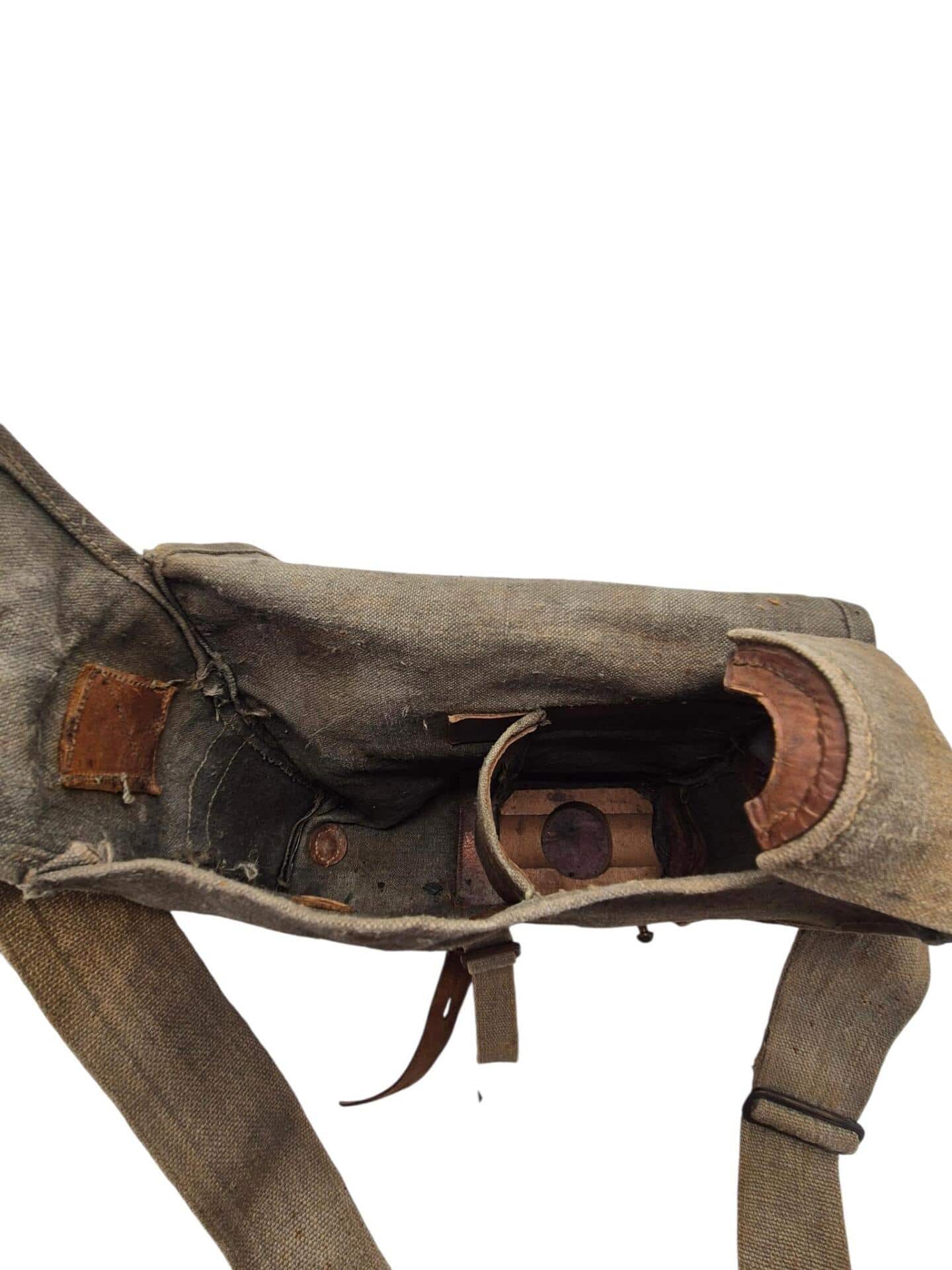 Vooroorlogse Nederlandse gasmaskertas met gasmasker model G voor onberedenen. De tas verkeerd in een nette staat en is gemarkeerd met de O voor onbereden troepen. De model G gasmasker tas is ook herkenbaar aan de metalen clip. Deze wordt op de manschappen koppel geschoven zodat de tas vast hangt. Het leerwerk is allemaal nog zeer soepel en mooi lichtbruin. Het gasmasker en de filterbus verkeren beide nog in een gedragen staat, rond het ventiel is het rubber uitgehard en fragiel, de slang is verder nog in een goede conditie. Mooie vooroorlogse Nederlandse gasmaskertas voor onbereden troepen!