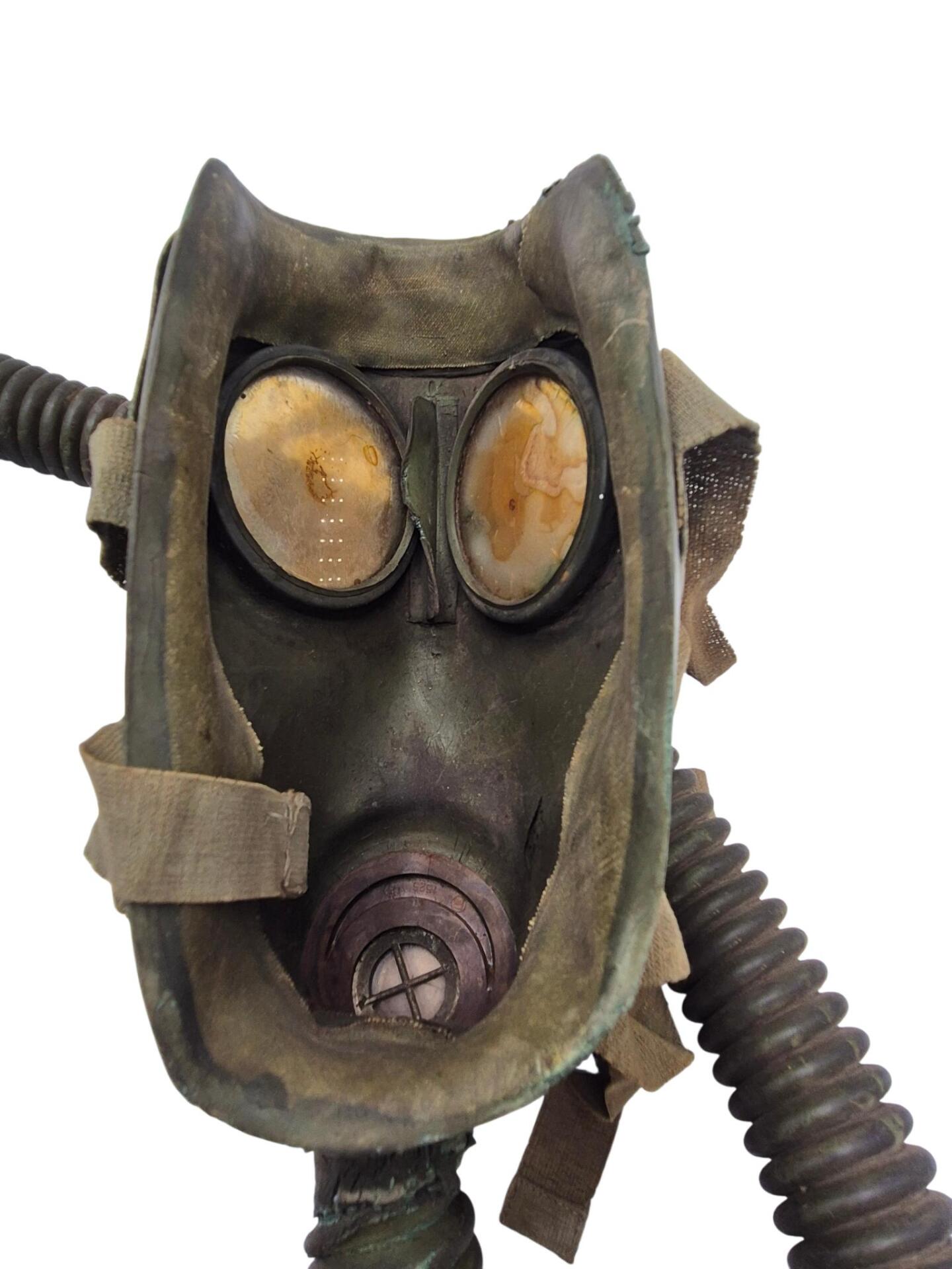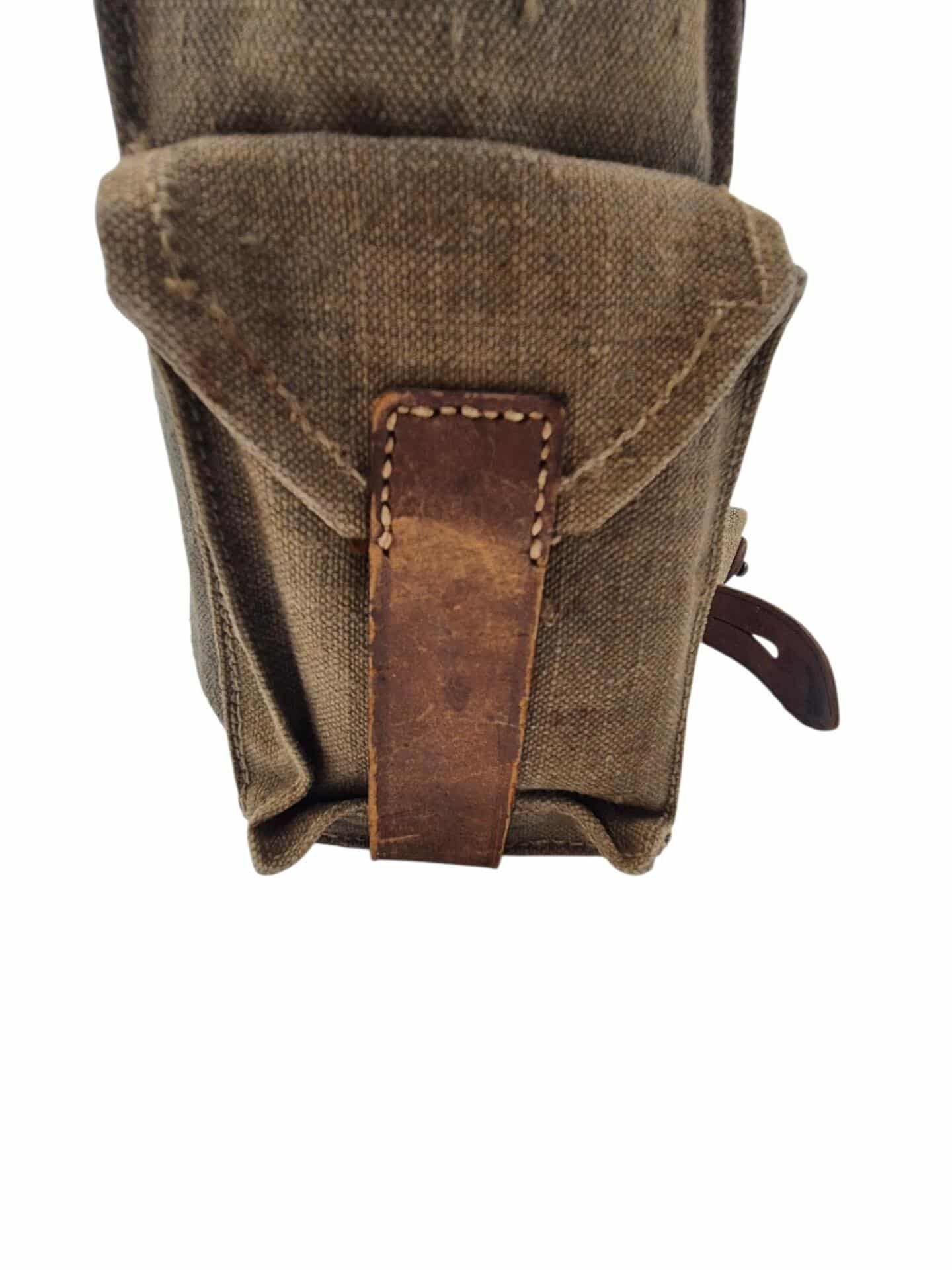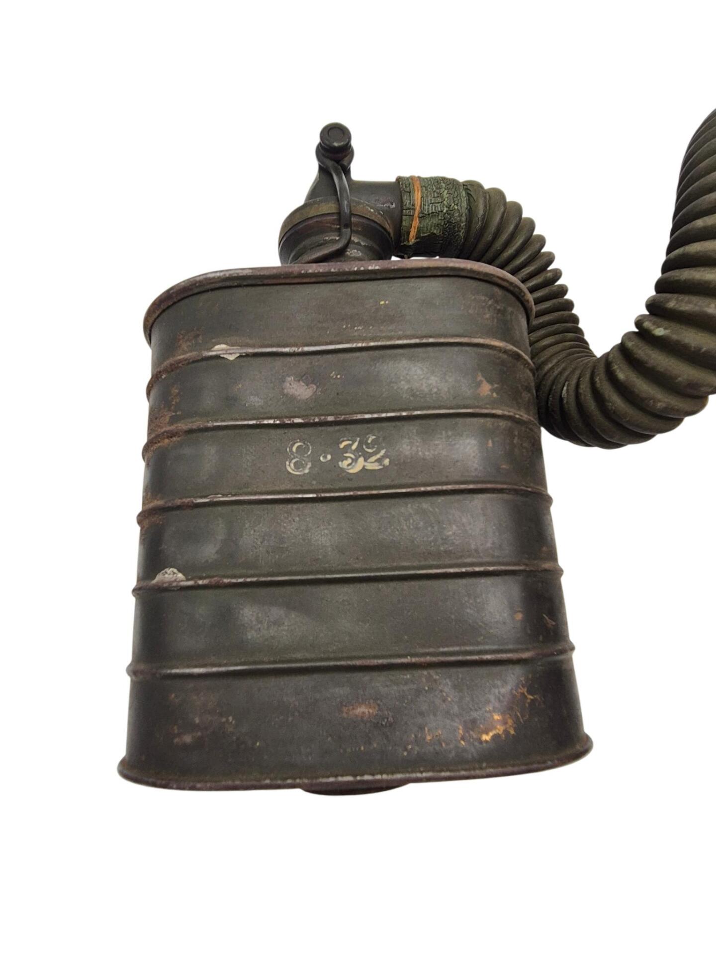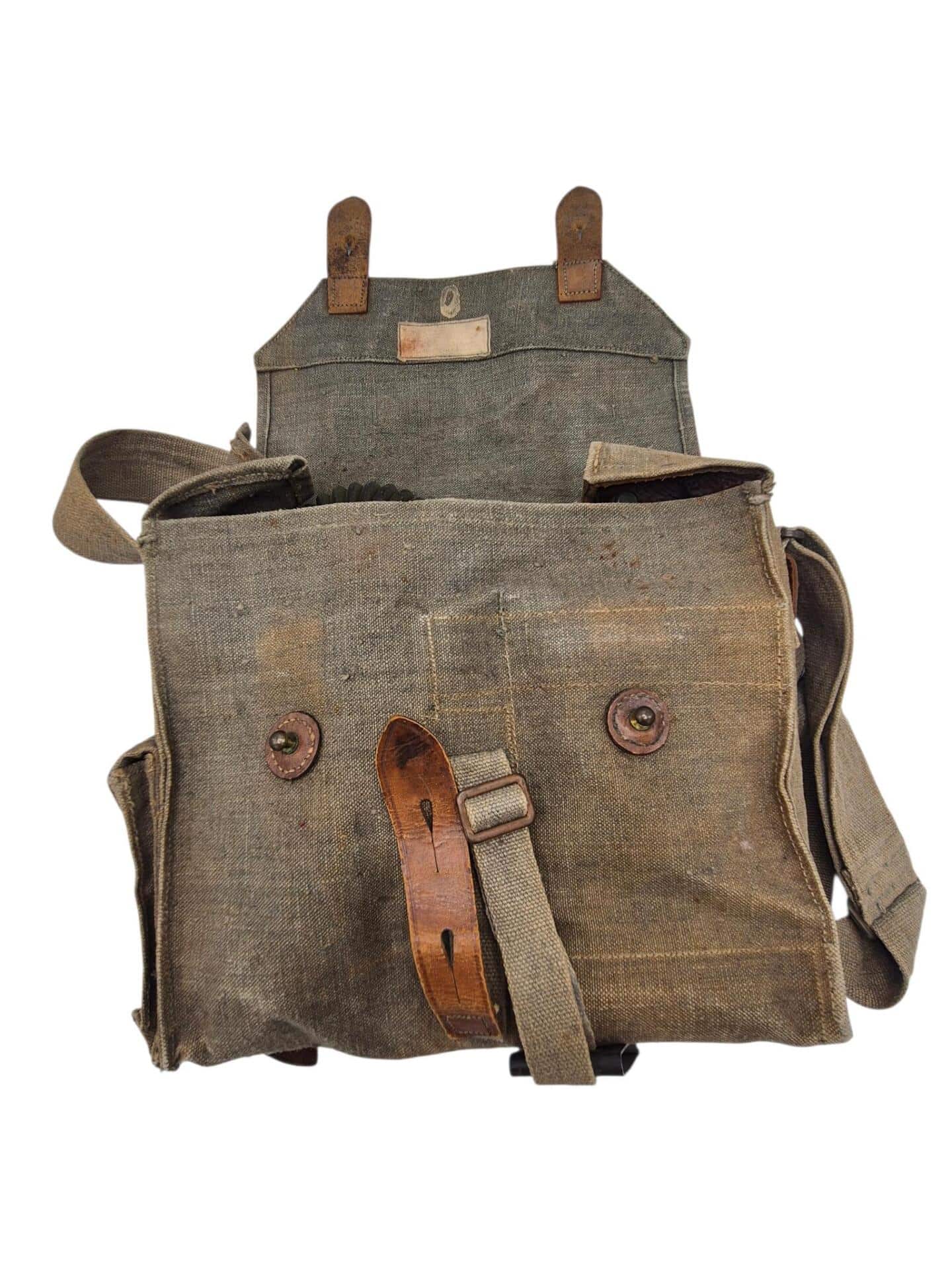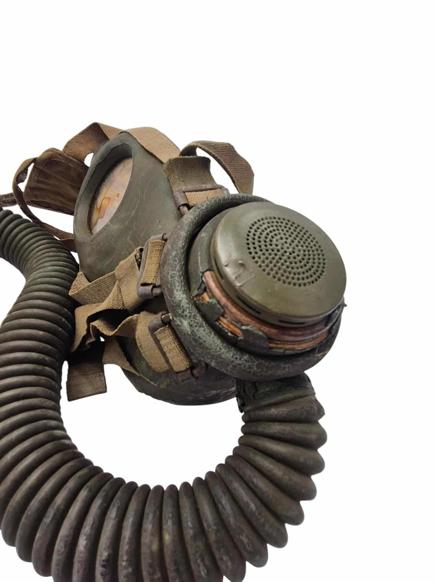 Vooroorlogse Nederlandse gasmaskertas met gasmasker model G voor onberedenen. De tas verkeerd in een nette staat en is gemarkeerd met de O voor onbereden troepen. De model G gasmasker tas is ook herkenbaar aan de metalen clip. Deze wordt op de manschappen koppel geschoven zodat de tas vast hangt. Het leerwerk is allemaal nog zeer soepel en mooi lichtbruin. Het gasmasker en de filterbus verkeren beide nog in een gedragen staat, rond het ventiel is het rubber uitgehard en fragiel, de slang is verder nog in een goede conditie. Mooie vooroorlogse Nederlandse gasmaskertas voor onbereden troepen!