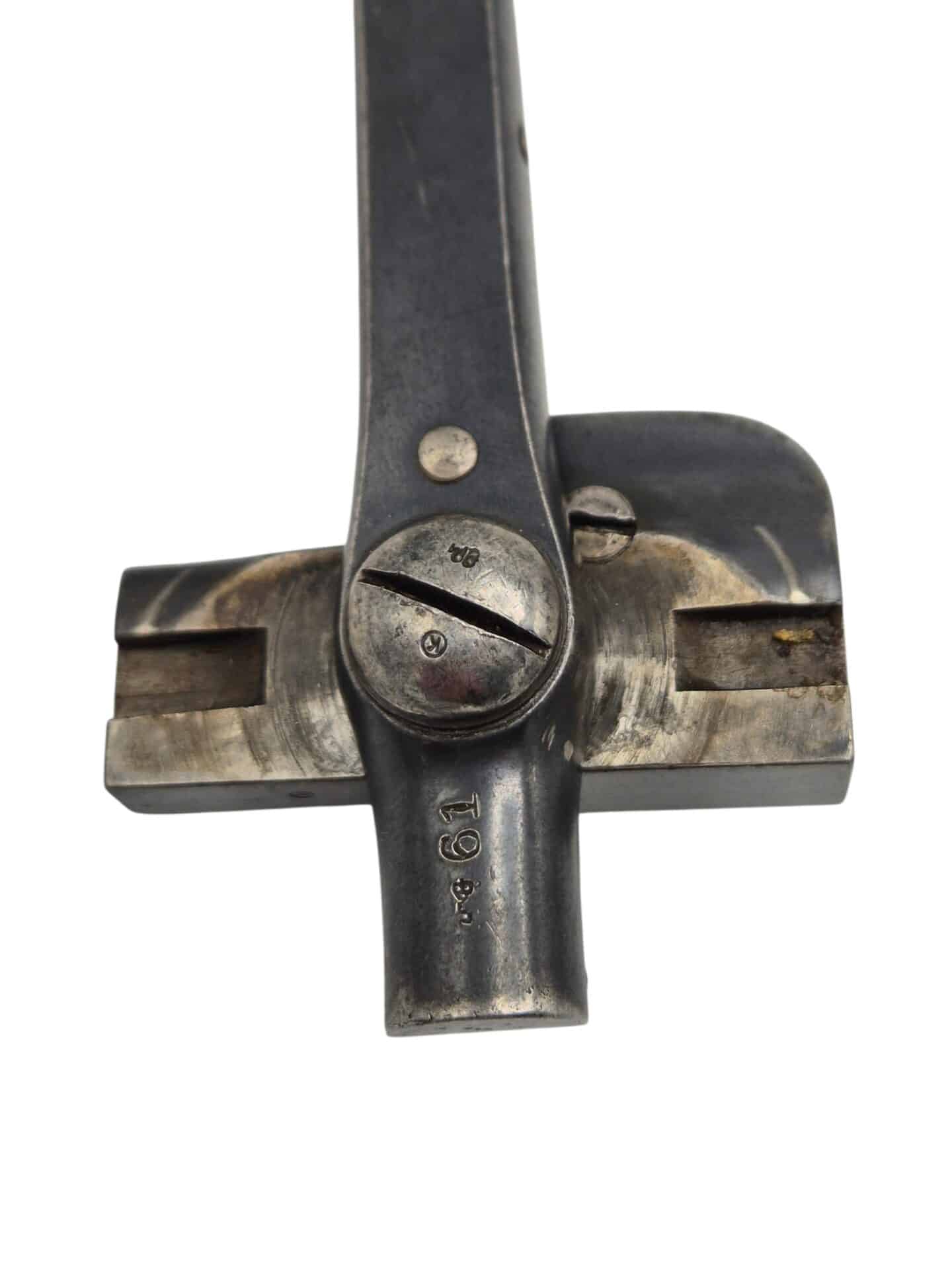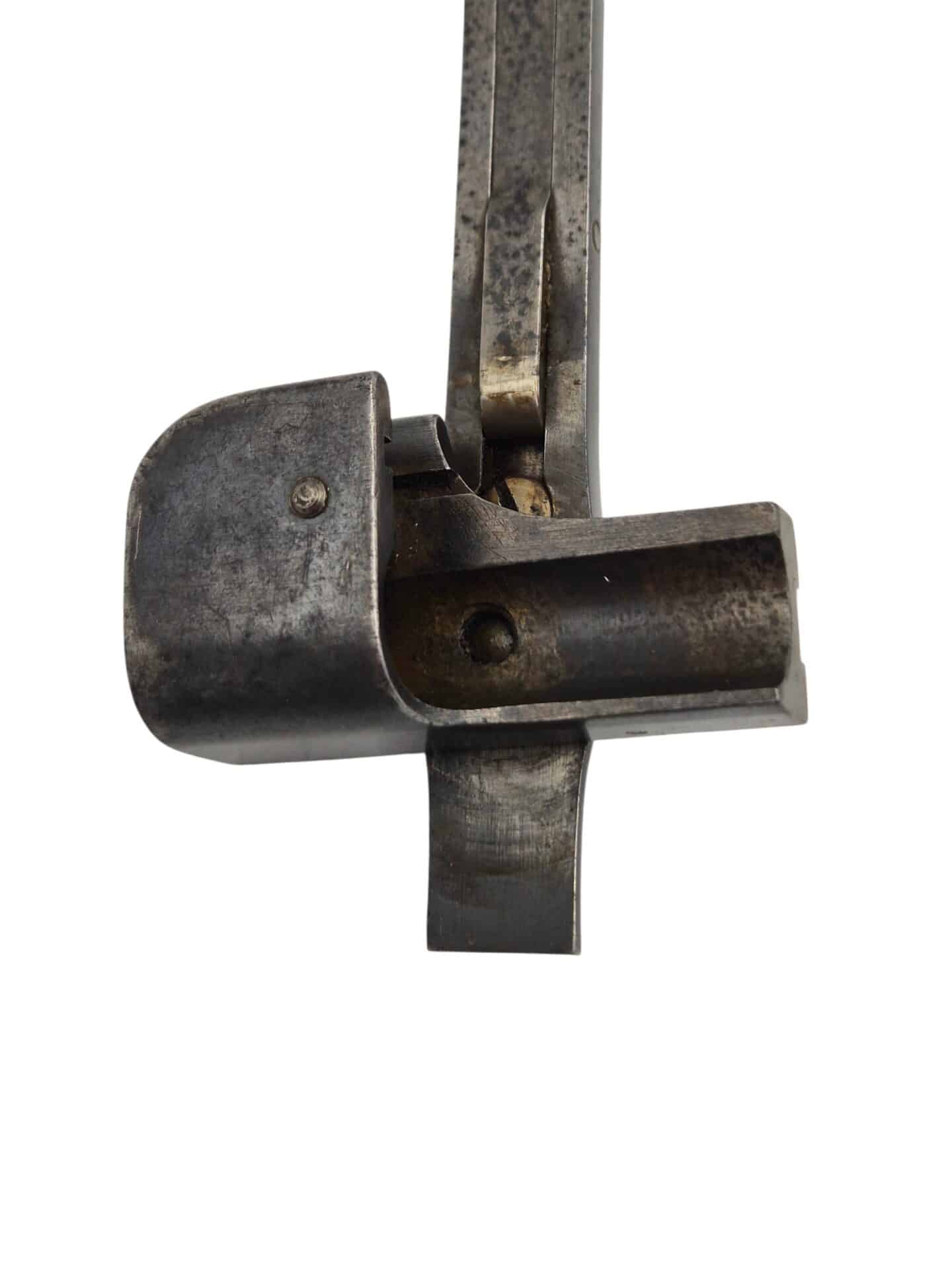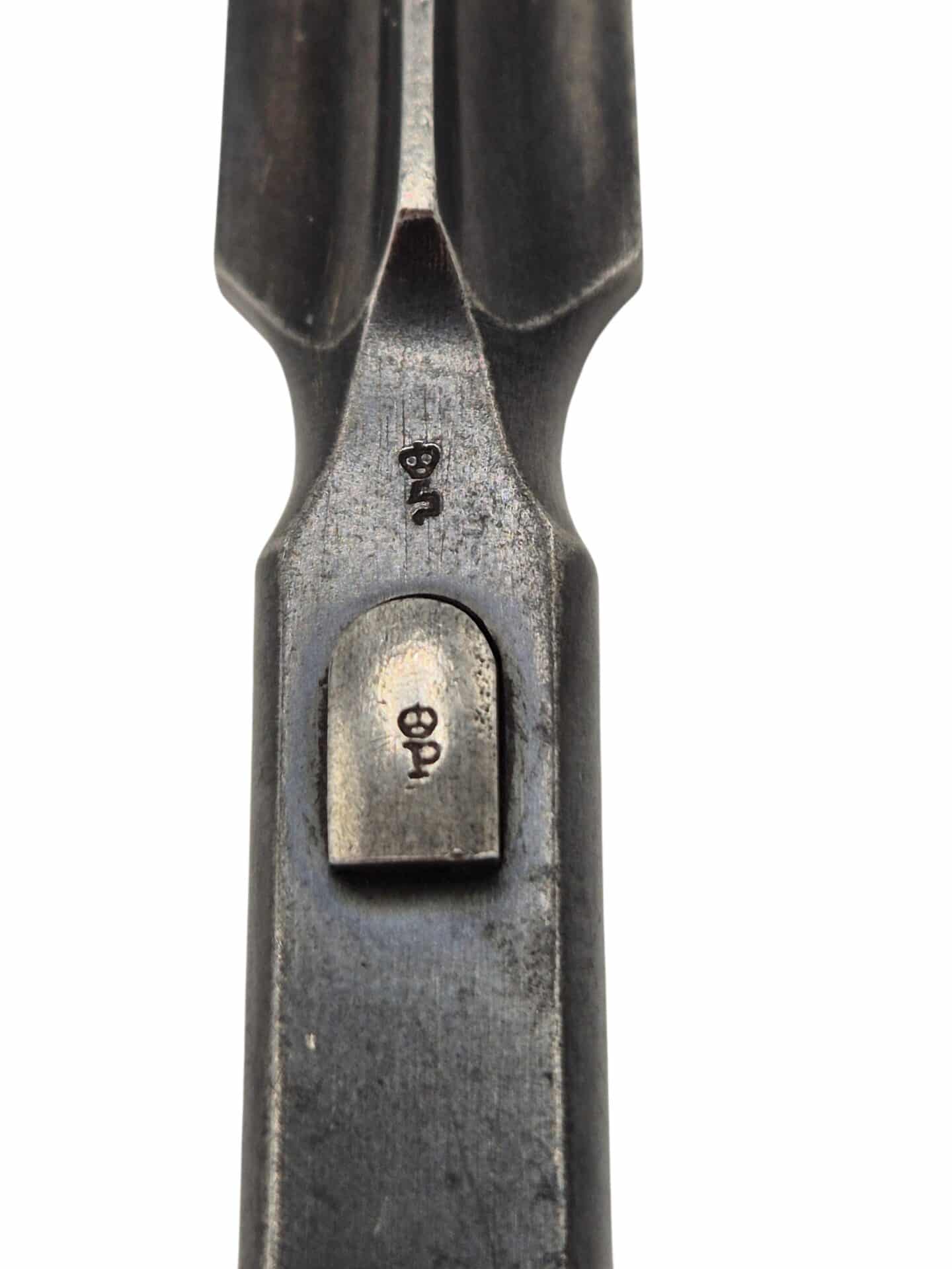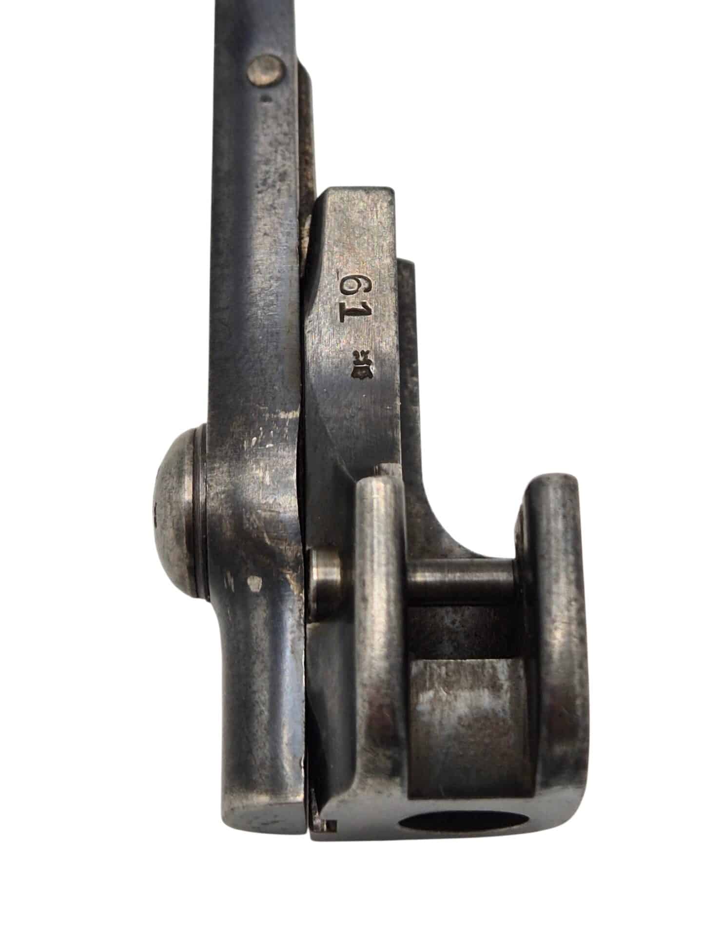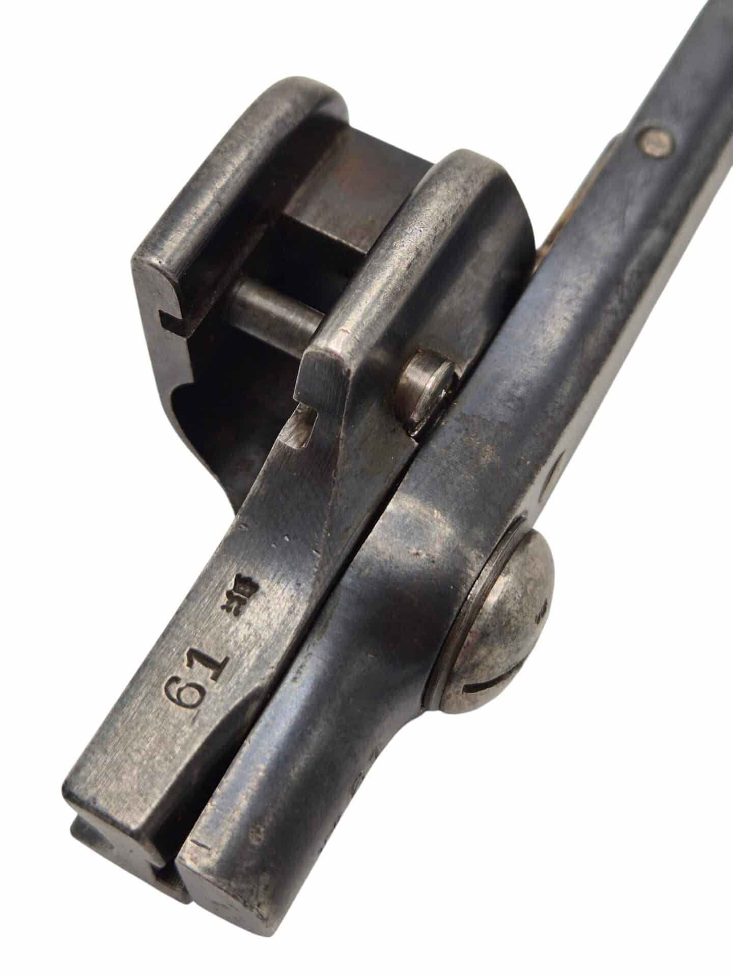 Klapbajonet voor de m95 marechaussee karabijn. Deze karabijn had in de kolf een speciale uitsparing voor de bajonet. Deze bajonet was een opvolger van de standaard M95 bajonet. De karabijn werd met een verbindings ´blok´ gemonteerd aan de voorzijde van de loop. Het lemmet is gekeurd gekroonde P en voorzien van wapennummer  61. Alle onderdelen  zijn mooi nummer gelijk en ook keur gelijk  De blauwing van de bajonet is nog volledig intact. Hele lichte oxidatie aan de binnenzijde van het lemmet.  Mooi weinig gebruikt en zeer zeldzaam exemplaar van een klapbajonet voor de M95 marechaussee karabijn.