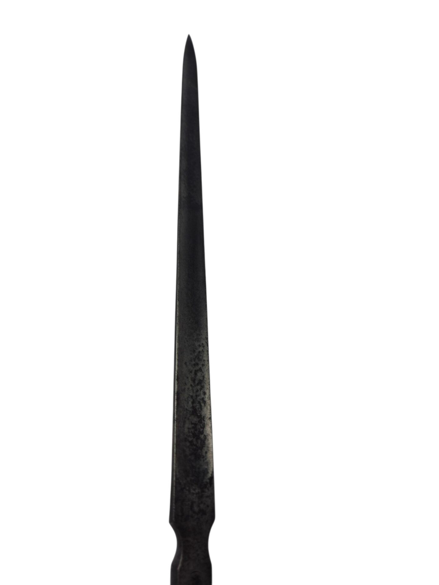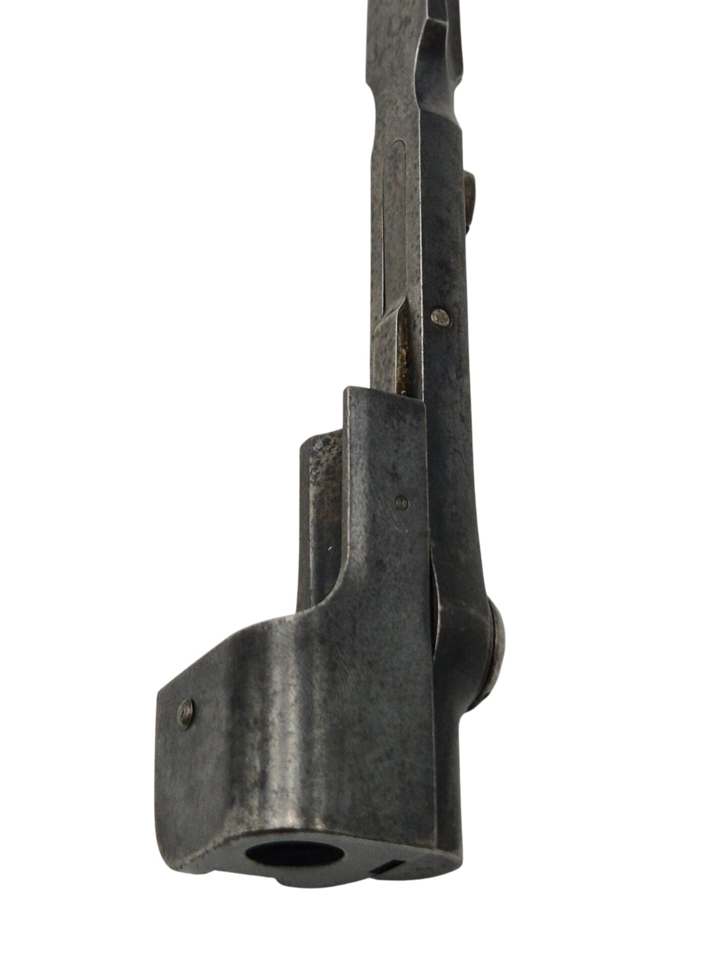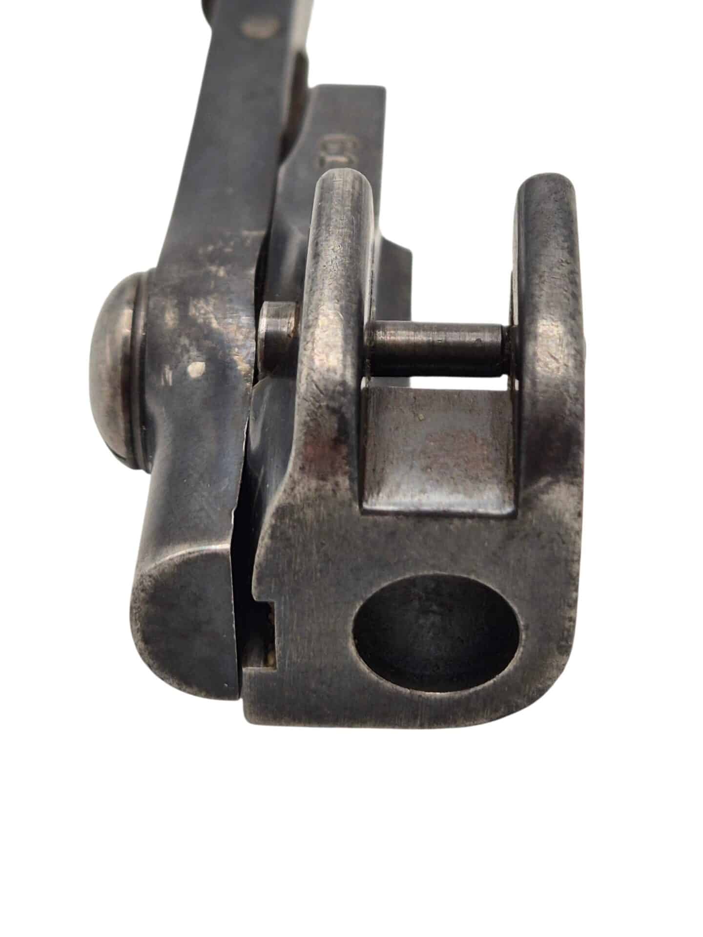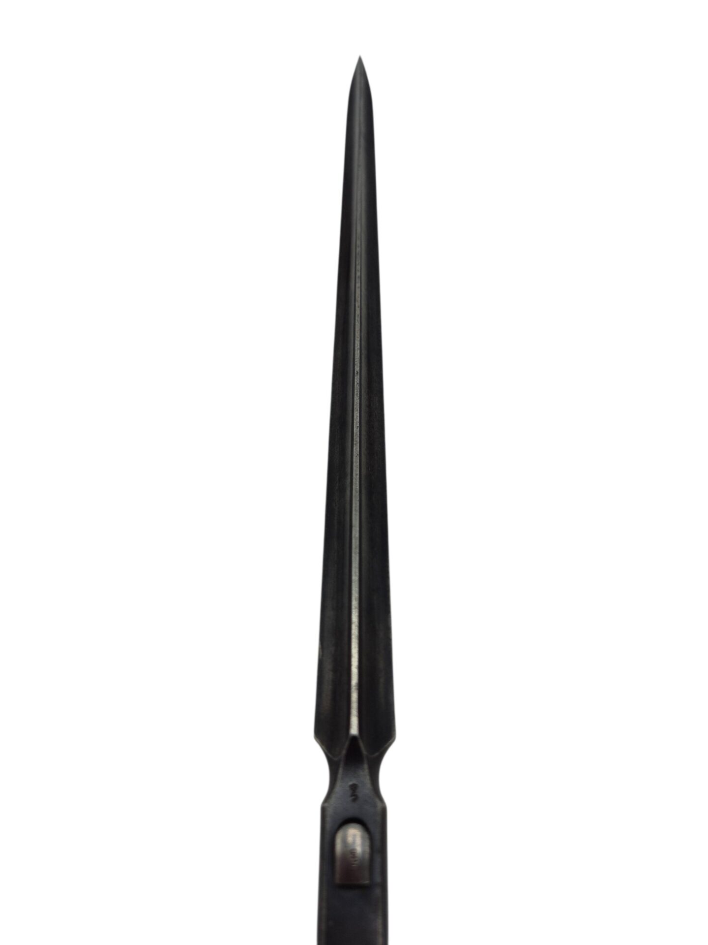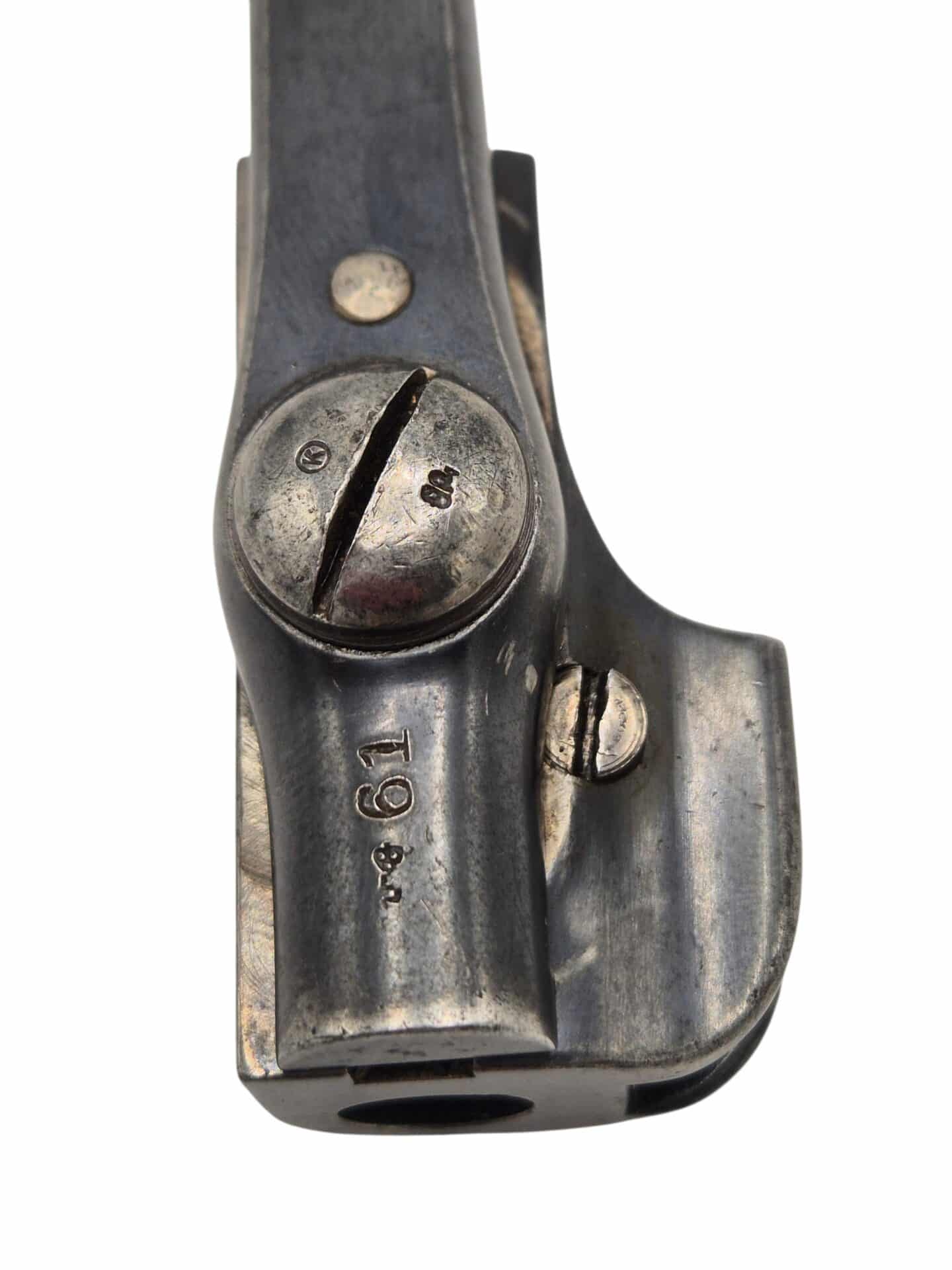 Klapbajonet voor de m95 marechaussee karabijn. Deze karabijn had in de kolf een speciale uitsparing voor de bajonet. Deze bajonet was een opvolger van de standaard M95 bajonet. De karabijn werd met een verbindings ´blok´ gemonteerd aan de voorzijde van de loop. Het lemmet is gekeurd gekroonde P en voorzien van wapennummer  61. Alle onderdelen  zijn mooi nummer gelijk en ook keur gelijk  De blauwing van de bajonet is nog volledig intact. Hele lichte oxidatie aan de binnenzijde van het lemmet.  Mooi weinig gebruikt en zeer zeldzaam exemplaar van een klapbajonet voor de M95 marechaussee karabijn.