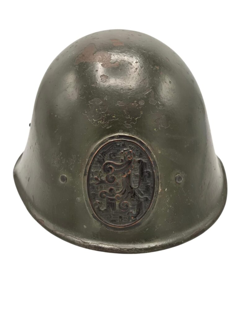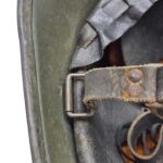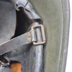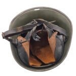 Mooie M27 helm. De helm is in een gedragen toestand maar de verf is wel grotendeels intact. Het binnenwerk is gemaakt door de firma DP De Booy en is ook CM1933 gestempeld. In de bol van de helm is de stempel ook duidelijk zichtbaar. De helmplaat is nog voorzien van de originele zwarte afwerking. De kin riem is volle lengte en soepel. De 3 vilten flappen zijn nog aanwezig en in een goede conditie. Het lijkt erop dat de sleuf aan de achterzijde niet mooi in het midden is geplaatst wat uitzonderlijk is.