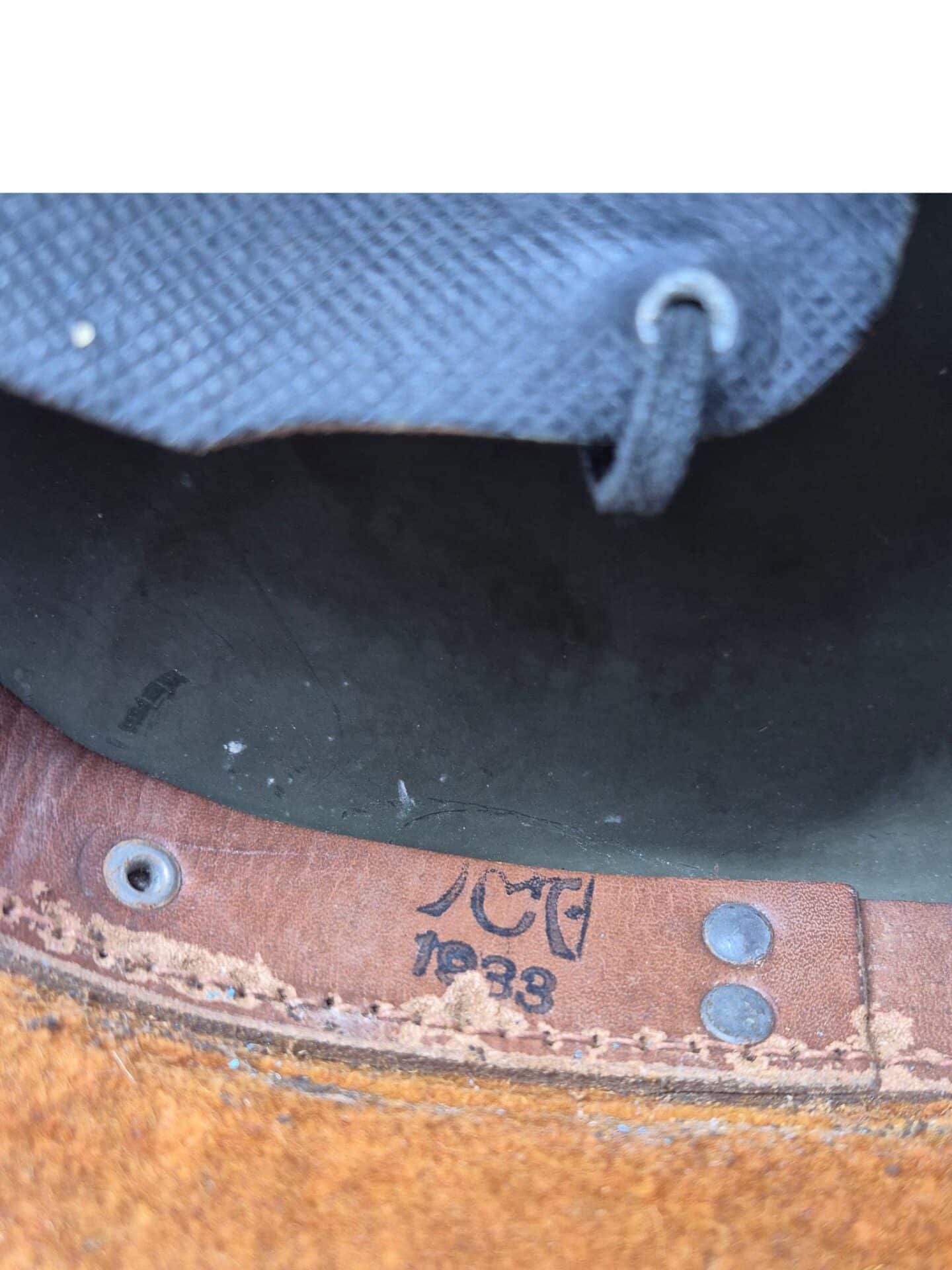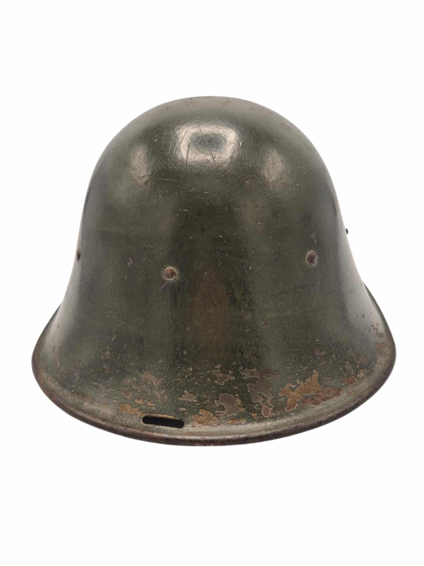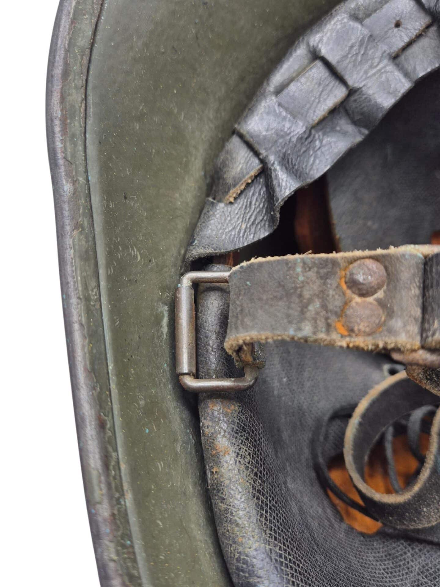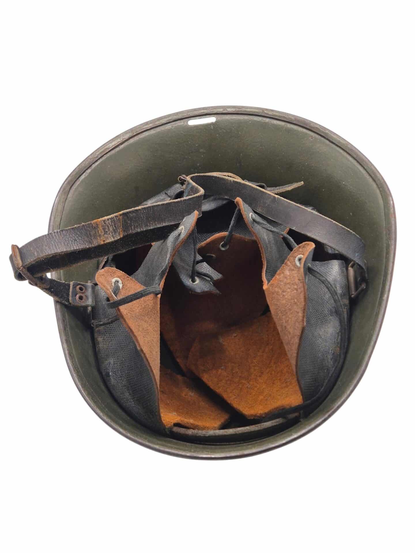 Mooie M27 helm. De helm is in een gedragen toestand maar de verf is wel grotendeels intact. Het binnenwerk is gemaakt door de firma DP De Booy en is ook CM1933 gestempeld. In de bol van de helm is de stempel ook duidelijk zichtbaar. De helmplaat is nog voorzien van de originele zwarte afwerking. De kin riem is volle lengte en soepel. De 3 vilten flappen zijn nog aanwezig en in een goede conditie. Het lijkt erop dat de sleuf aan de achterzijde niet mooi in het midden is geplaatst wat uitzonderlijk is.