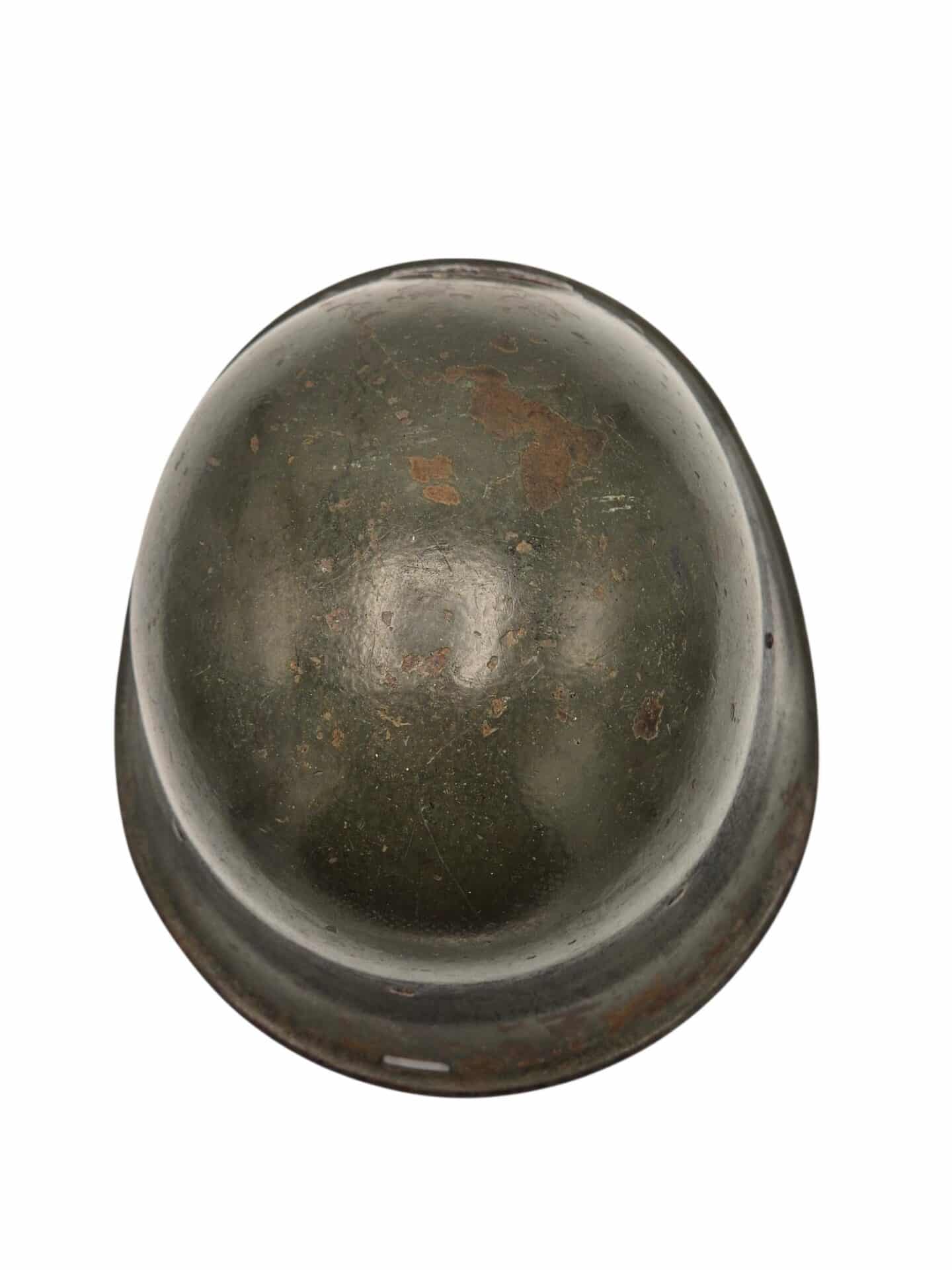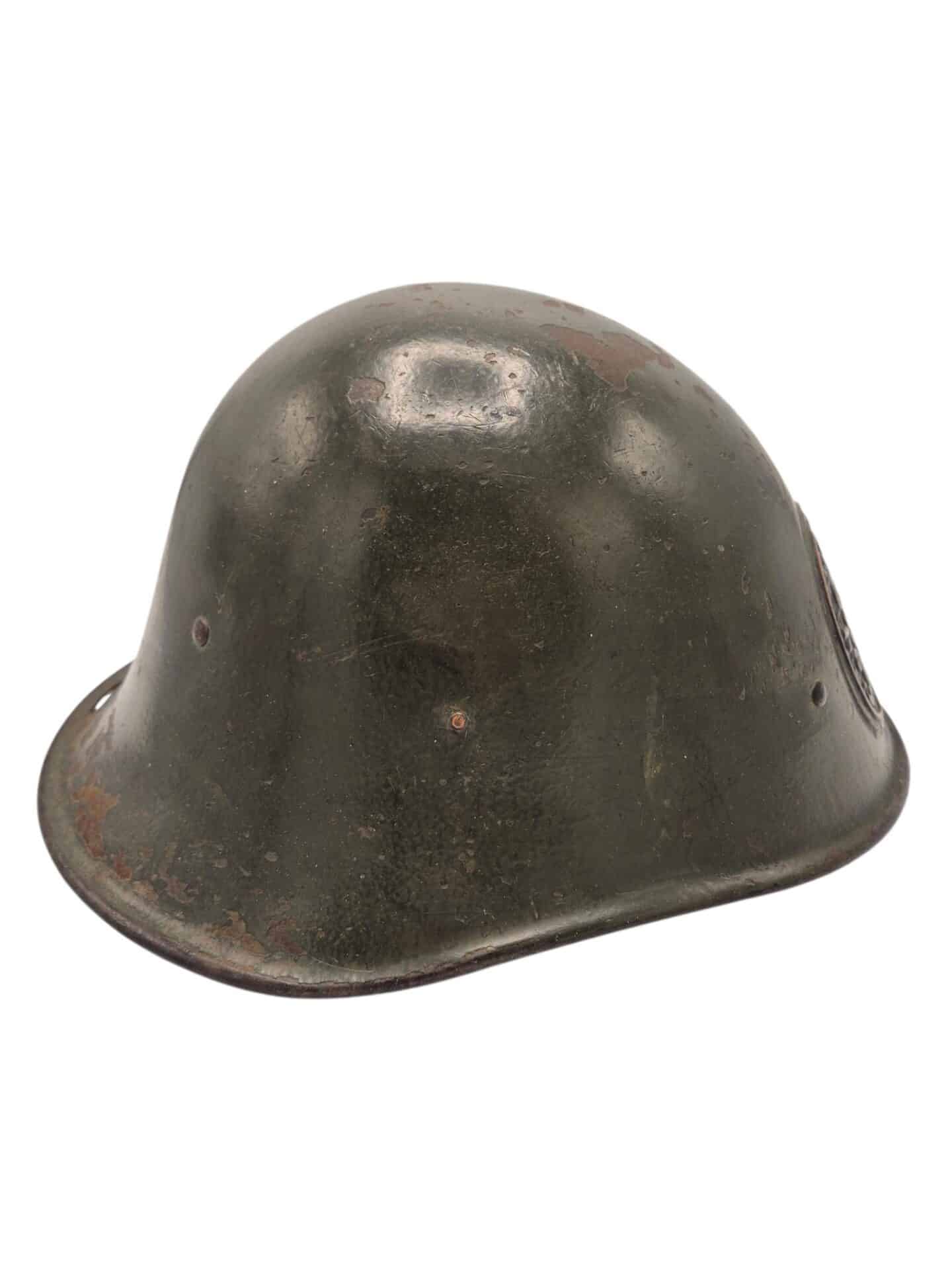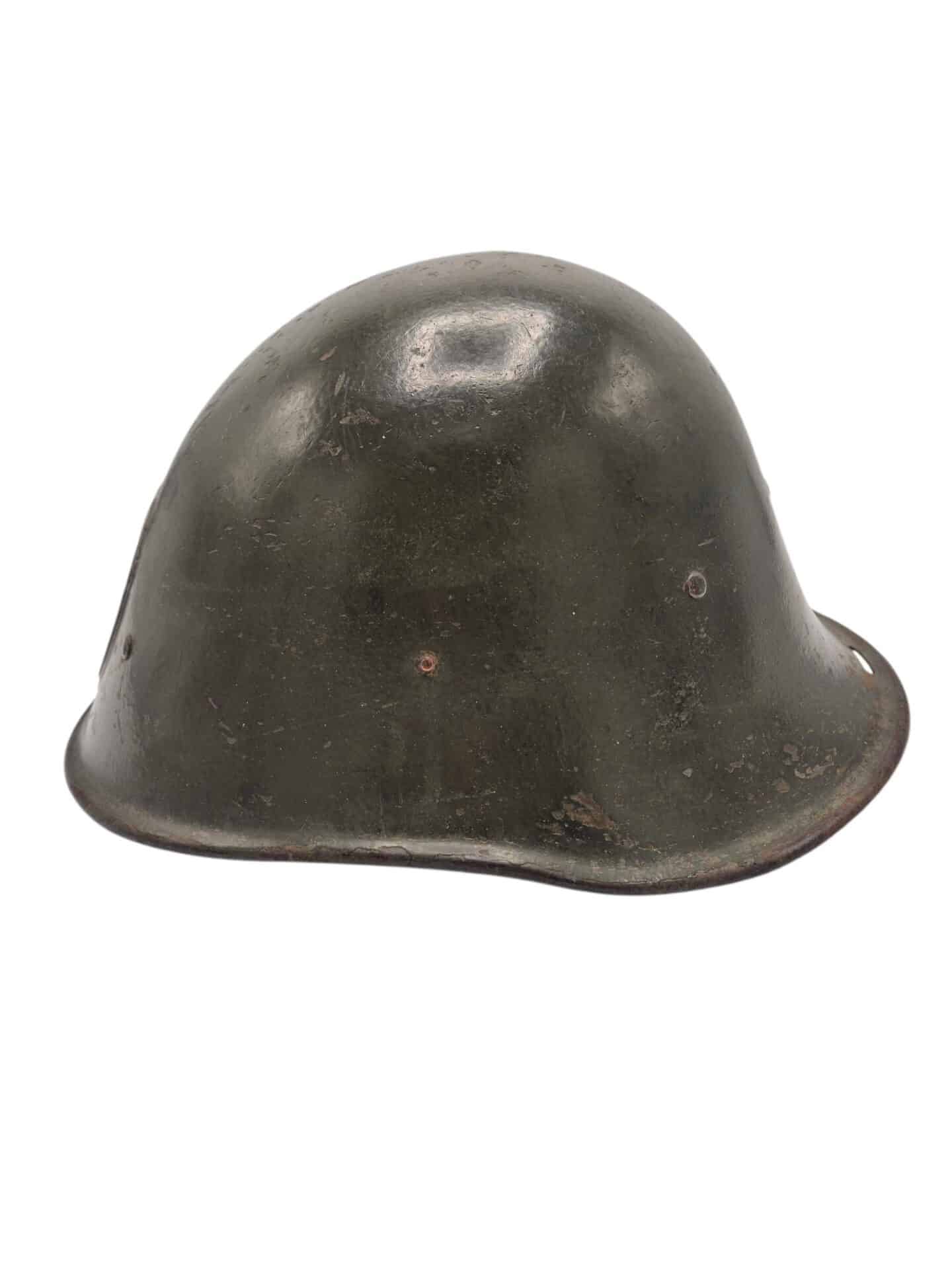 Mooie M27 helm. De helm is in een gedragen toestand maar de verf is wel grotendeels intact. Het binnenwerk is gemaakt door de firma DP De Booy en is ook CM1933 gestempeld. In de bol van de helm is de stempel ook duidelijk zichtbaar. De helmplaat is nog voorzien van de originele zwarte afwerking. De kin riem is volle lengte en soepel. De 3 vilten flappen zijn nog aanwezig en in een goede conditie. Het lijkt erop dat de sleuf aan de achterzijde niet mooi in het midden is geplaatst wat uitzonderlijk is.