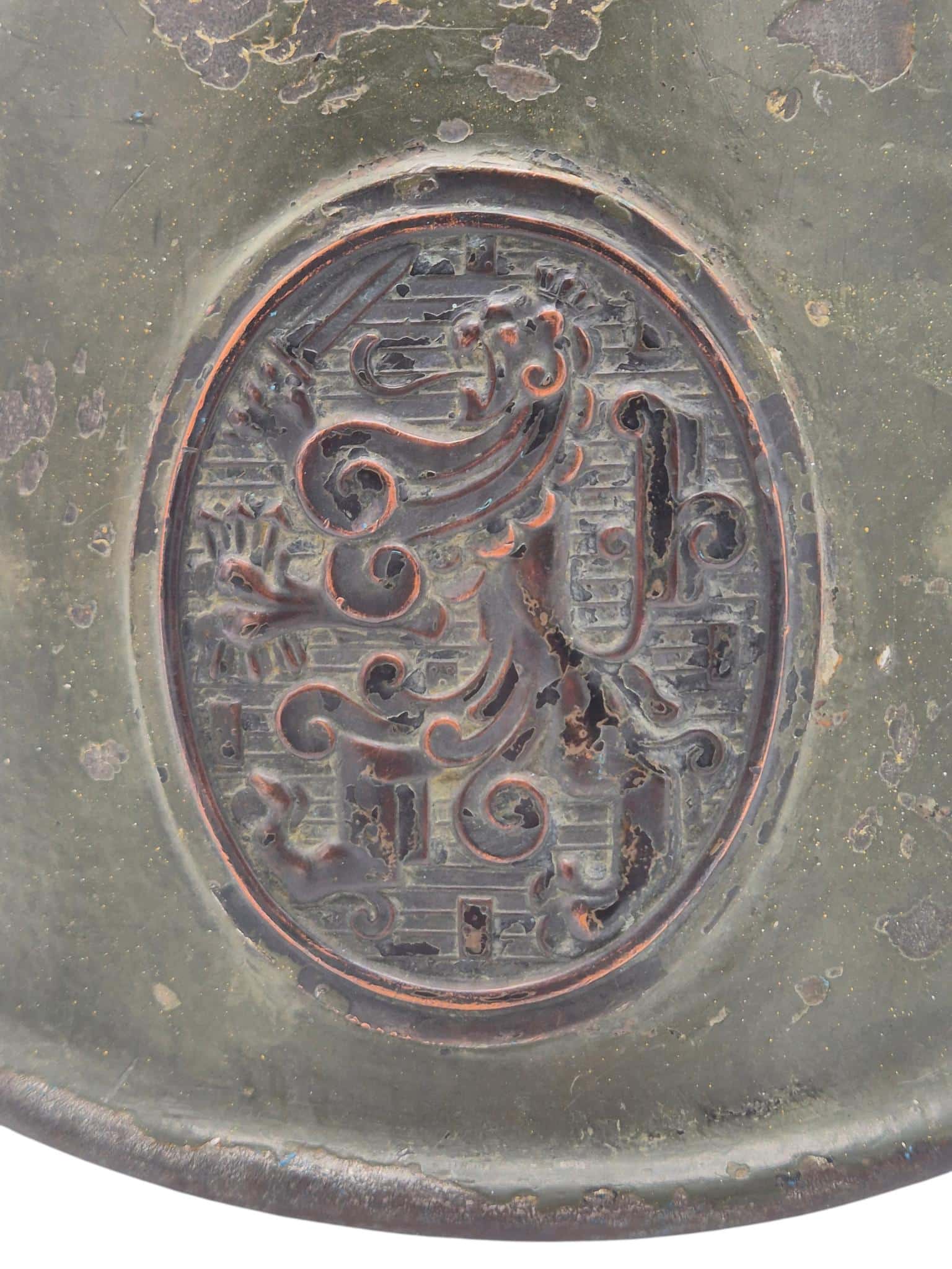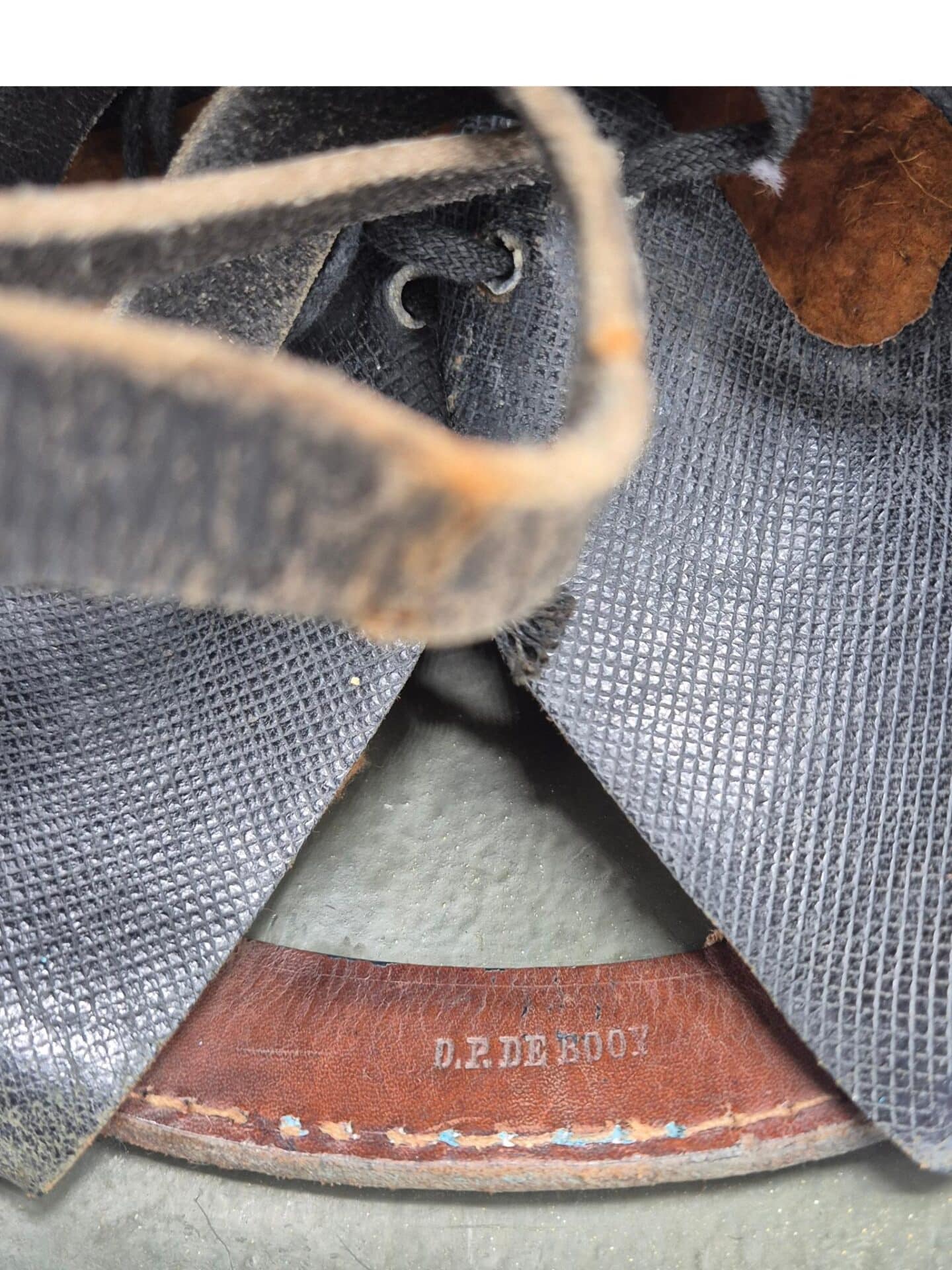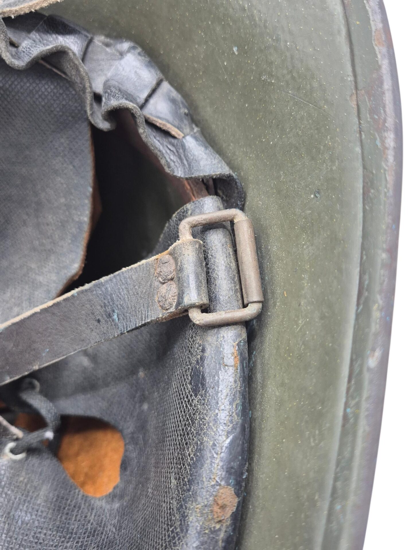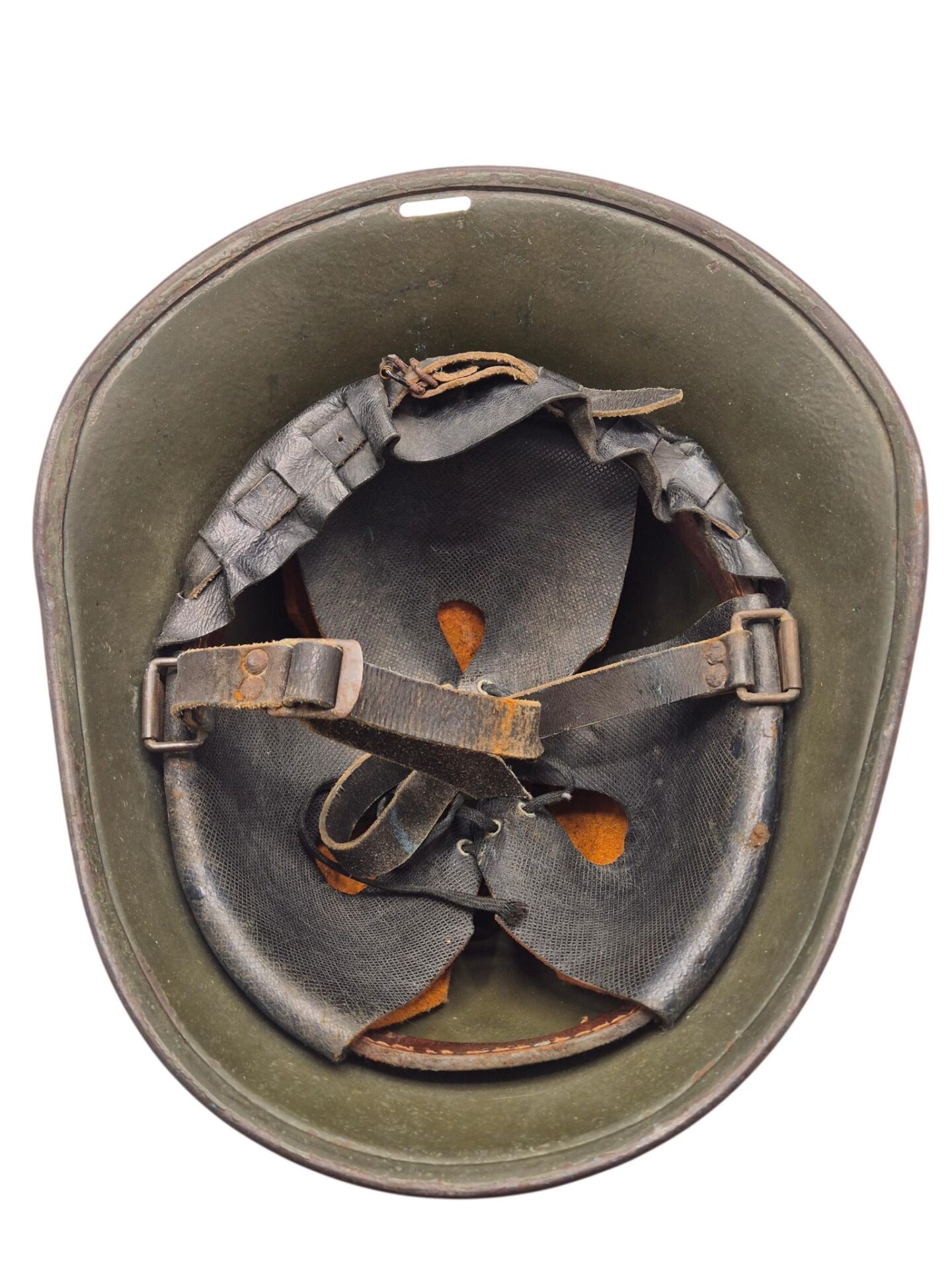 Mooie M27 helm. De helm is in een gedragen toestand maar de verf is wel grotendeels intact. Het binnenwerk is gemaakt door de firma DP De Booy en is ook CM1933 gestempeld. In de bol van de helm is de stempel ook duidelijk zichtbaar. De helmplaat is nog voorzien van de originele zwarte afwerking. De kin riem is volle lengte en soepel. De 3 vilten flappen zijn nog aanwezig en in een goede conditie. Het lijkt erop dat de sleuf aan de achterzijde niet mooi in het midden is geplaatst wat uitzonderlijk is.