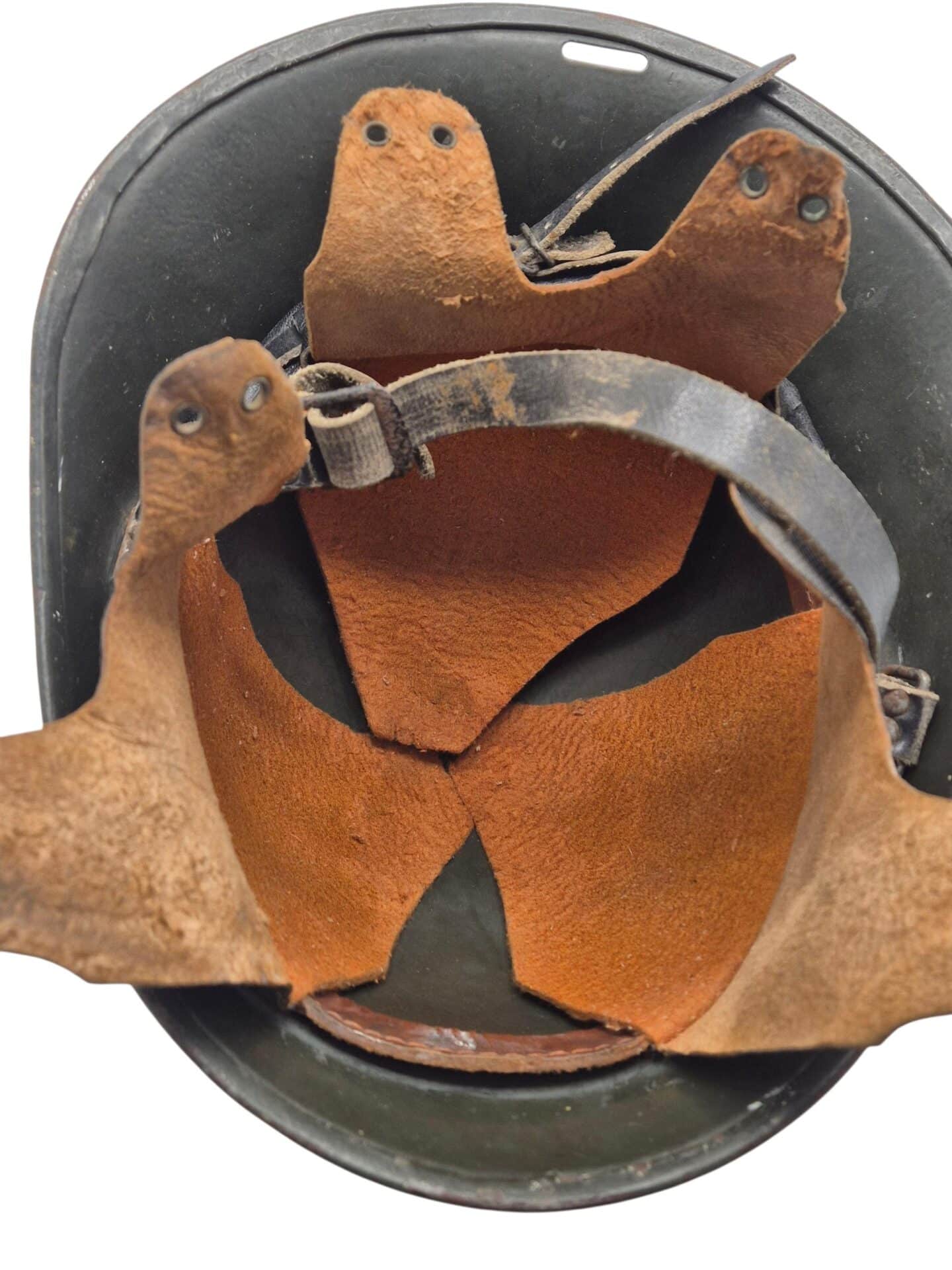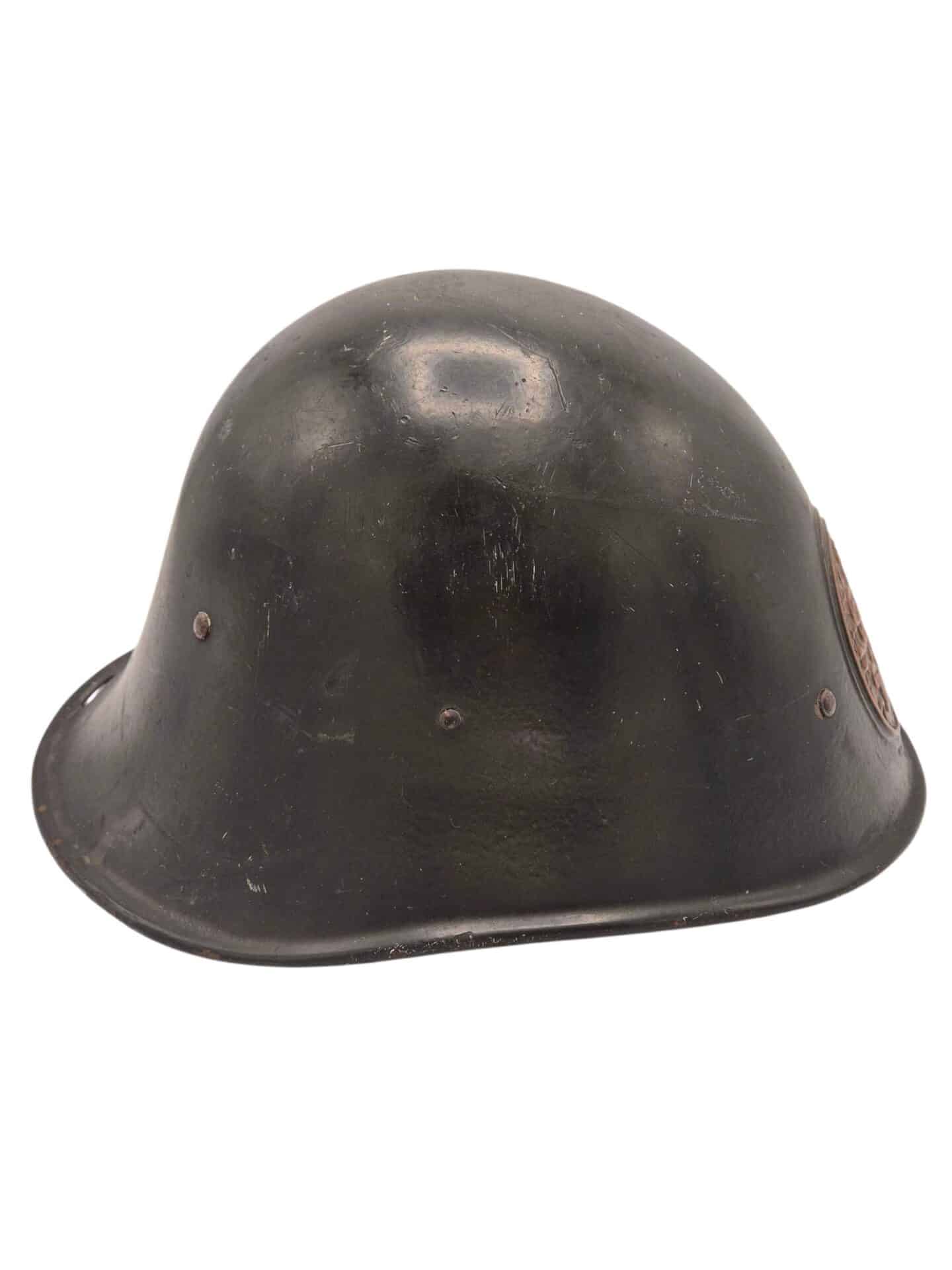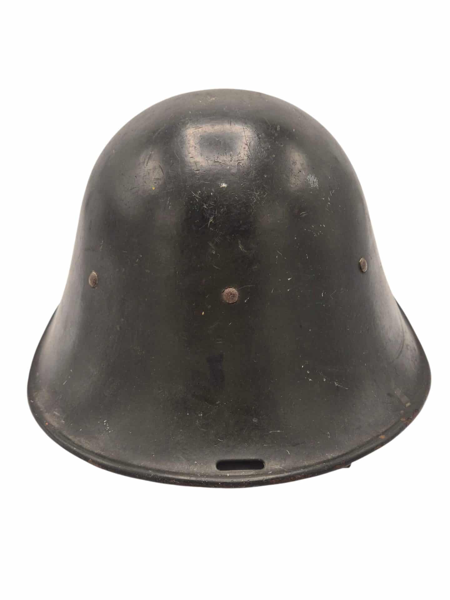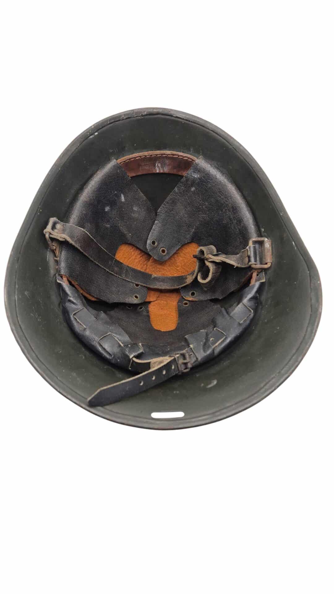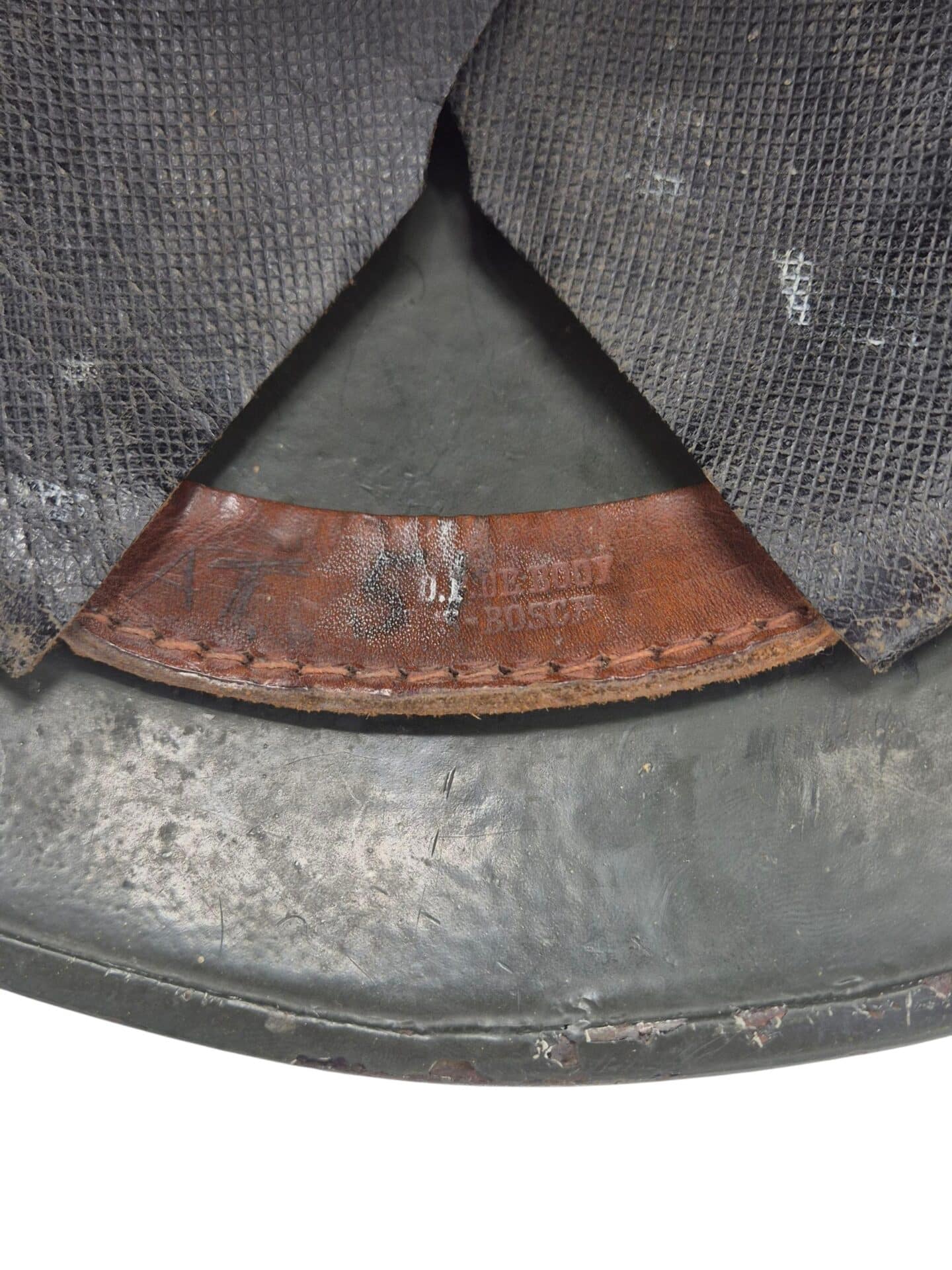 Prachtige M27 helm. De helm is nog het mooie vroege donkergroen en de verf is nog vrijwel gaaf wat bij deze modellen niet vaak voorkomt. De helmplaat is in een mooie conditie. De binnenzijde van de helm is ook nog in een zeer goede staat. De vilten flappen zijn alle 3 aanwezig en niet aangetast door motvraat. Het leer is ook nog mooi soepel. De kinriem is aanwezig. Het binnenwerk is aan de voorzijde door de maker gestanst D De Booij Den Bosch. De helm is niet voorzien van een CM stempel. Prachtige M27 helm met een bijzondere maker voor het binnenwerk.