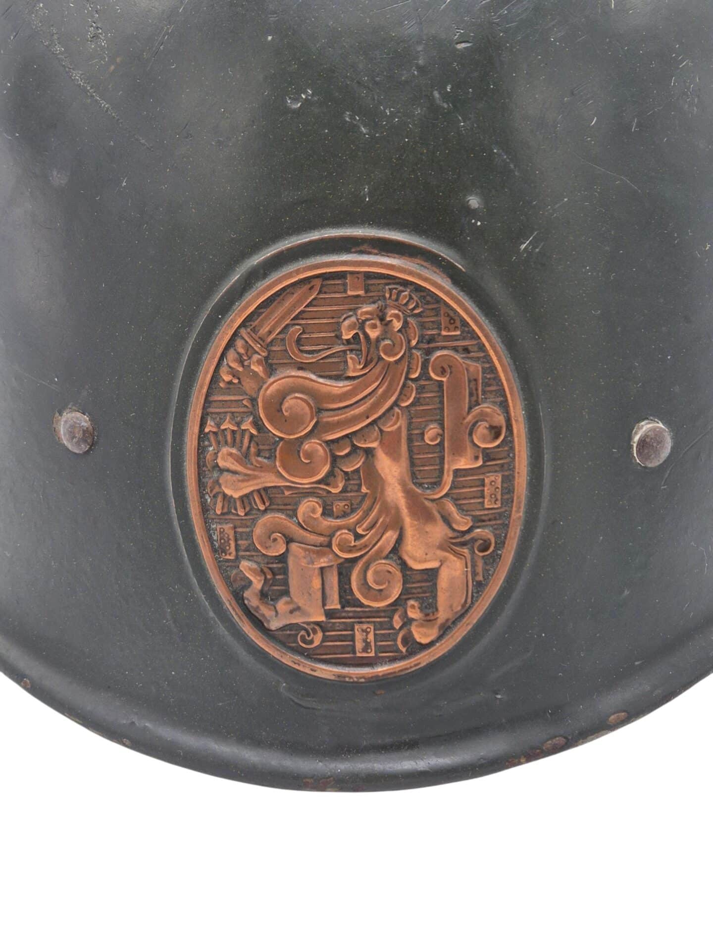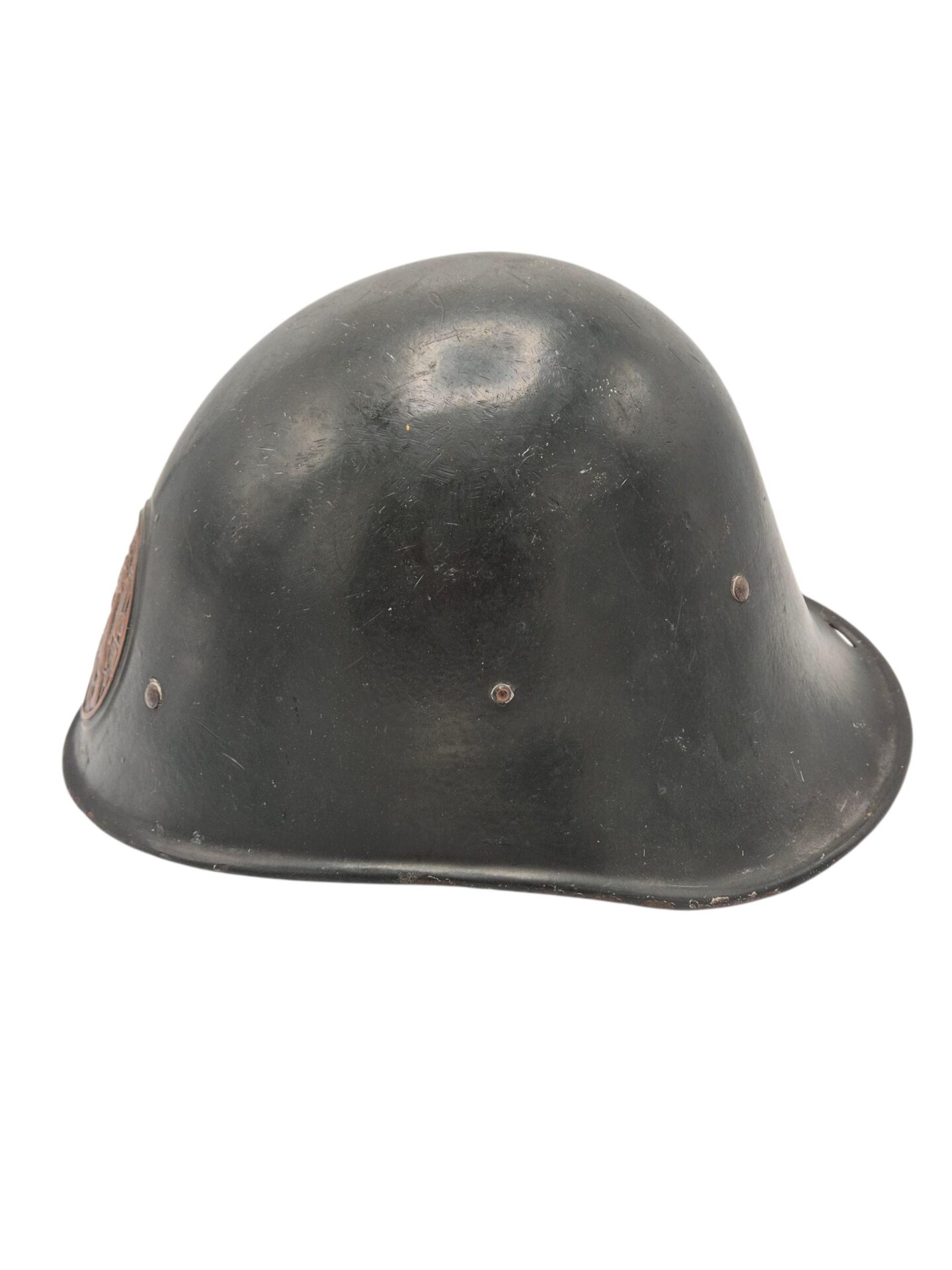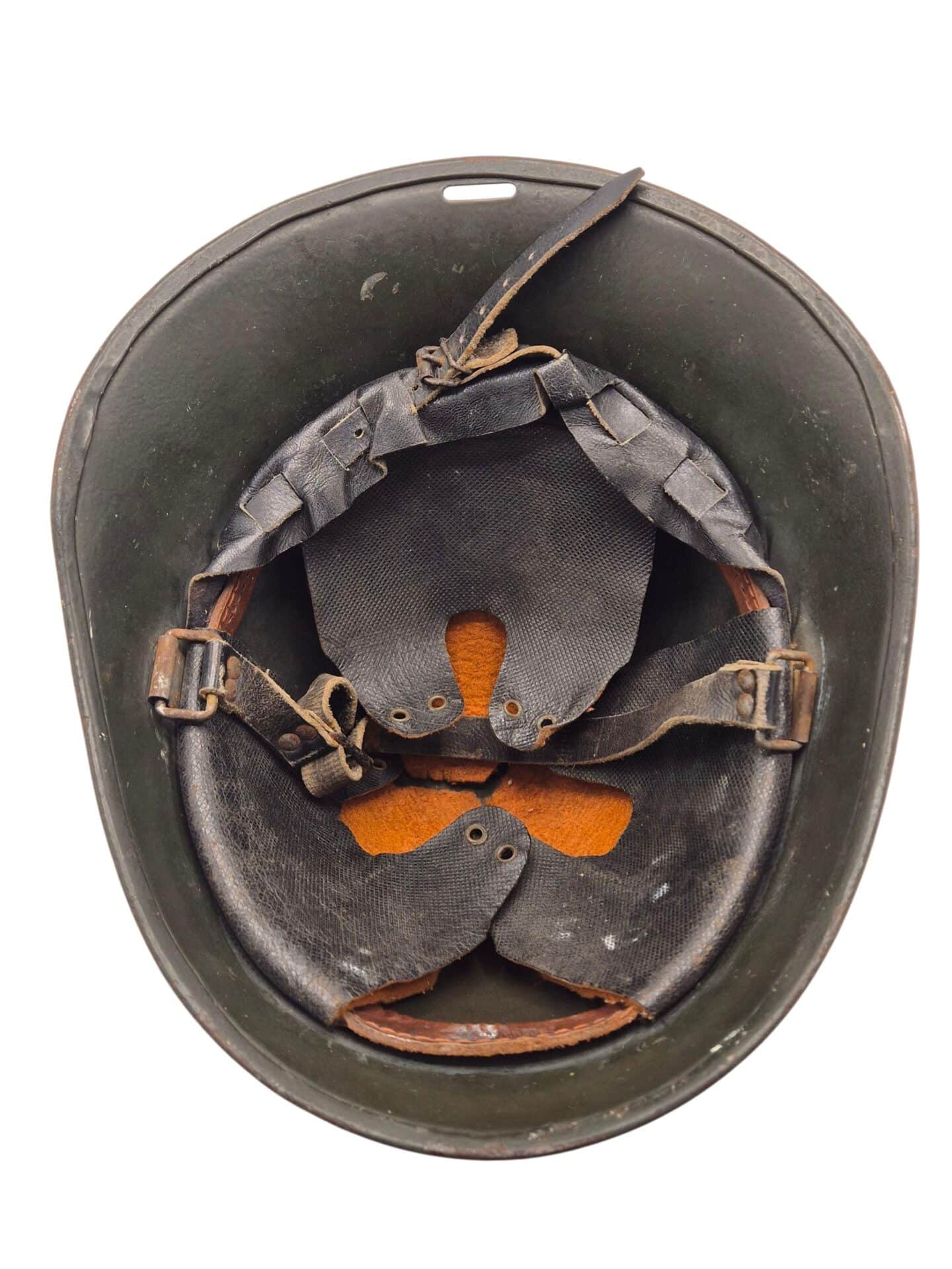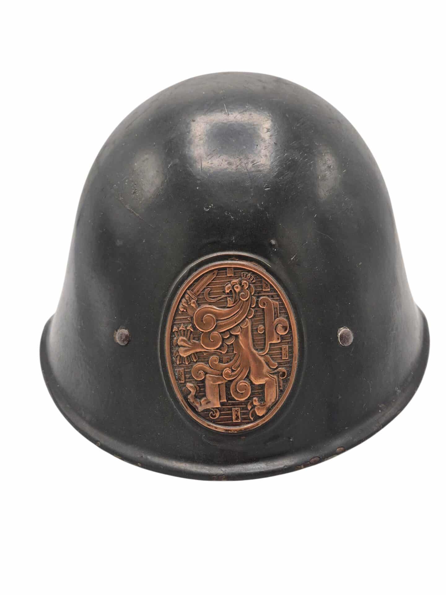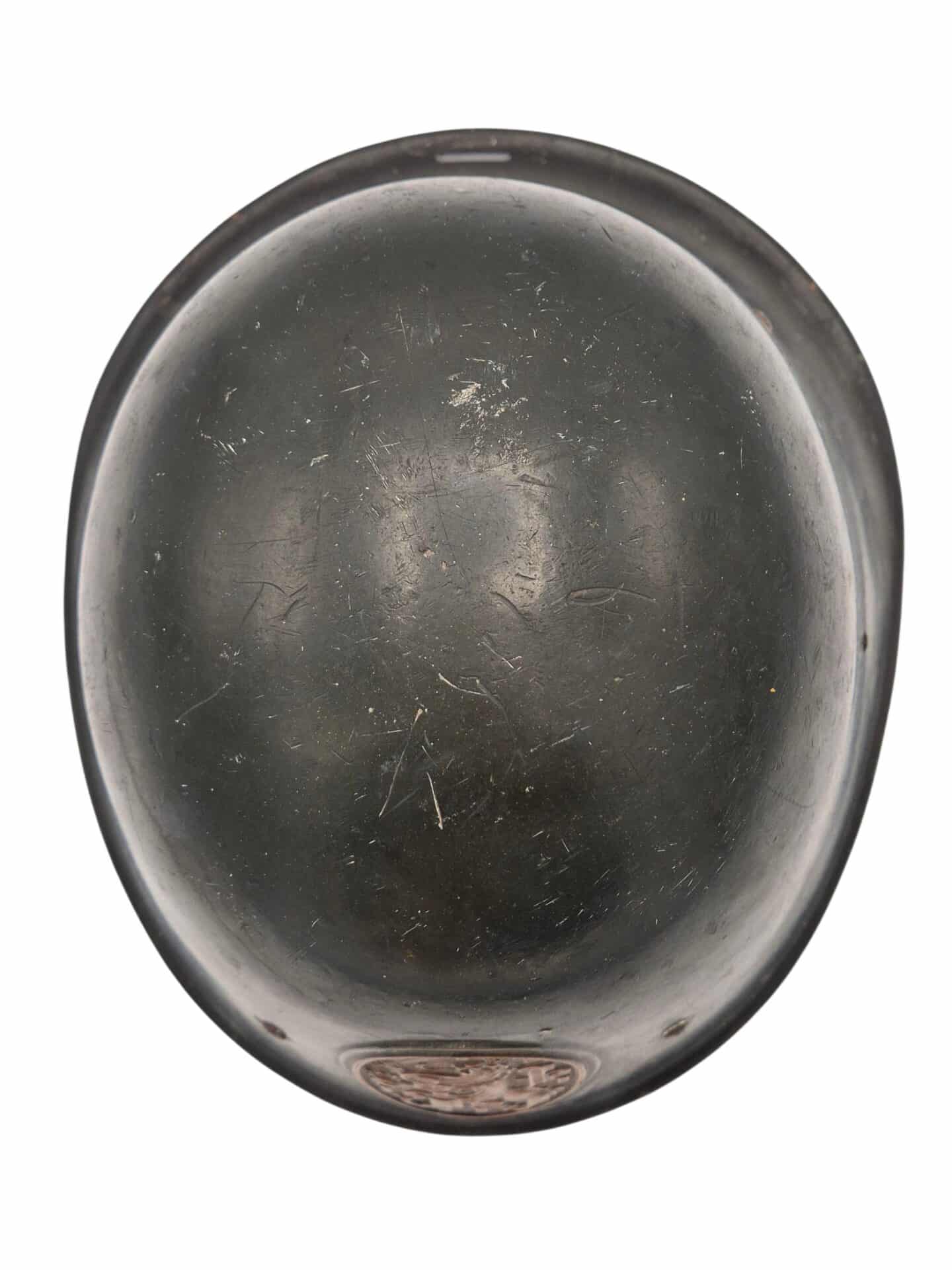 Prachtige M27 helm. De helm is nog het mooie vroege donkergroen en de verf is nog vrijwel gaaf wat bij deze modellen niet vaak voorkomt. De helmplaat is in een mooie conditie. De binnenzijde van de helm is ook nog in een zeer goede staat. De vilten flappen zijn alle 3 aanwezig en niet aangetast door motvraat. Het leer is ook nog mooi soepel. De kinriem is aanwezig. Het binnenwerk is aan de voorzijde door de maker gestanst D De Booij Den Bosch. De helm is niet voorzien van een CM stempel. Prachtige M27 helm met een bijzondere maker voor het binnenwerk.