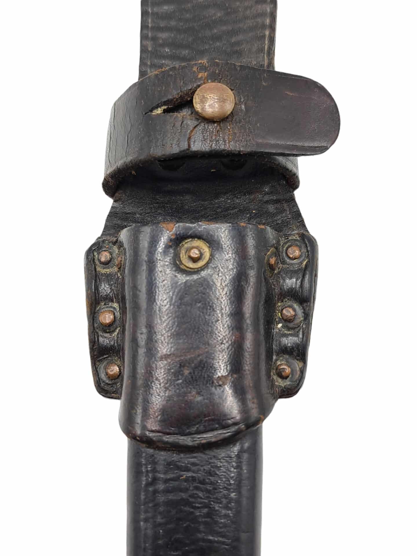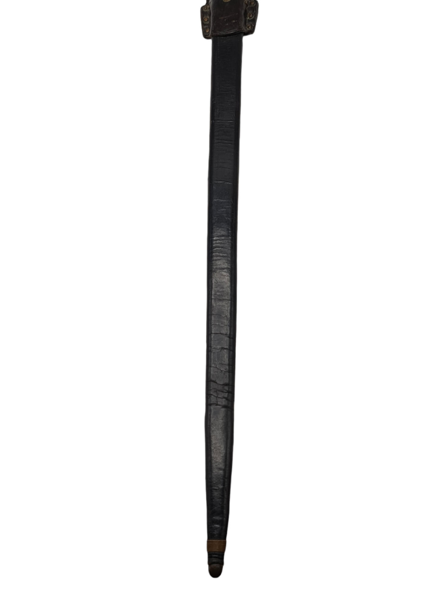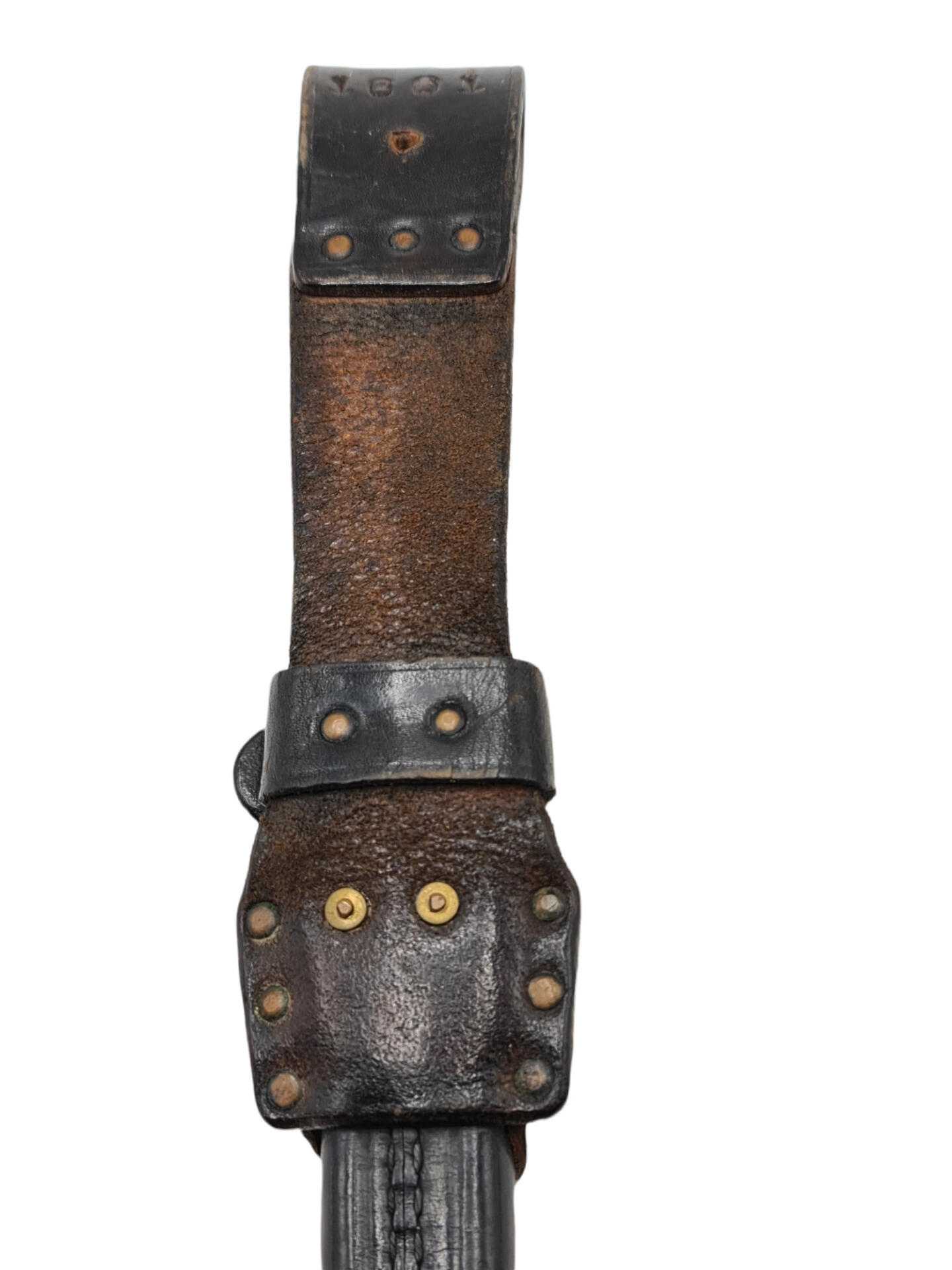 Nederlandse artillerie bajonet gemaakt door Alex Coppel Solingen. Dit betreft een vroeg model. De schede is ook een mooie vroege zwarte uitvoering. Het handvat van de bajonet is nog in een goede staat en voorzien van het wapennummer. Het lemmet en de pommel hebben helaas wat corrosie. De schede is daarentegen in een zeer goede staat voor zijn leeftijd. Het sluitriempje is niet uitgedroogd en niet gescheurd. De stiknaden zijn nog perfect en de schede is nog voorzien van het toen aangebrachte koperdraad aan de onderzijde. Leuke minder voorkomende bajonet voor op de Hembrug karabijn.