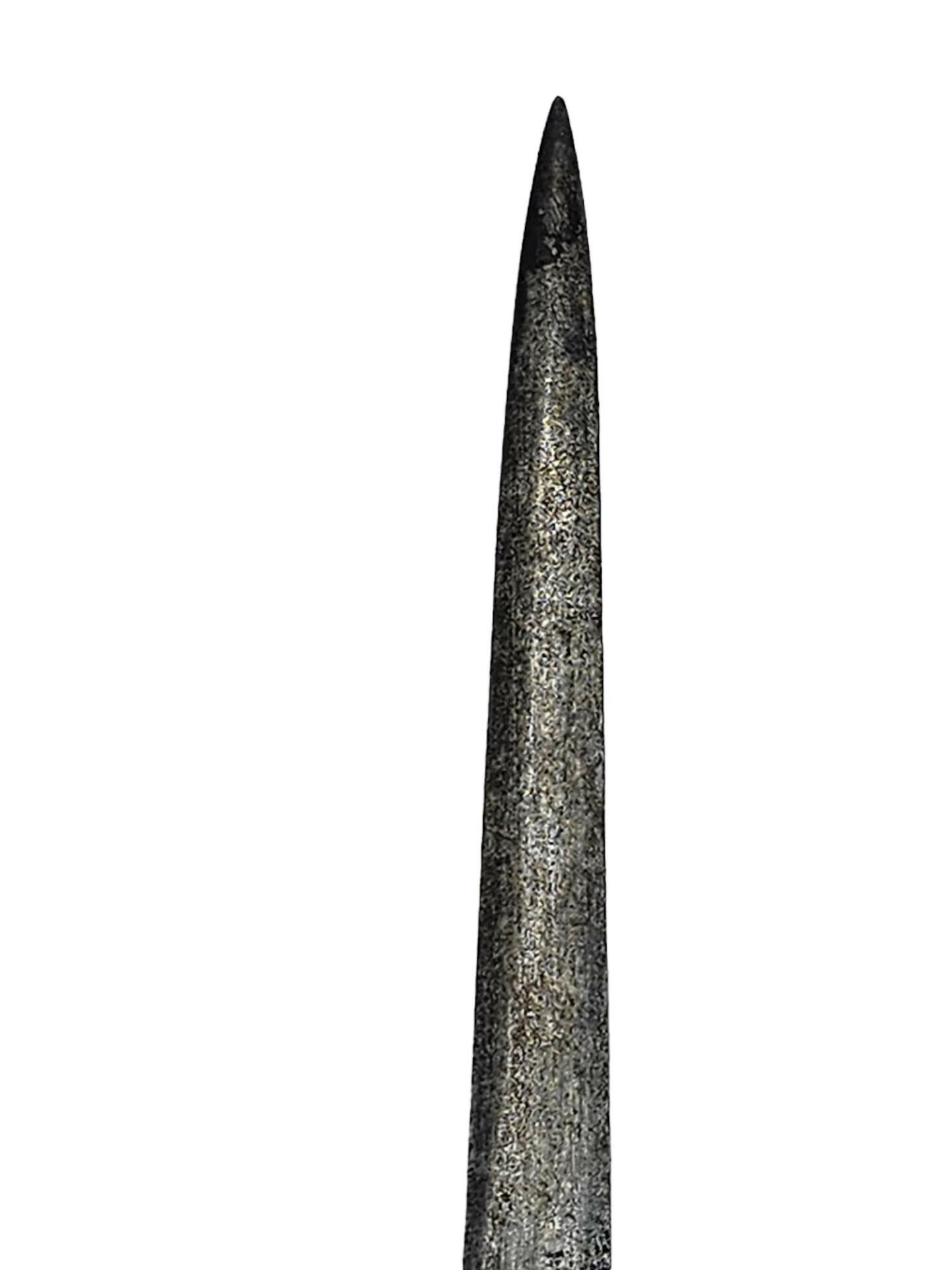 De bajonet is nog netjes en gemaakt door de WK & C (Weyersberg Kirschbaum & Co ) fabriek. Dit is een behoorlijk vroeg model van een niet veel voorkomende maker. Er zijn 2 verschillende wapennummers zichtbaar waarvan 1 met een opmerkelijke J. Op het blad is de keurmeesters stempel te zien, een gekroonde letter B. De houten handvatten zijn nog intact. De drukknop functioneert nog prima