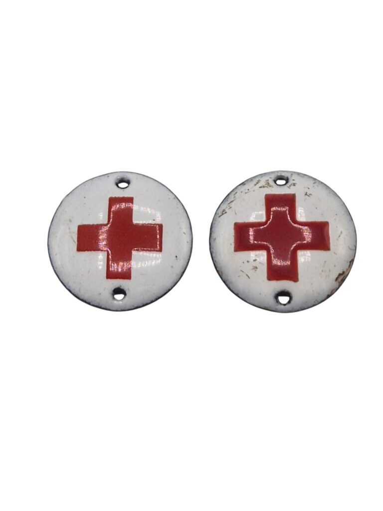 Mooi setje Nederlandse manschappen hospik kraagemblemen. 1 embleem is helemaal gaaf de ander is iets meer gedragen en heeft wat kleine plekjes. De kraagemblemen konden door middel van de gaatjes en draad op de kraag van het grove wollen uniform gezet worden.