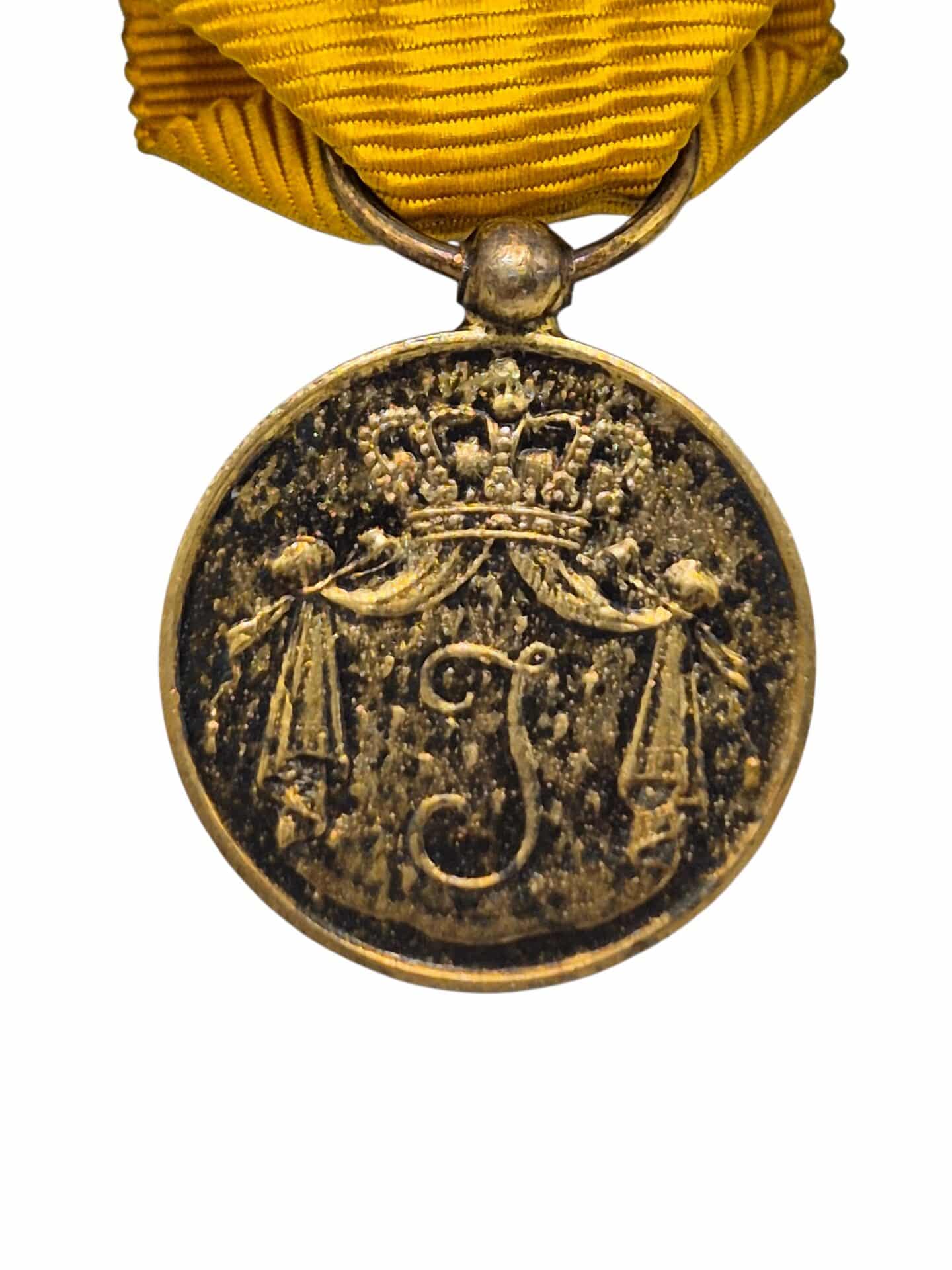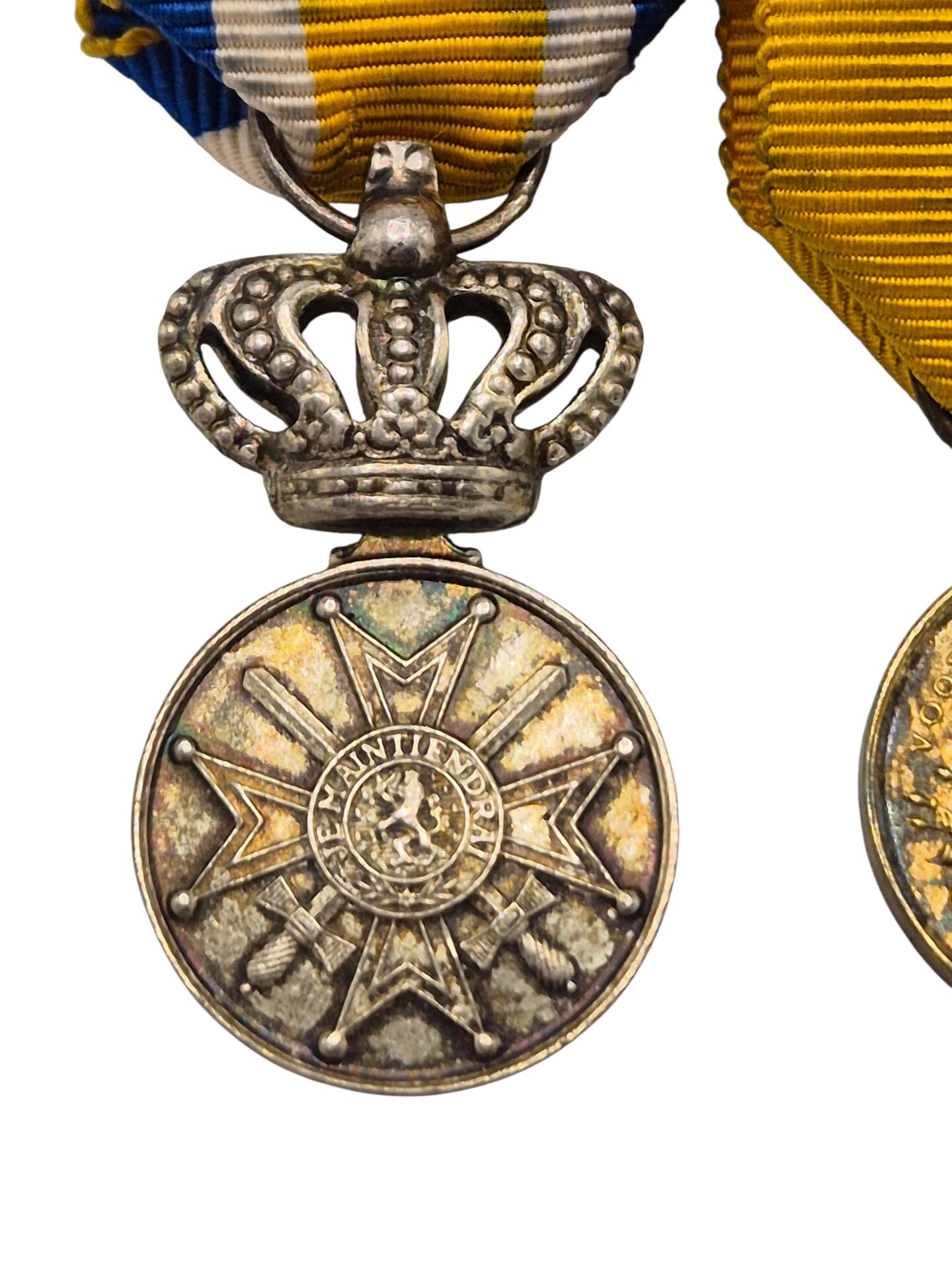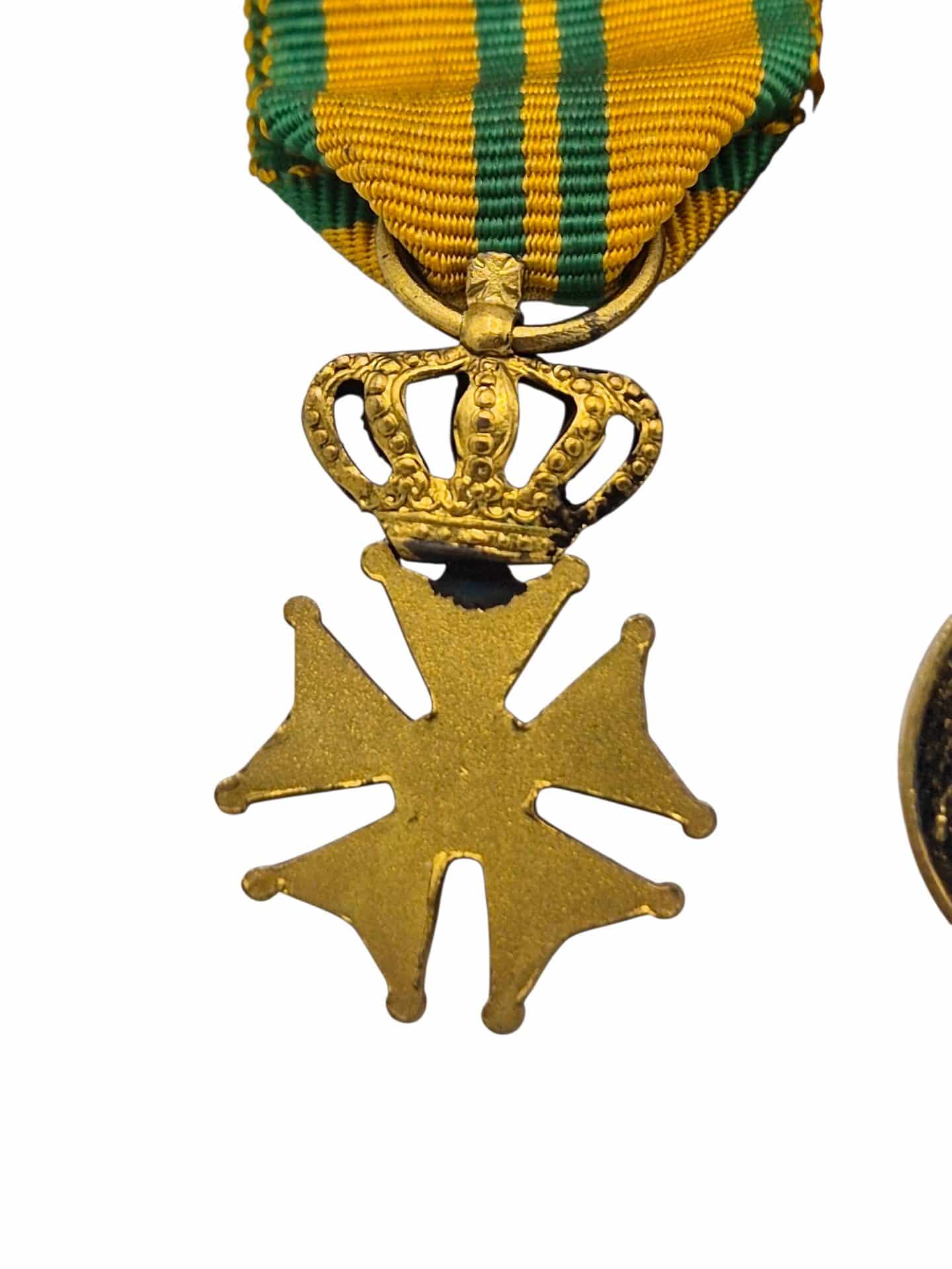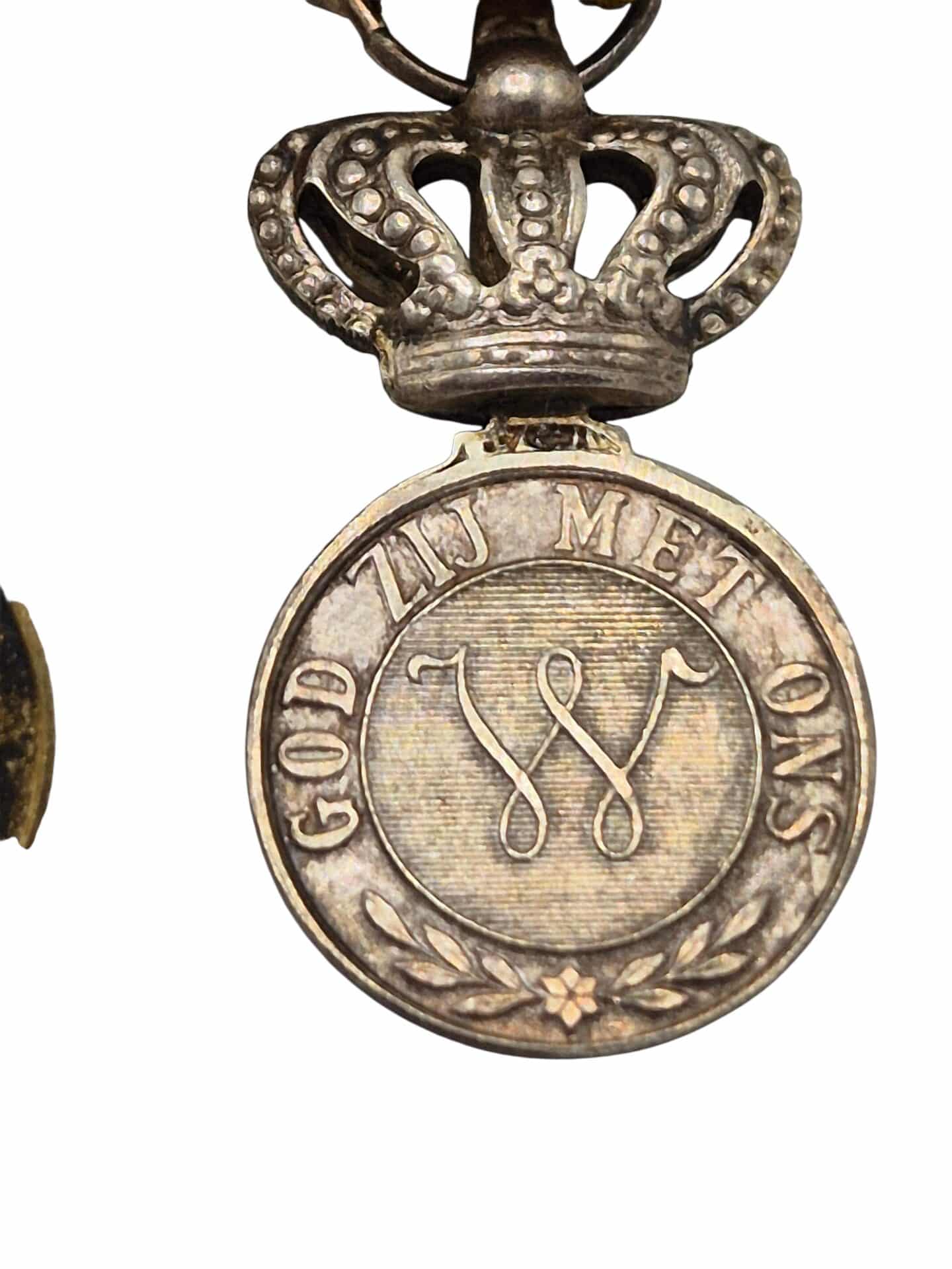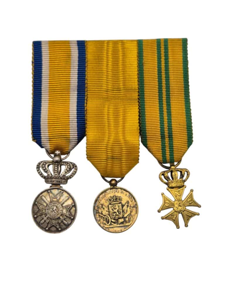 Mooie Nederlandse miniatuur medaille spange, de set bestaat uit de eremedaille Oranje Nassau in zilver met zwaarden, 36 jaar trouwe dienst medaille en de wandelmedaille. Prachtig opgemaakt setje.