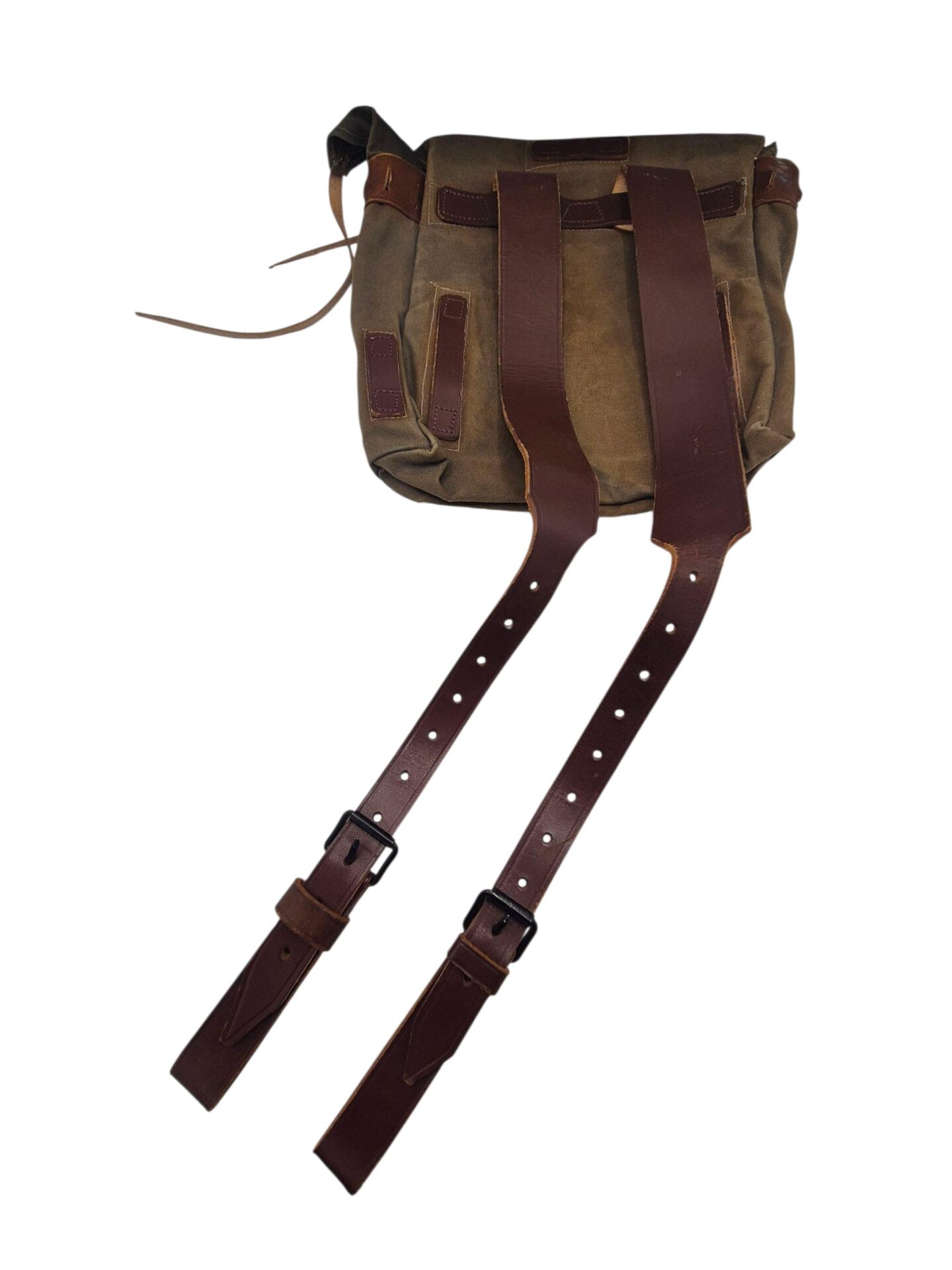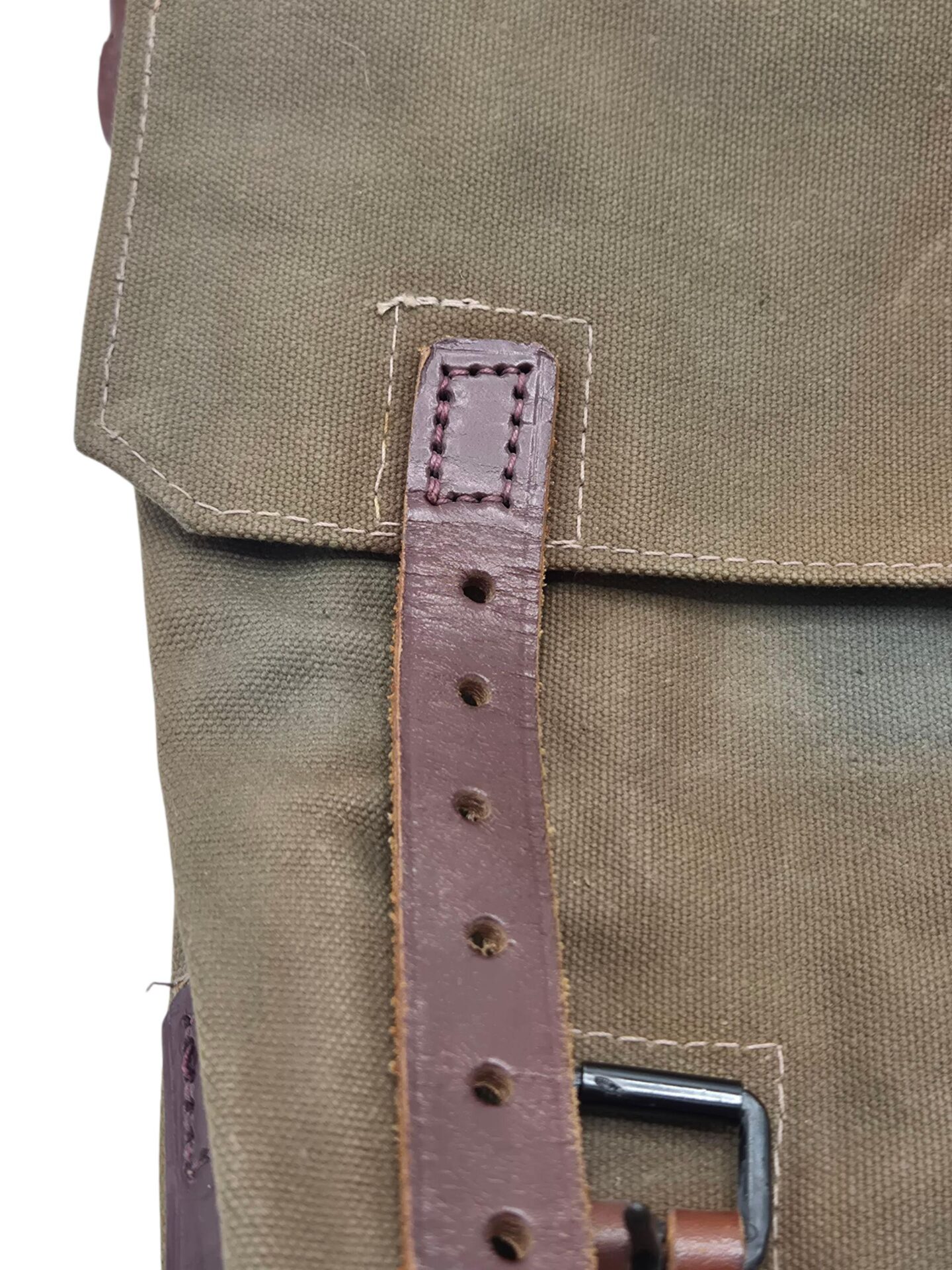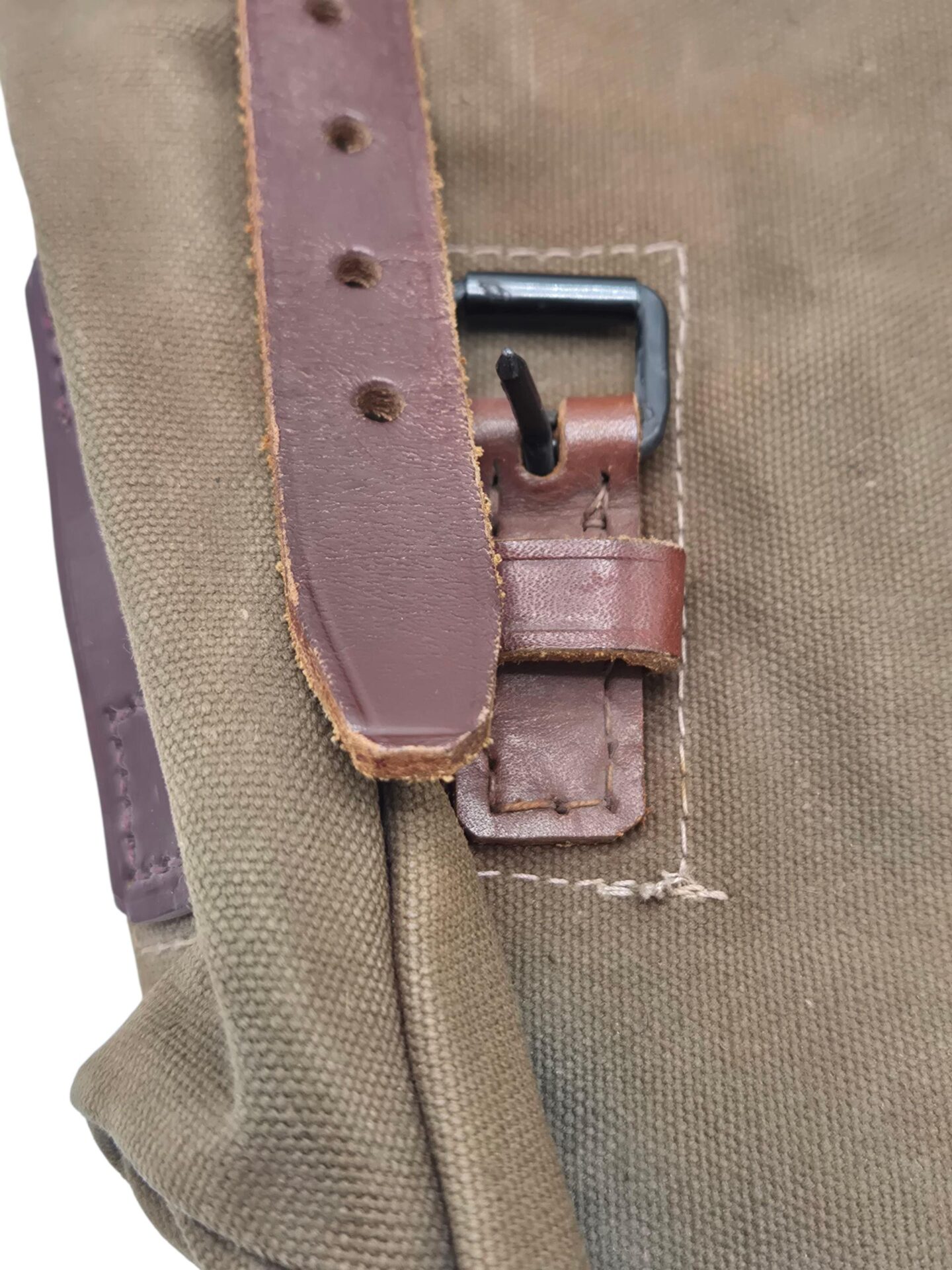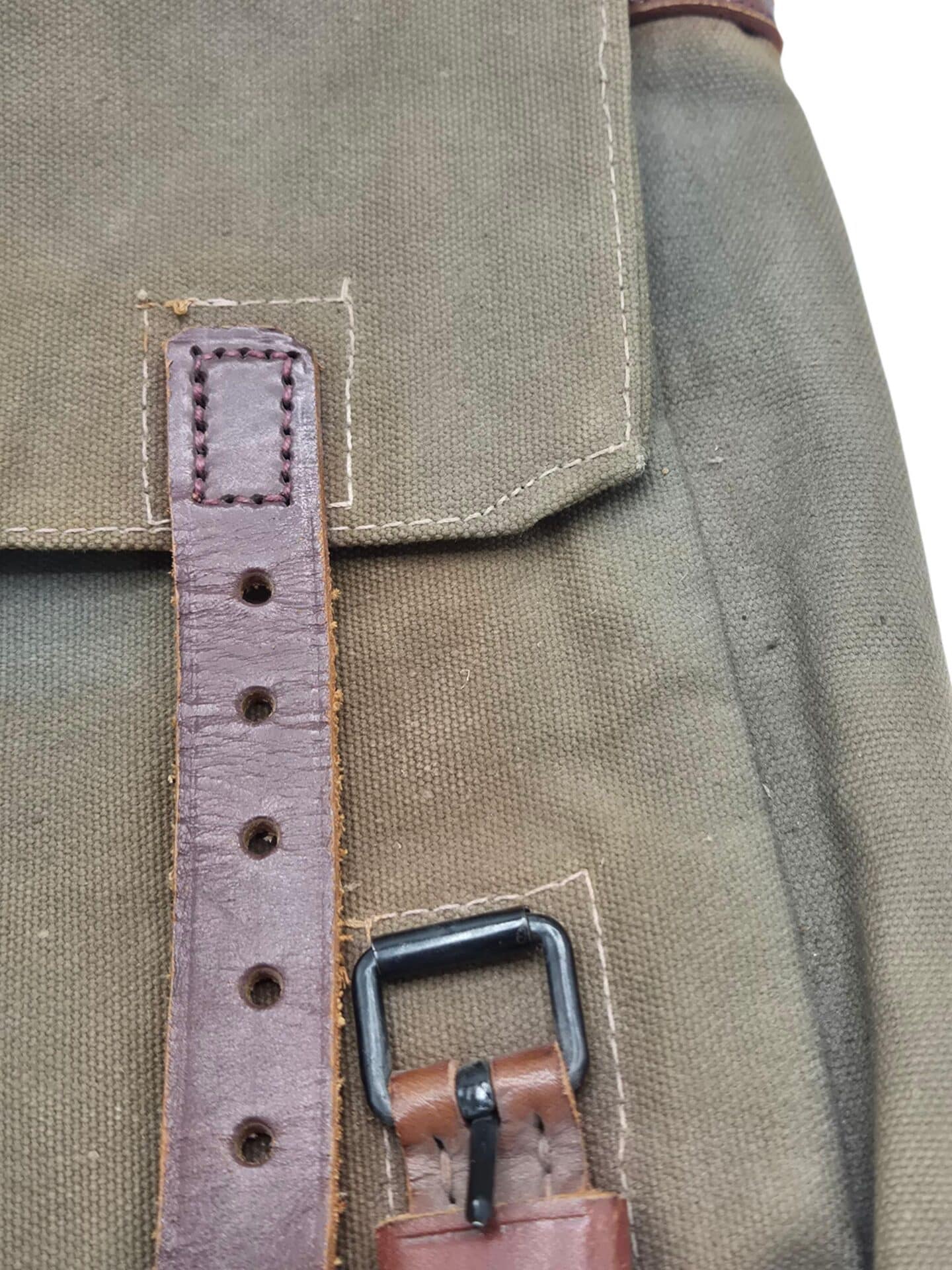 Nederlands buitenmodel officiers ransel. Deze ransels zijn te herkennen aan het ontbreken van de riempjes om het eetketel foedraal aan te bevestigen en de bredere band in de koppelpassanten waar de Sam Brown riem doorheen geschoven kon worden. Deze ransel verkeerd nog in een ongebruikte staat.  Ook zitten beide brede koppelpassanten voor de sam brown riem er bij. Mooi stukje velduitrusting voor een officier!