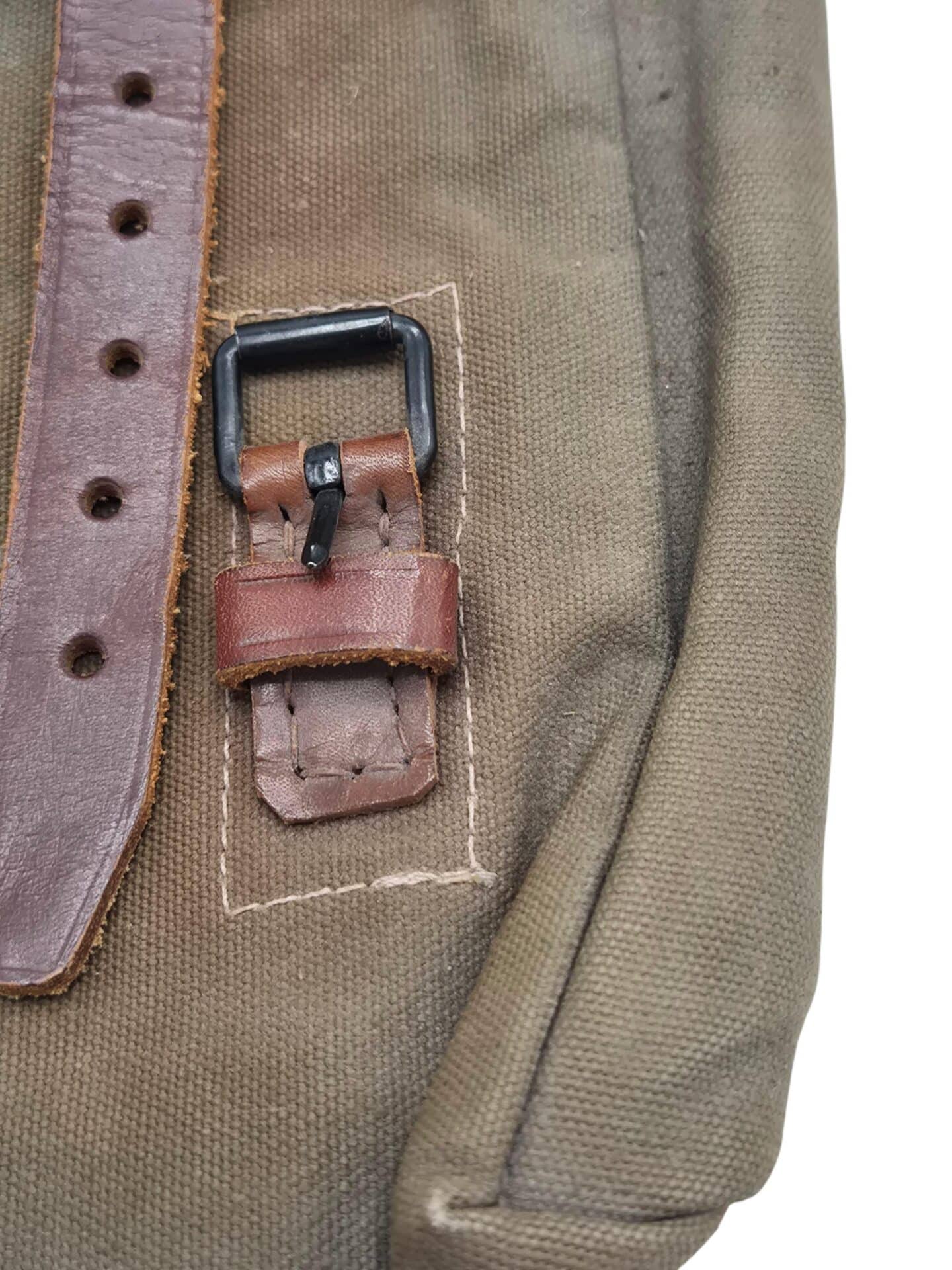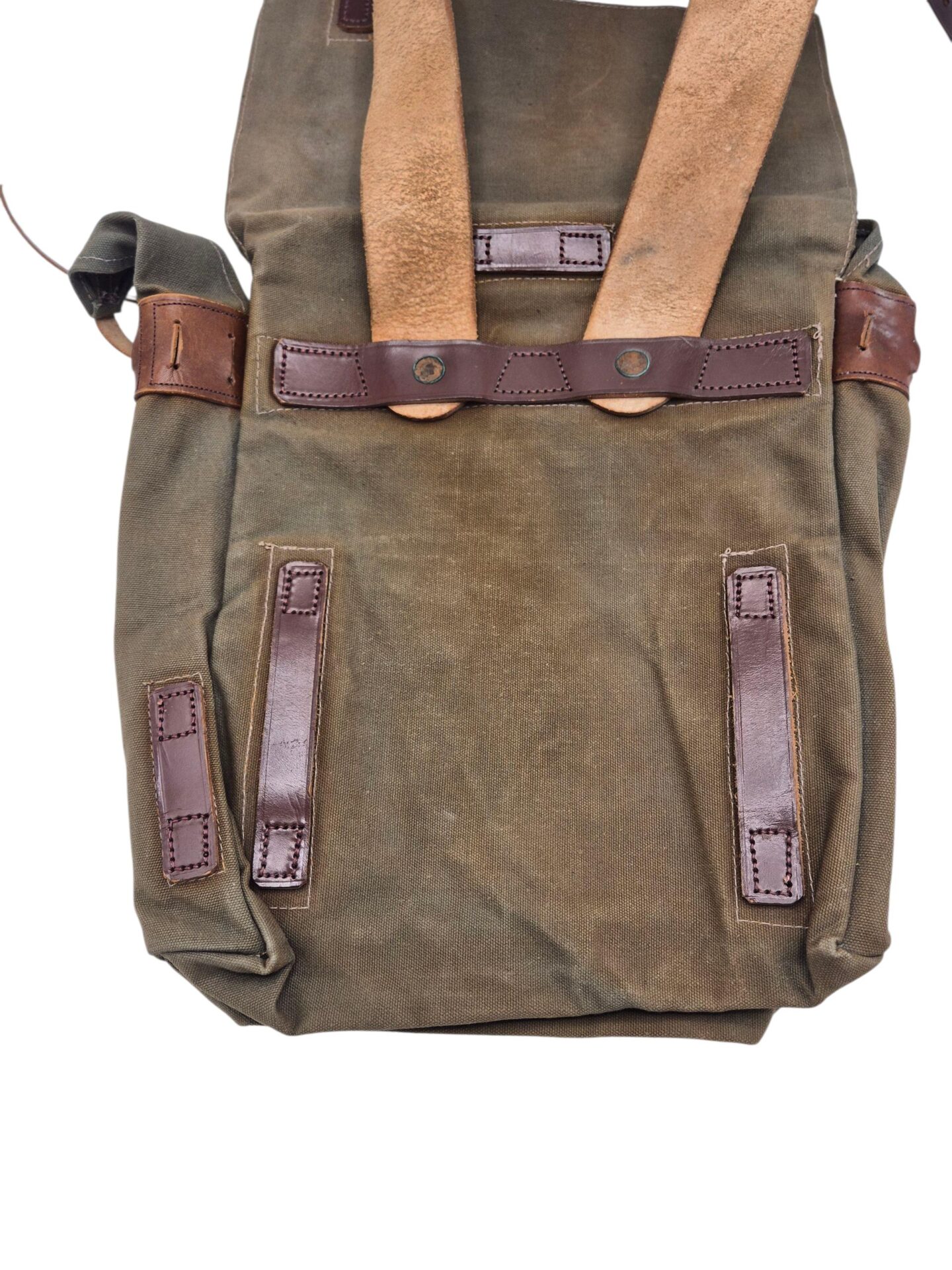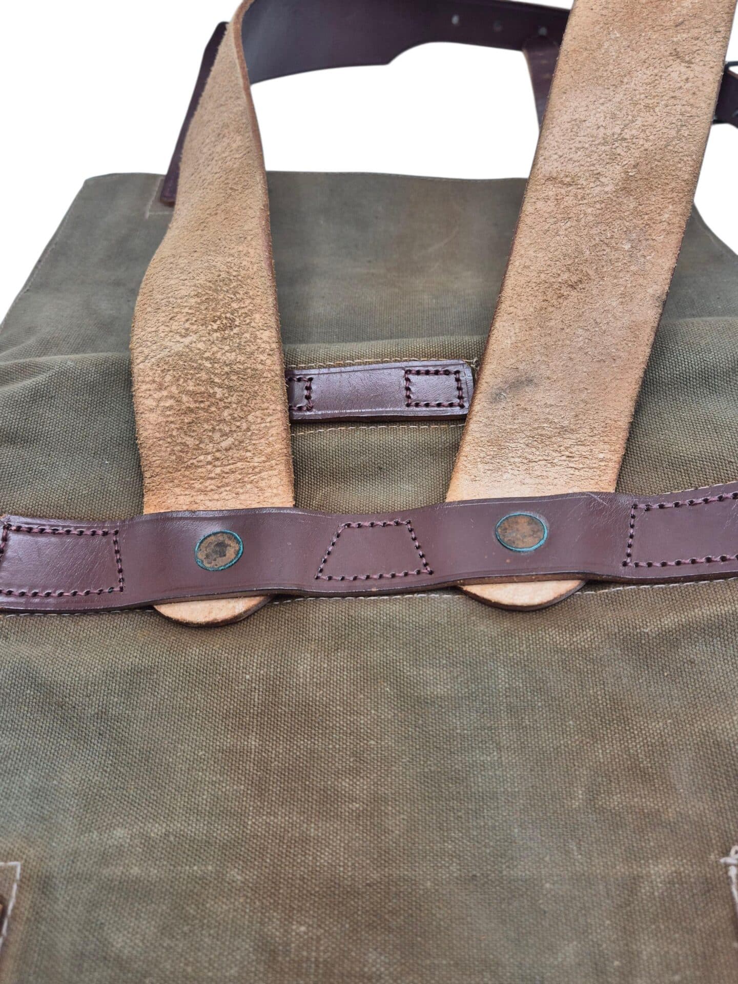 Nederlands buitenmodel officiers ransel. Deze ransels zijn te herkennen aan het ontbreken van de riempjes om het eetketel foedraal aan te bevestigen en de bredere band in de koppelpassanten waar de Sam Brown riem doorheen geschoven kon worden. Deze ransel verkeerd nog in een ongebruikte staat.  Ook zitten beide brede koppelpassanten voor de sam brown riem er bij. Mooi stukje velduitrusting voor een officier!