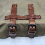 Nederlands officiers ransel. Deze ransels zijn te herkennen aan het ontbreken van de riempjes om het eetketel foedraal aan te bevestigen en de bredere band in de koppelpassanten waar de Sam Brown riem doorheen geschoven kon worden. Dit model kon als een soort rugzak gedragen worden. De tas is netjes CM 1933 gestempeld en verkeerd nog in een bijna ongebruikte staat. De ransel is compleet met de leertjes om de ransel als rugzak te dragen. Mooi stukje velduitrusting voor een officier!