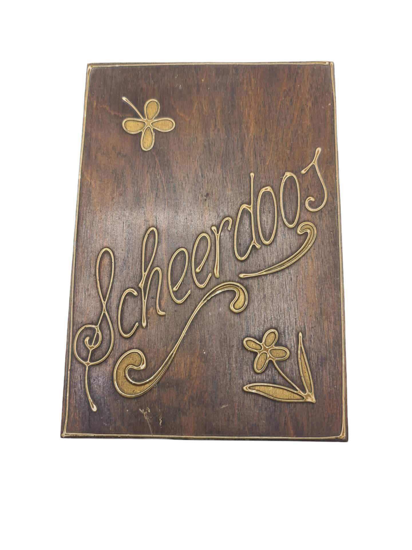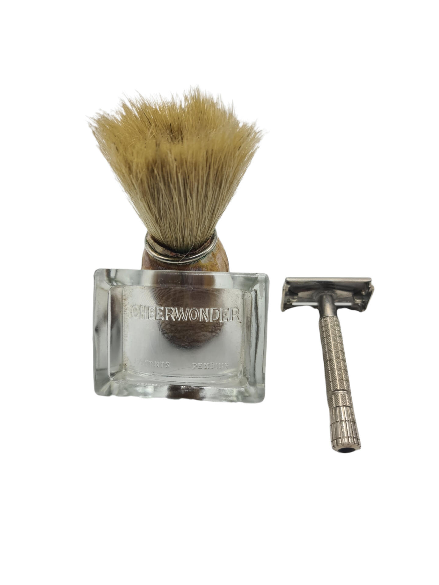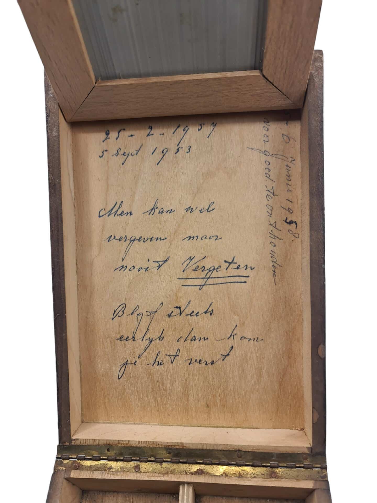 Leuke scheerdoos die militair in gebruik is geweest. De doos is gevuld met de kwast een origineel scheermesje en de glazen houder voor het scheermesje. De spiegel is nog intact en achter de spiegel staan wat persoonlijke teksten en dateringen. Leuk display item.