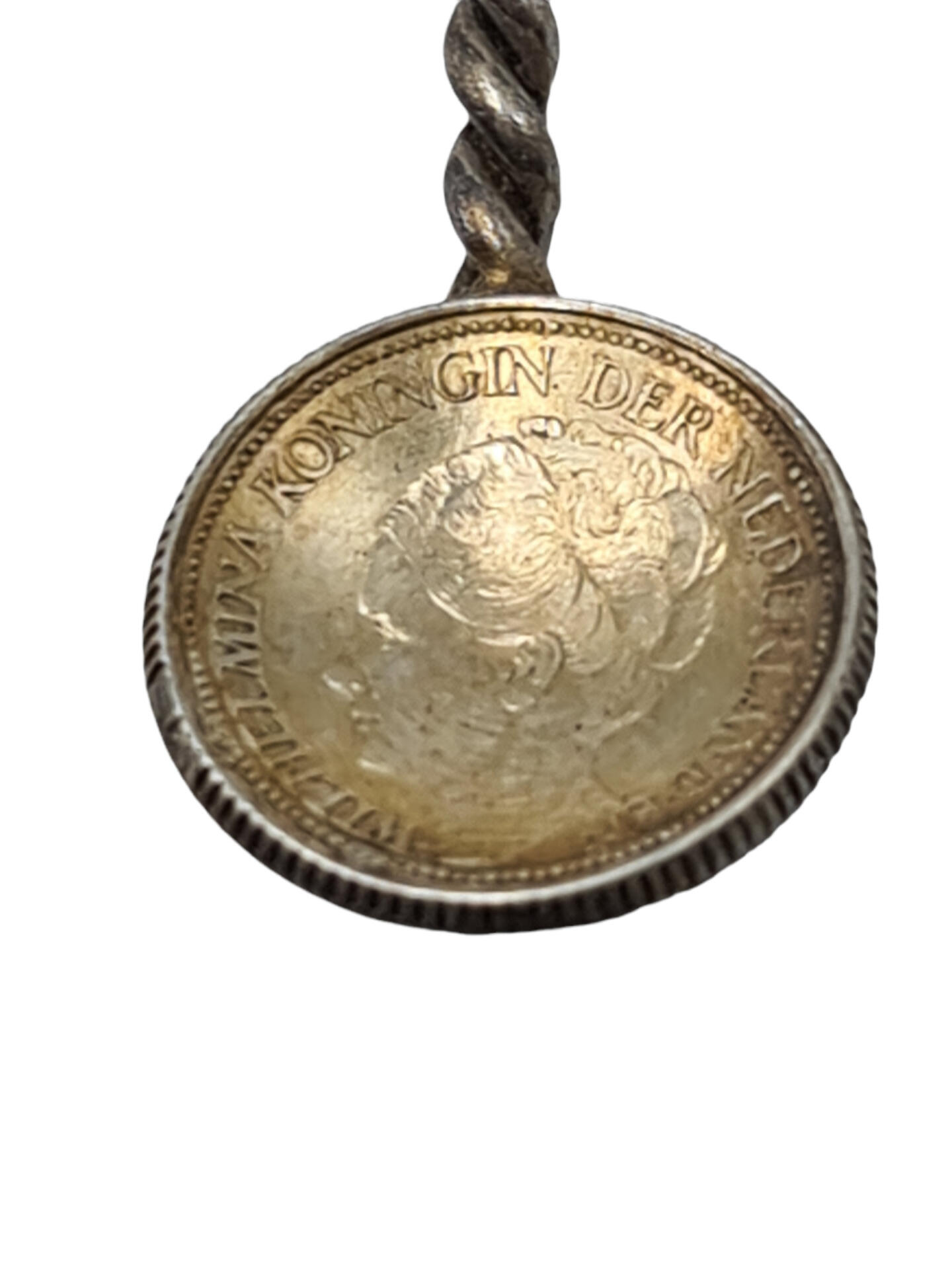 Prachtig handgemaakt zilveren lepeltje. Deze lepeltjes waren een stil verzet om toch trouw aan het koningshuis te tonen. Het kwartje is een US gemaakt kwartje 1941 en het dubbeltje komt uit 1938. Zeer vakkundig gemaakt.
