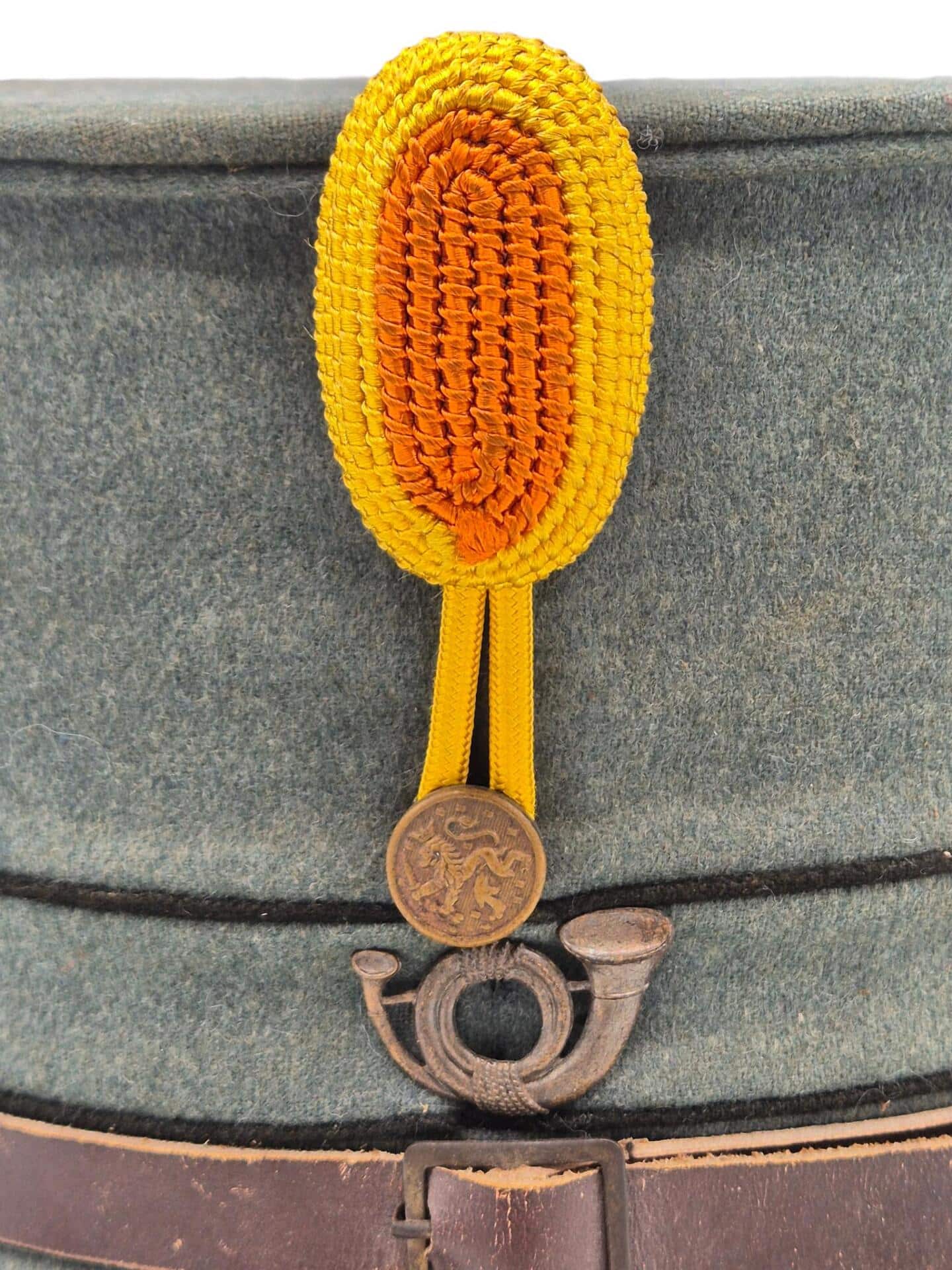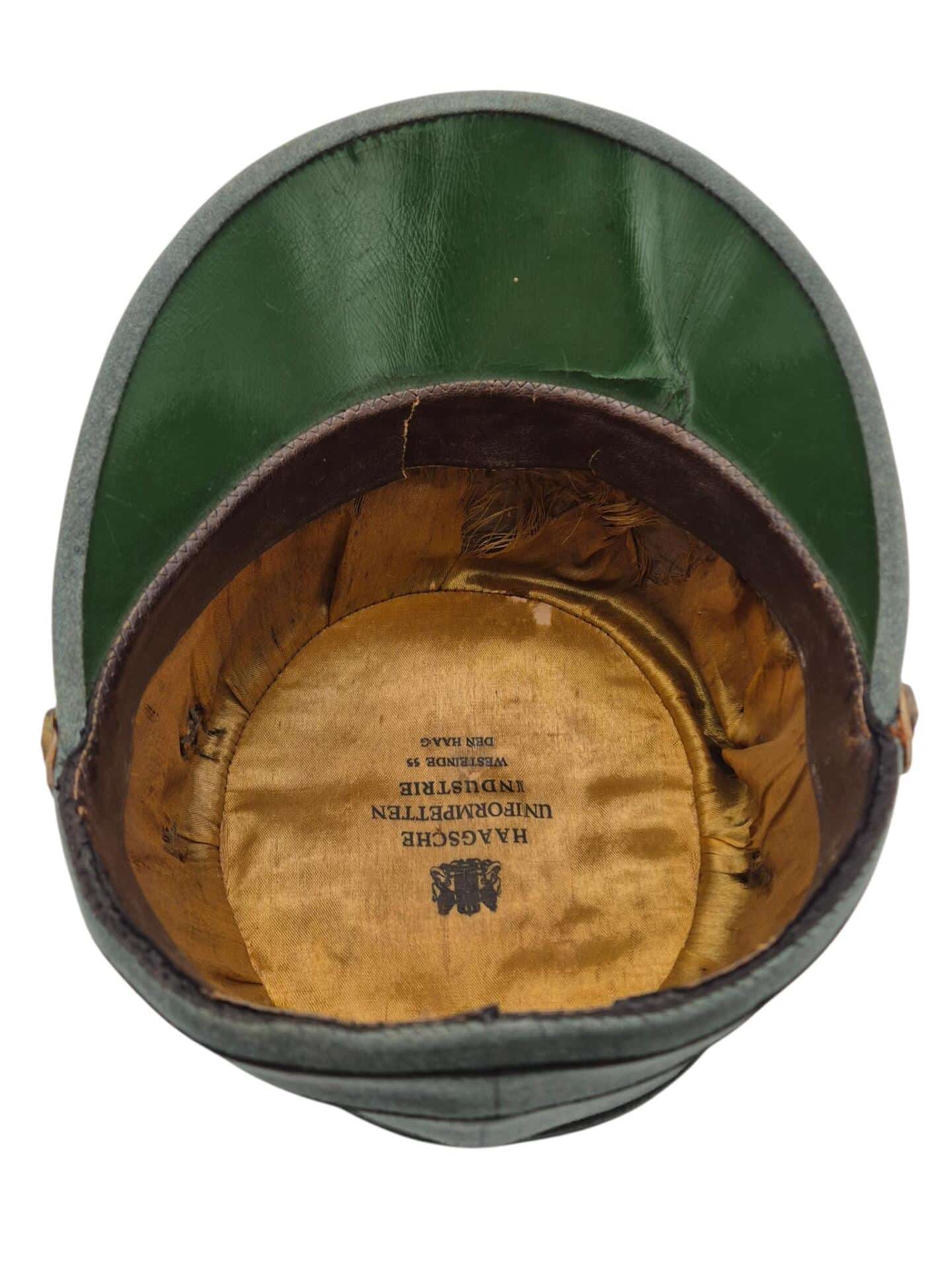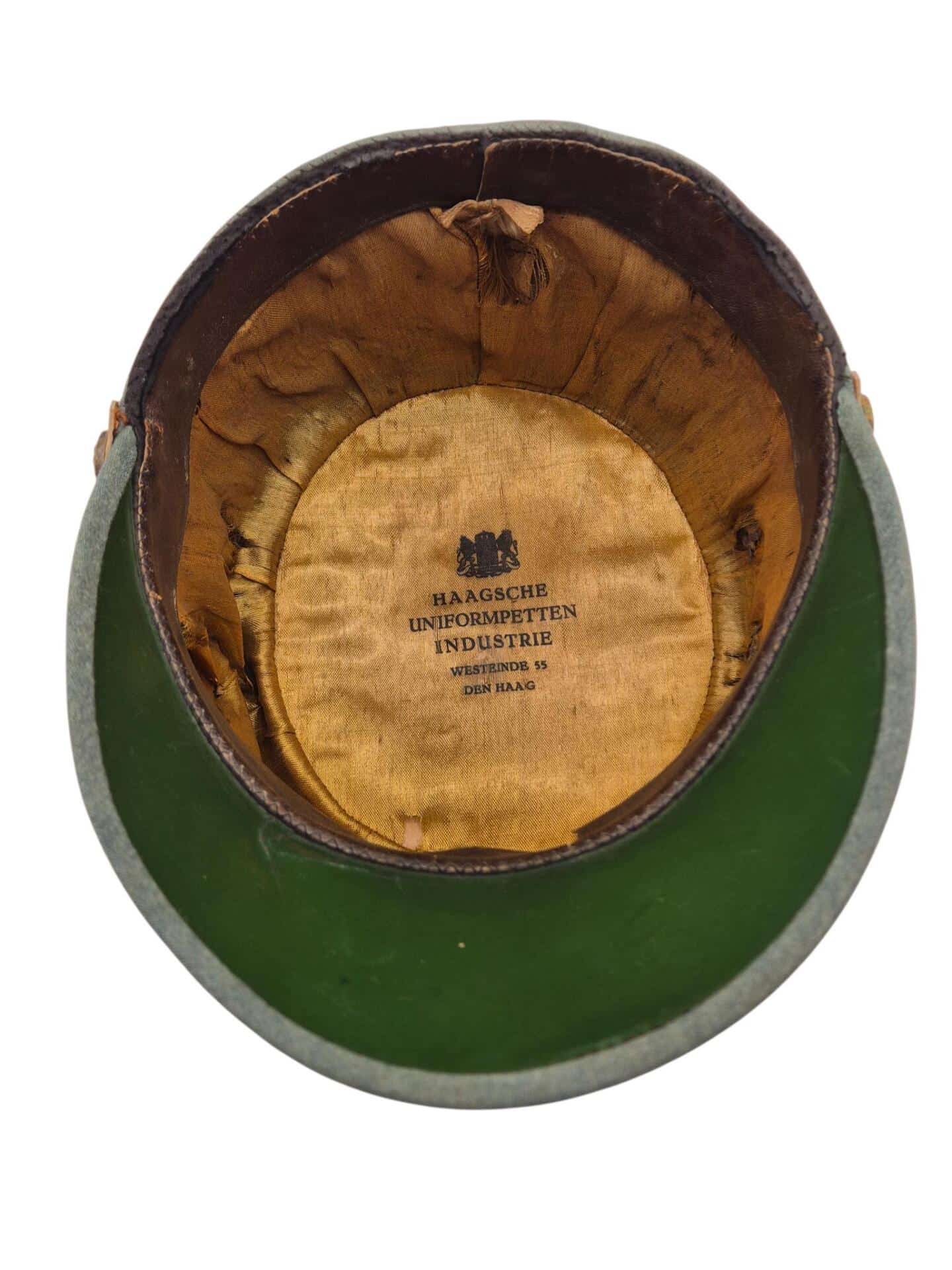 Zeer zeldzame kepie van een onderofficier der Jagers. De Jagers heeft zich altijd onderscheiden van de rest van de krijgsmacht en werd als een elite eenheid beschouwd. De kepie is voorzien van een dubbele groene band waarmee hij zich onderscheid van andere kepies. De kepie is voorzien van een kokarde voor onderofficieren. De buitenkant van de kepie is in een zeer goede staat met een aantal heel klein gaatjes aan de bovenzijde, de binnenzijde is mooi maker gemarkeerd Haagsche uniformpetten industrie aan het Westeinde, een zeldzame maker. Een mooie en niet te vinden kepie die ontbreekt in de meeste collecties.