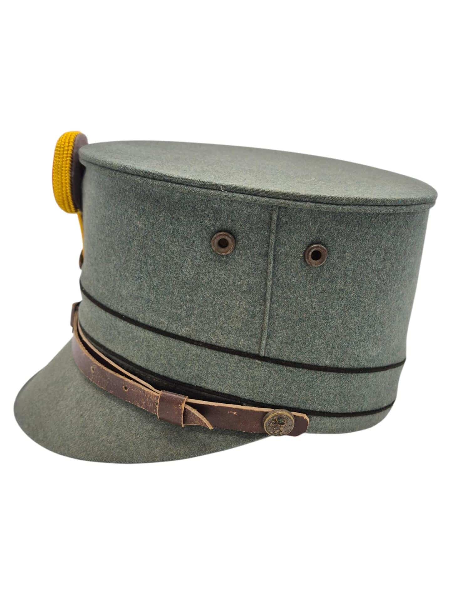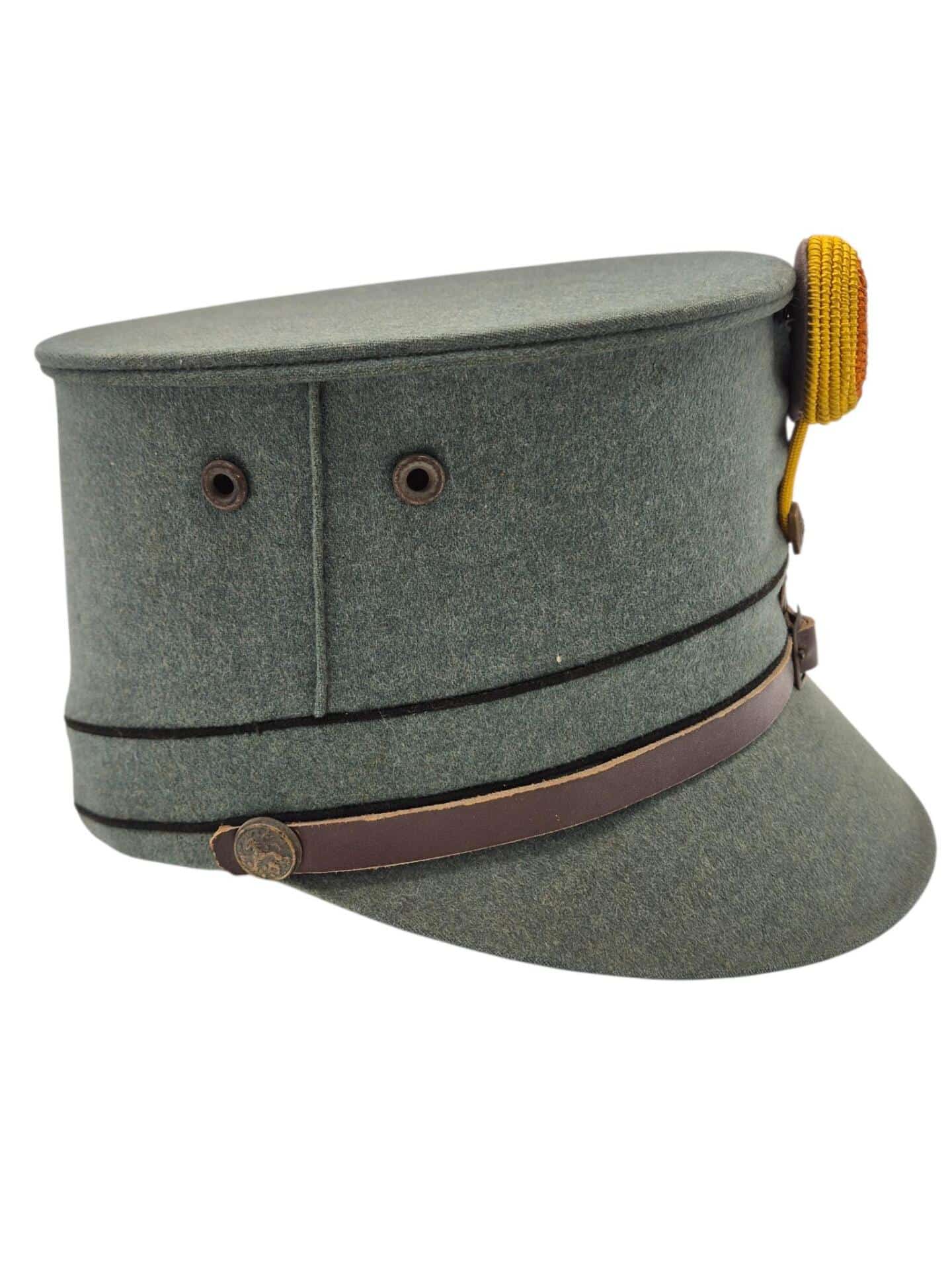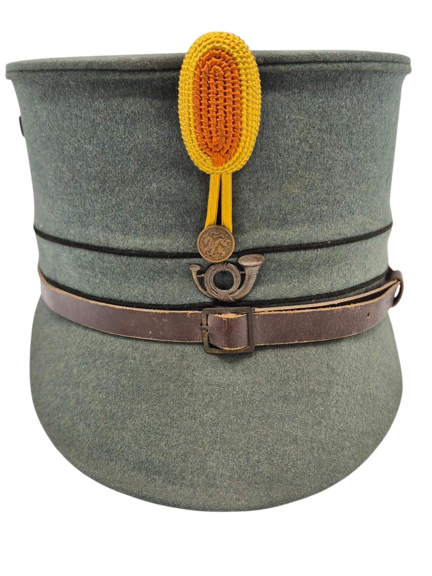 Zeer zeldzame kepie van een onderofficier der Jagers. De Jagers heeft zich altijd onderscheiden van de rest van de krijgsmacht en werd als een elite eenheid beschouwd. De kepie is voorzien van een dubbele groene band waarmee hij zich onderscheid van andere kepies. De kepie is voorzien van een kokarde voor onderofficieren. De buitenkant van de kepie is in een zeer goede staat met een aantal heel klein gaatjes aan de bovenzijde, de binnenzijde is mooi maker gemarkeerd Haagsche uniformpetten industrie aan het Westeinde, een zeldzame maker. Een mooie en niet te vinden kepie die ontbreekt in de meeste collecties.
