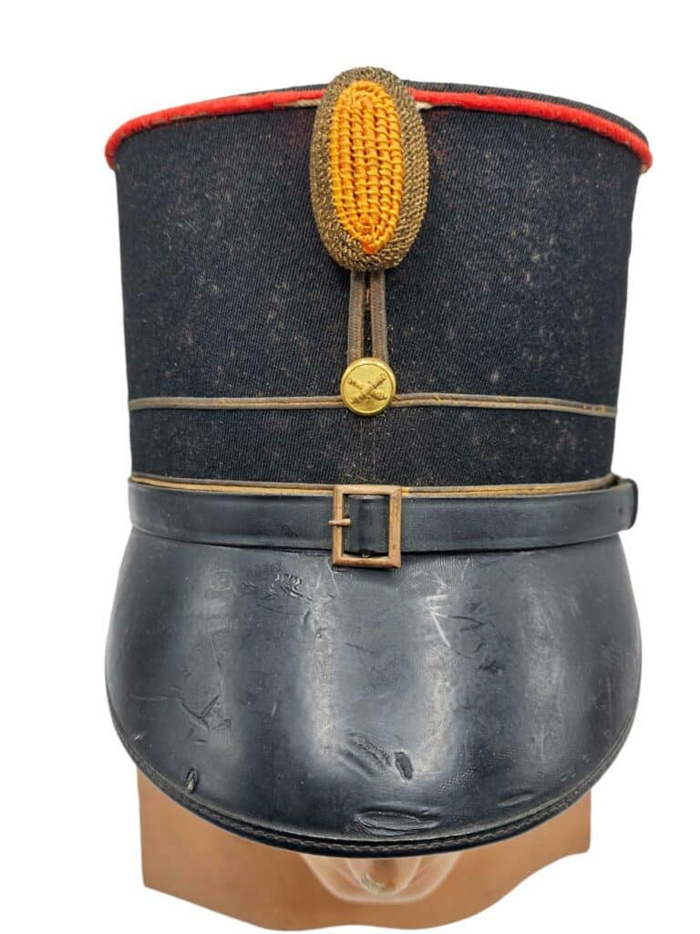 In goede staat verkerende Nederlandse officiers kepie voor op het ceremoniële pak. De kepie werd gedragen door een officier ingedeeld bij een artillerie regiment. Dit is te zien aan de 2 gouden en de enkele rode bies met daarop artillerie knopen. Ook de van gouddraad gemaakt kokarde verteld dat het hier om een officier gaat. De zwart gelakte kinriem verkeerd ook in een zeer goede staat. De binnenzijde is nog in een zeer goede staat en is mooi maker gestempeld door een niet veel voorkomende kepie maker uit Breda. De kepie is toe aan schoonmaakbeurt en heeft wat kleine motgaatjes op de rode bies.