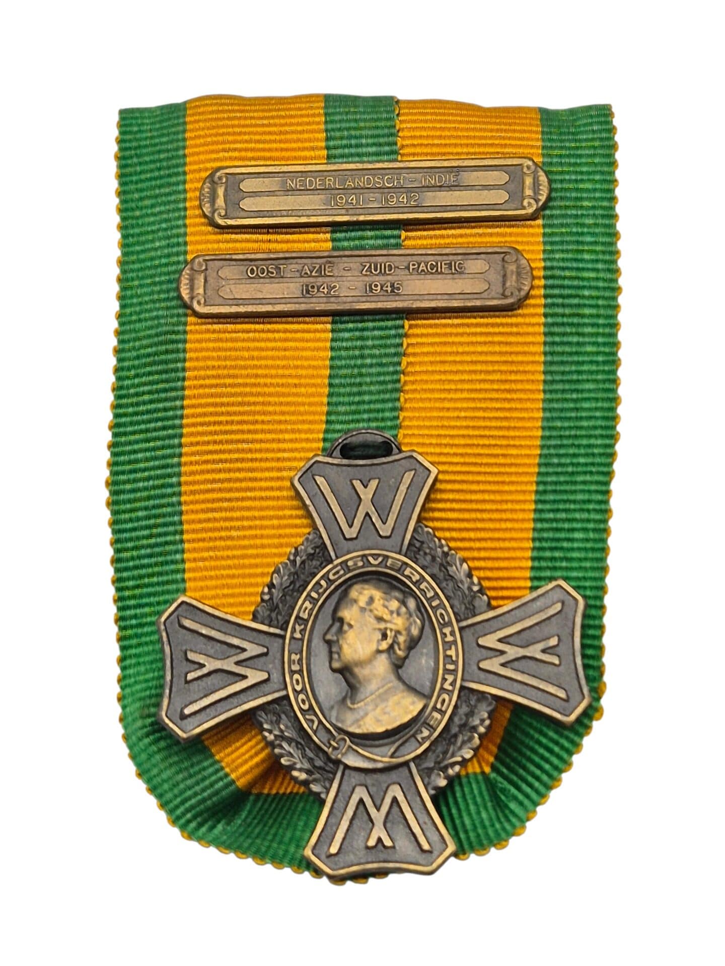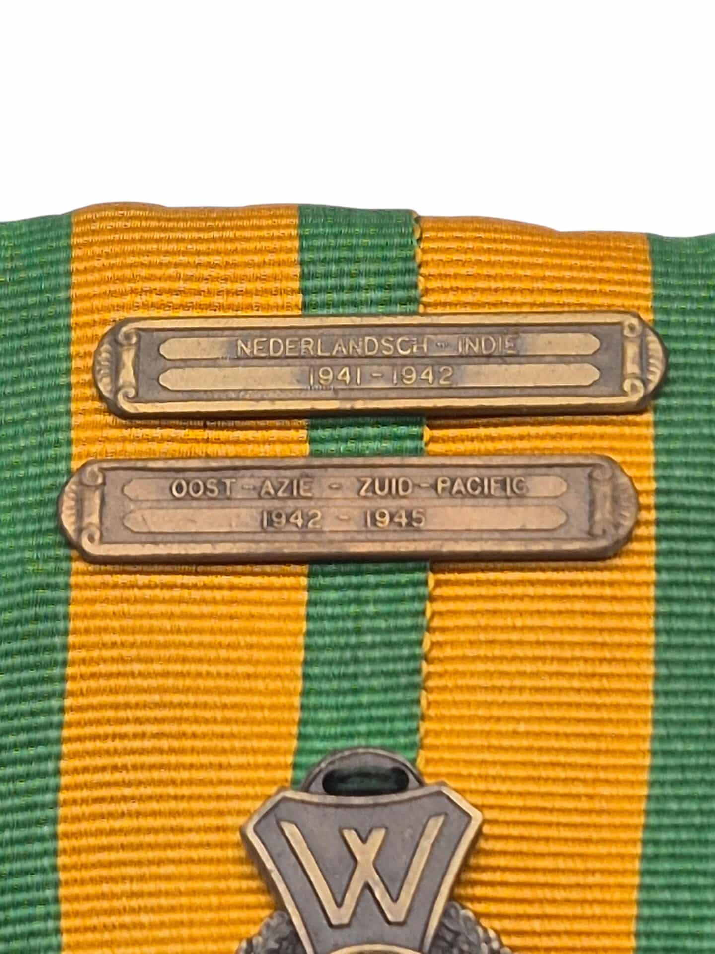 Oorlogsherinneringskruis gemaakt door Koninklijke begeer uit Voorschoten en samengesteld door de firma A. Tack uit Breda. Deze OHK is voorzien van 2 gespen! Nederlandsch Indië 1941-1942, Oost Azie Zuid Pacific, wat inhoud dat de ontvanger tijdens de oorlog in de strijd om Indië heeft meegevochten en later met de geallieerden tegen de Japanners in de Zuid Pacific . De Medaille verkeert nog in een nette staat. Niet veel voorkomende gespen