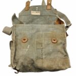 Nederlands gasmaskertas model G Onbereden. De tas is netjes gemarkeerd met de O voor Onbereden. Het verschil tussen de onbereden en bereden gasmasker tassen is voornamelijk de extra haak om de tas aan de koppel vast te klikken. Helaas mist de haak bij deze tas. De sluitleertjes op de tas zijn nog zeer mooi lichtbruin en mooi soepel. De tas is op naam en in de tas zit het gasmasker met de filterbus.