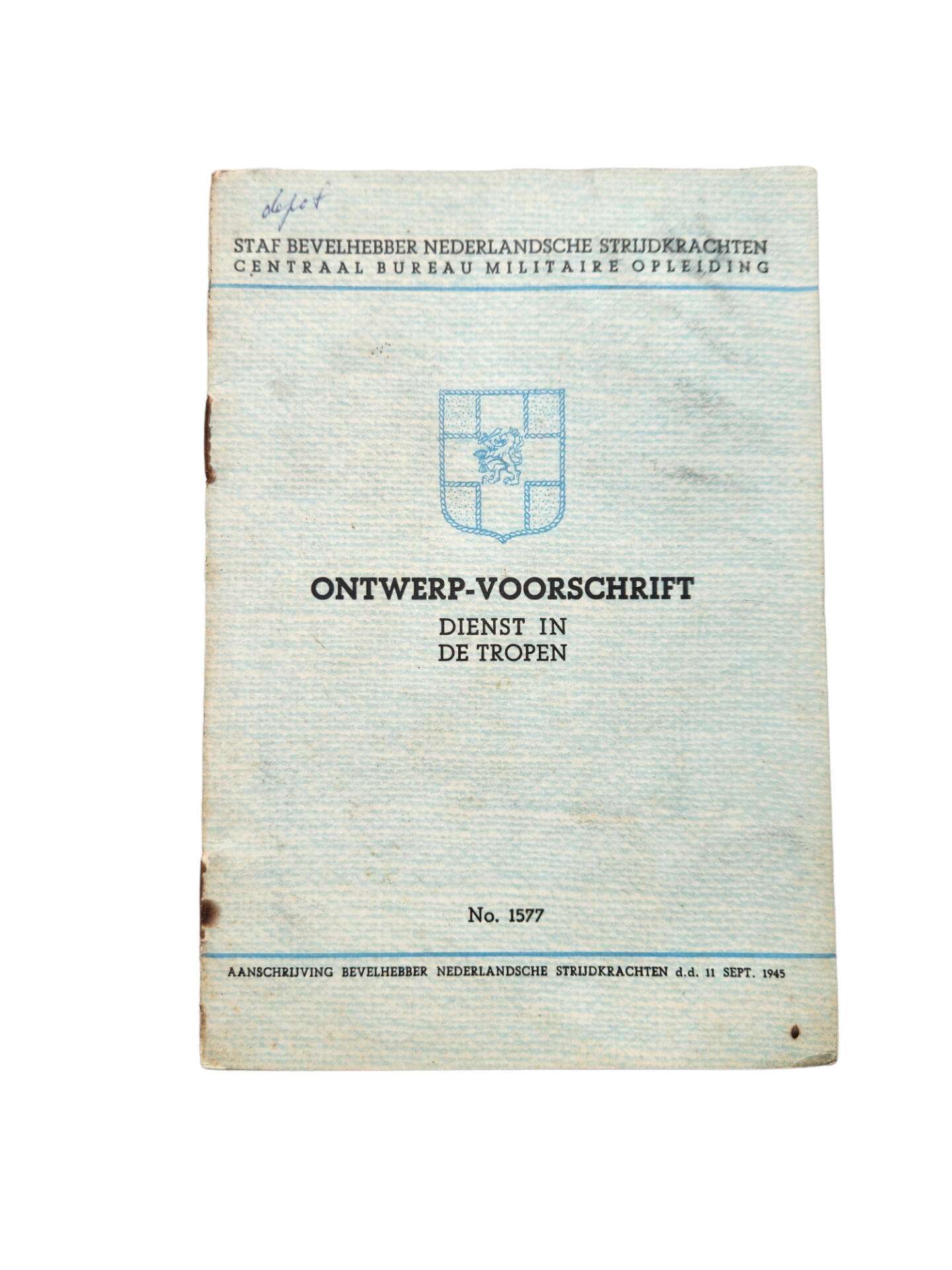 Ontwerp Voorschift 1577. Dienst in Tropen 11 september 1945. Leuk is dat aan de binnenzijde van het boekje Pantserschool staat vermeld. Het boekje is in een goede staat. Niet veel voorkomend voorschrift.