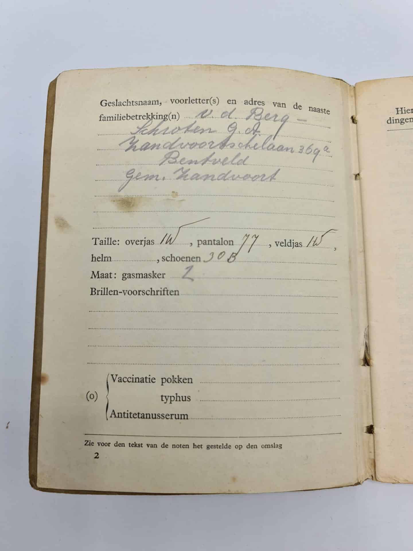 Oorlogszakboekje van de dienstplichtig chauffeur Arij van den Berg, chauffeur bij het 6e auto bataljon. Dit was een onderdeel van het Korps Motordienst. Het boekjes verkeerd in een nette staat en komt samen met drie documenten. Twee distributiekaarten van zijn zoon en vrouw en een ontvangstbewijs van een distributiekaart. Origineel oorlogszakboekje van een chauffeur bij het Korps Motordienst!