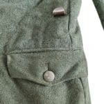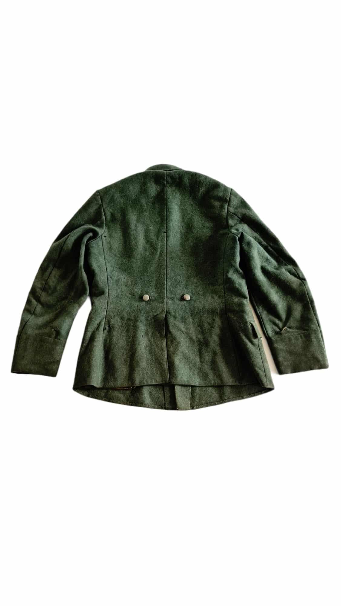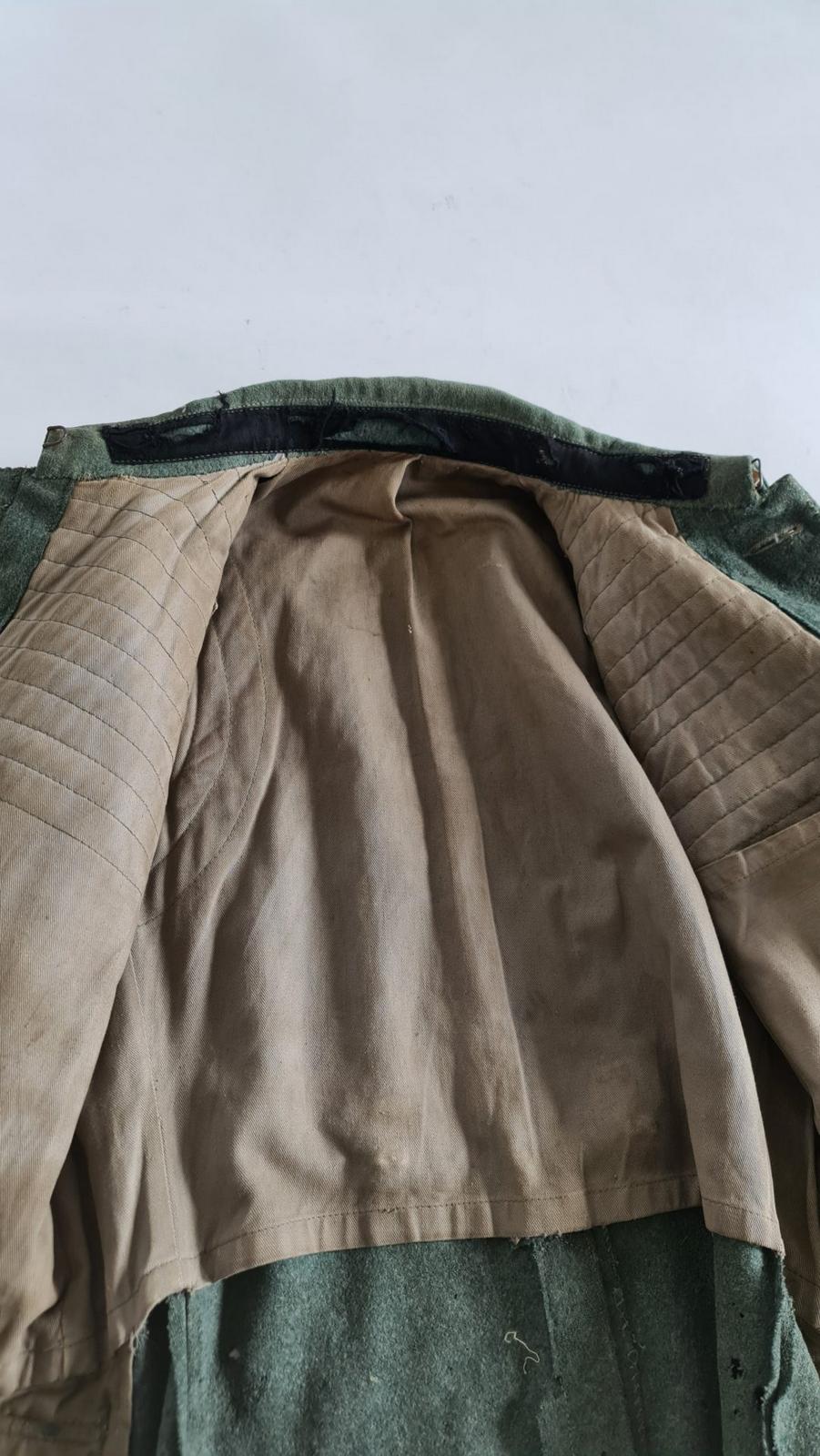 Zeer zeldzaam grove wol proefmodel jas, doorgebruikt door het Duitse leger. Het gave aan deze jas is dat hij bijna niet verbouwd is door de Duitsers. Alleen de schouderstukken zijn vervangen en de knopen. De originele kraag zit nog op de jas, wat erg bijzonder is. De reden dat de originele kraag er nog op zit is omdat de kraag van het proefmodel bijna identiek was aan de omgeslagen kragen van de Duitsers. De jas is in een flink gedragen staat en heeft op meerdere plekken weinig grove wol meer zitten. De originele binnenvoering zit nog in de jas. Hier is de maatstempel en de CM 1940 te vinden. Op de ondermouw is nog een afdruk te vinden van een armband. Aan de onderzijde van de kraag is nog zwart stiksel te zien. Of dit van de Nederlandse of Duitse kraagspiegels is, is niet te zeggen. Boven de borstzak zijn geen afdrukken of stikresten van een adelaar te vinden. Een zeer bijzondere en zeldzame jas, die heel wat gezien heeft in zijn leven!