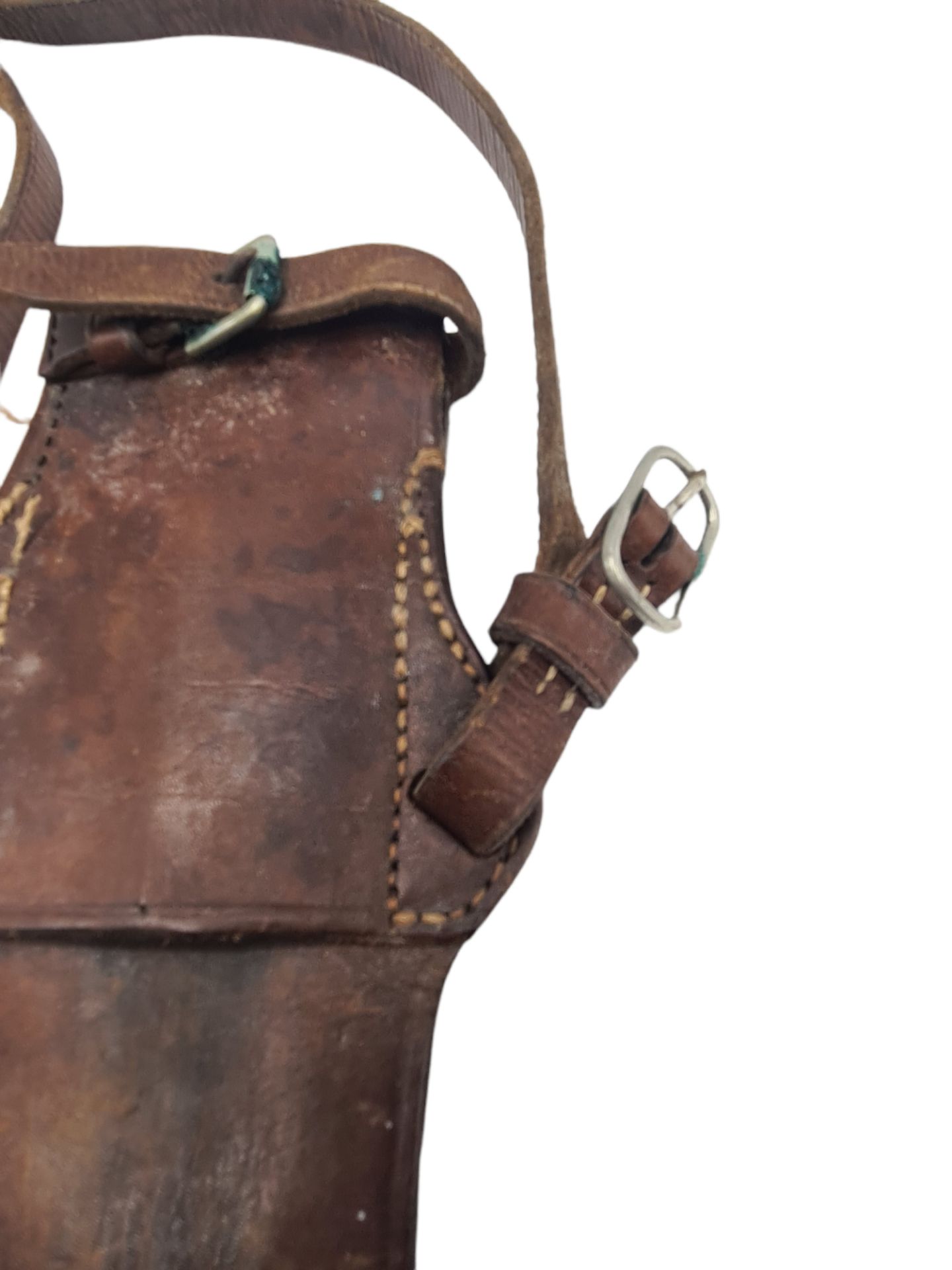Zeldzame sabeldrager voor de zware M1895 cavalerie sabel in prachtige staat. Deze sabeldragers werden naast het paard gehangen om de M1895 sabel in te dragen, de sabeldrager werd gecombineerd met de uitermate zeldzame cavalerie helmdrager. Alle riempjes en gespen zijn nog aanwezig en het leer is in een prachtige soepele lichtbruine staat. Het stiksel is links bovenin iets los. De drager is voorzien van mooie zilverkleurig gespen wat de cavalerie vaker gebruikt. De achterzijde is prachtig gestempeld CW H (voor Huzaren) 1940. Je ziet ook nog duidelijk de gebruikssporen waar de schede van de sabel heeft gezeten. Prachtig item voor de blanke wapen en cavalerie verzamelaar.