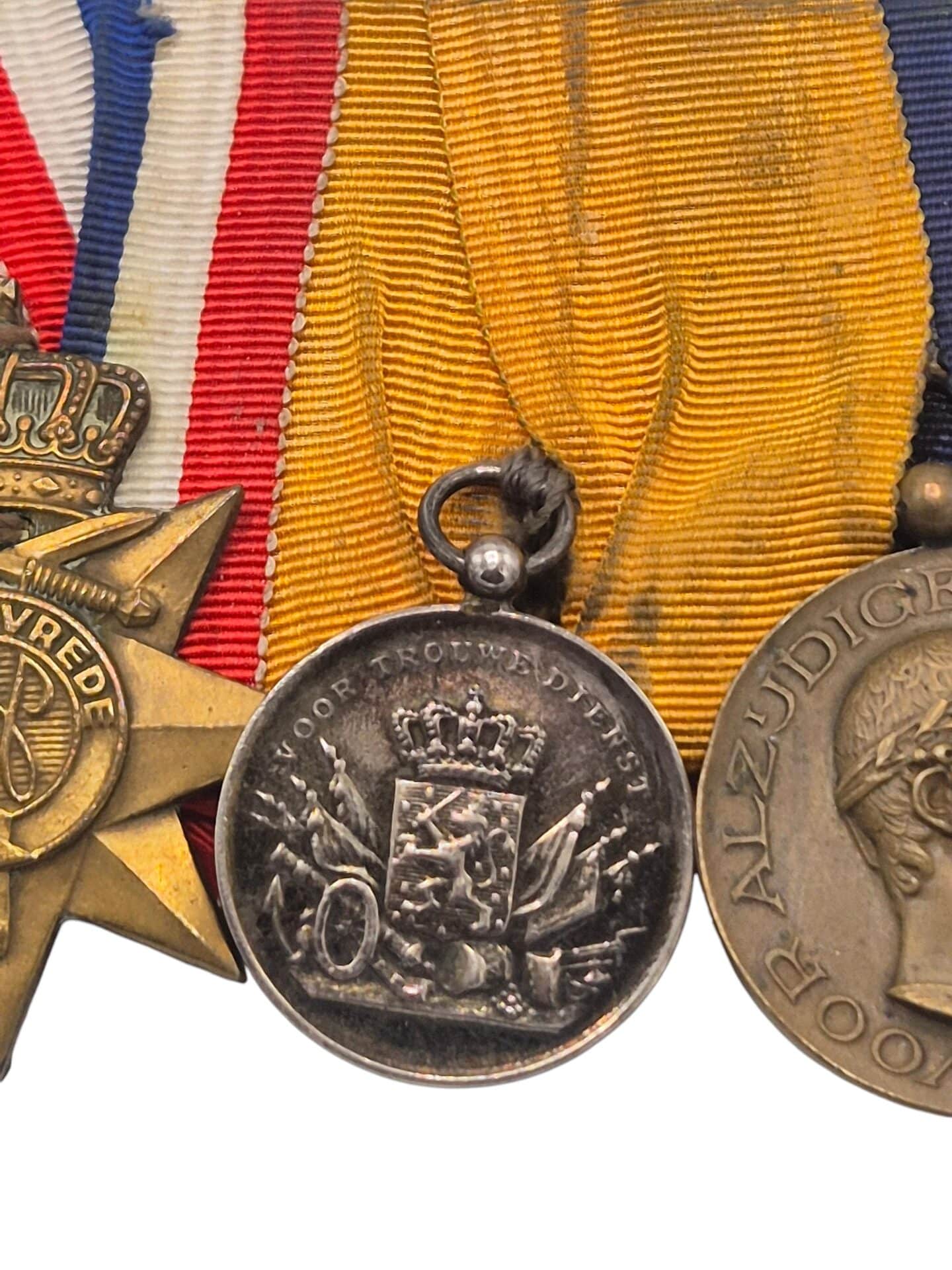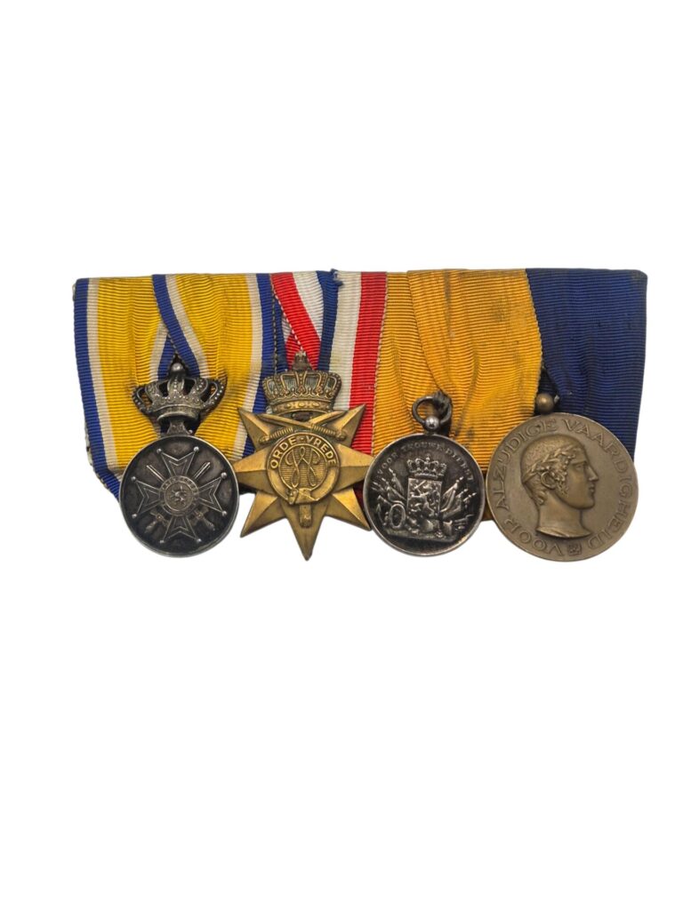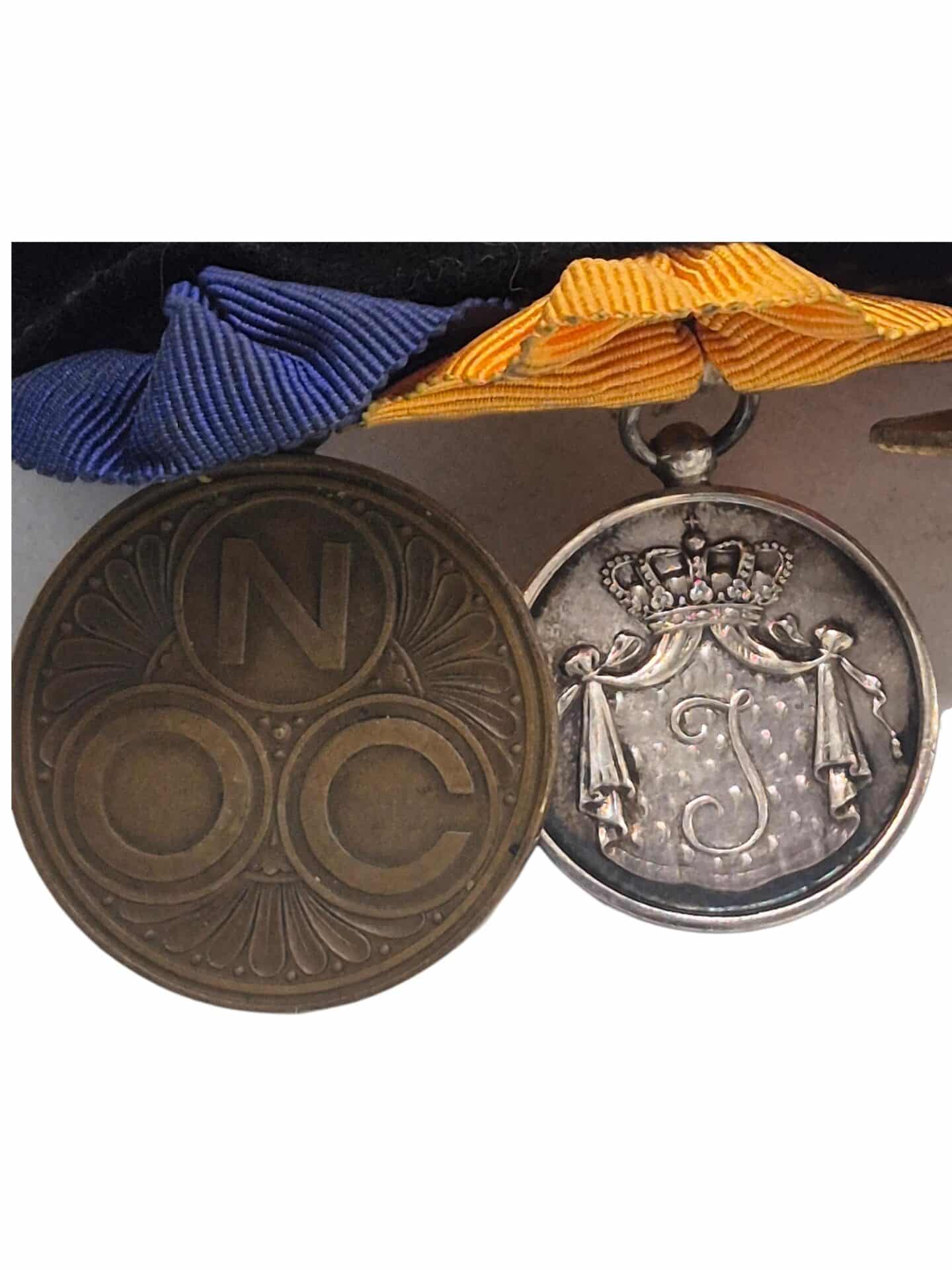 Prachtige set van een Nederlandse onderofficier, de set bestaat uit een eremedaille Oranje Nassau in zilver met zwaarden, de orde en vrede medaille, zilveren trouwe dienst medaille voor 24 jaar en de NOC medaille.