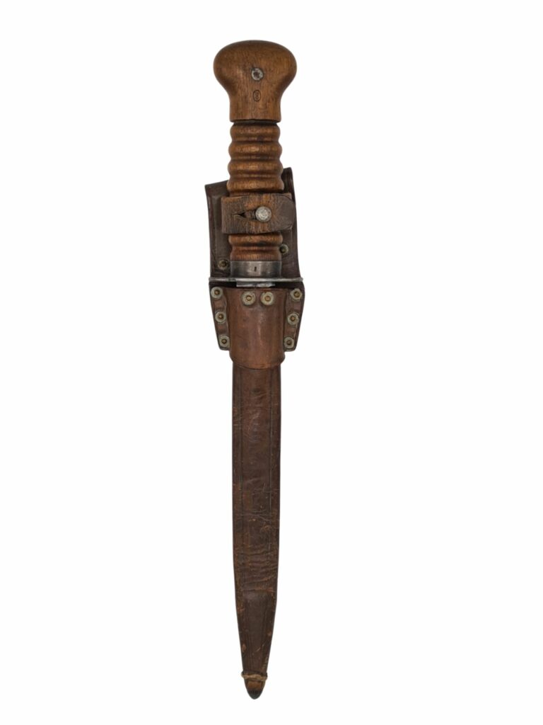 Zeer mooie stormdolk van het Nederlandse leger voor 1940. De stormdolk verkeerd nog in een zeer nette staat. De schede is nog in een mooie lichtbruine gebruikte staat. Onderaan de schede is het originele sluit touwtje nog mooi aanwezig. Het sluitlusje is niet gescheurd en verkeerd nog in een soepele staat. Onder het sluitlusje staan de letters CW gestempeld, wat staat voor Centrale Werkplaats. Aan de achterzijde staat het serienummer gestempeld, 9038 C. De dolk verkeerd ook nog in een zeer goede staat en heeft nog bijna zijn volledige blauwing op het lemmet. Op de stootplaat is het serienummer terug te vinden, 6329 D. Het houten handvat verkeerd ook nog in een keurige staat en is nog voorzien van een keurmeesters stempel.