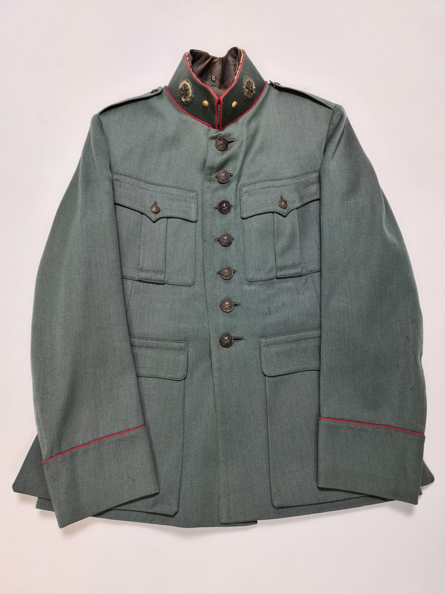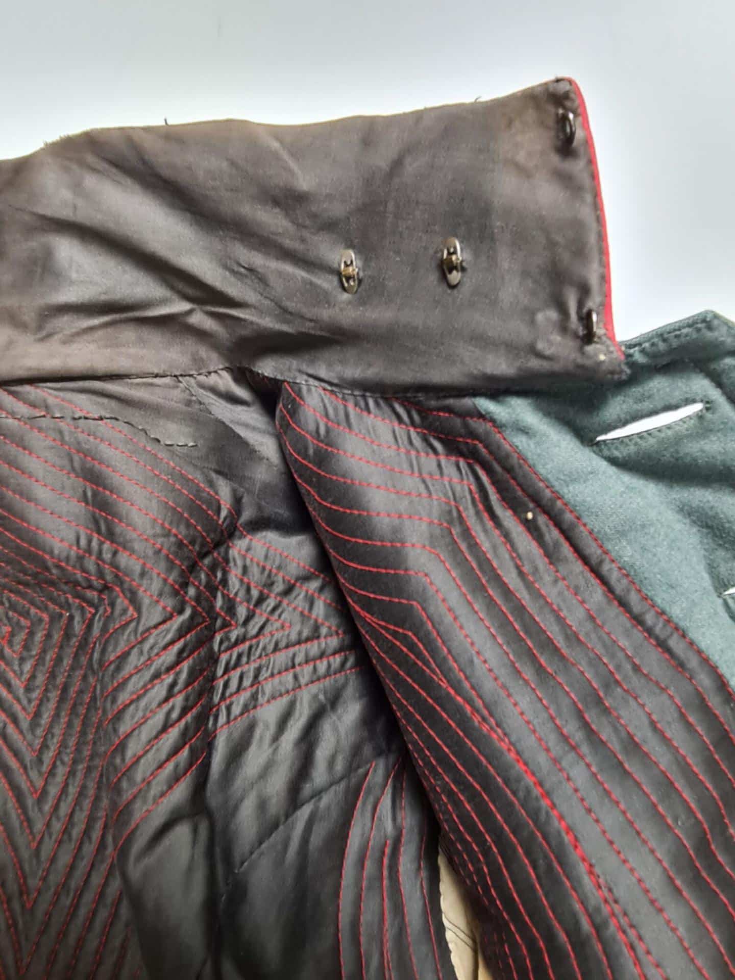 Prachtige uniform set van een adjudant in dienst bij de administratie van de Motordienst. De set bestaat uit een kepie, jas en broek. De jas is gemaakt door de firma C. van Hal uit Breda in 1939. De jas staat op naam van de heer W.H Schaapman. Op de jas zitten een aantal motvraat plekken, vooral aan de achterzijde. Op de kraag zitten naast de adjudant rang aanduidingen de wieltjes van het korps motordienst. Helaas heeft hier een deel van de stiksels los gelaten, maar ze horen wel origineel op het uniform. Verder zitten de voor de administratie kenmerkende roze biezen mooi strak op de kraag. De broek verkeerd nog in een zeer nette staat en heeft slechts een enkel motvraat plekje. Ook op de broek zit de kenmerkende roze bies van de Administratie. Leuk detail zijn de knoopjes op de broek waar de beenkappen aan vast geknoopt konden worden. De kepie is in een nette gebruikte staat. Bovenop de kepie zitten meerdere motgaatjes. Op de kepie zitten een zilveren en een roze bies, wat dus precies klopt met de rang en het onderdeel van het uniform. De kepie is ook gemaakt door de firma C. van Hal uit Breda. Kortom een prachtige complete set van een adjudant van een niet veel voorkomend onderdeel!