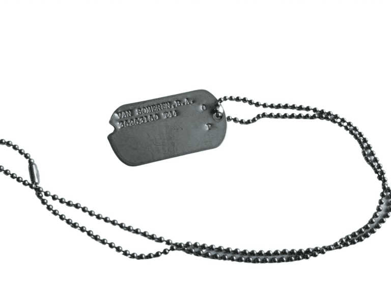 Single dogtag that belonged to Bernard A. van Someren from Michigan, ASN36263160. The dogtag is attached to a ball chain. After the war he became a revenend. Rare piece to a dutch name! Has a lot of research potential