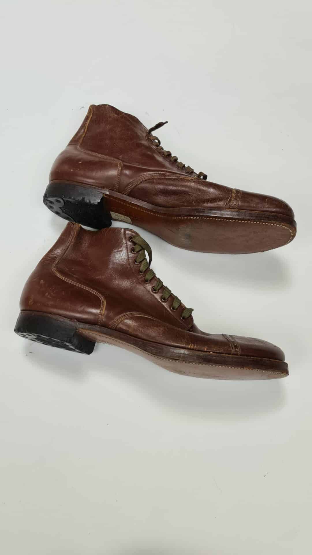 Pair of genuine early WWII US smooth leather combat shoes, featuring the toe cap and rubber heels (Type I). This pair is in a very large size 15 1/2D! These were intended to be worn with canvas leggings. Still in a very good condition and could easily fit on a modern mannequin!