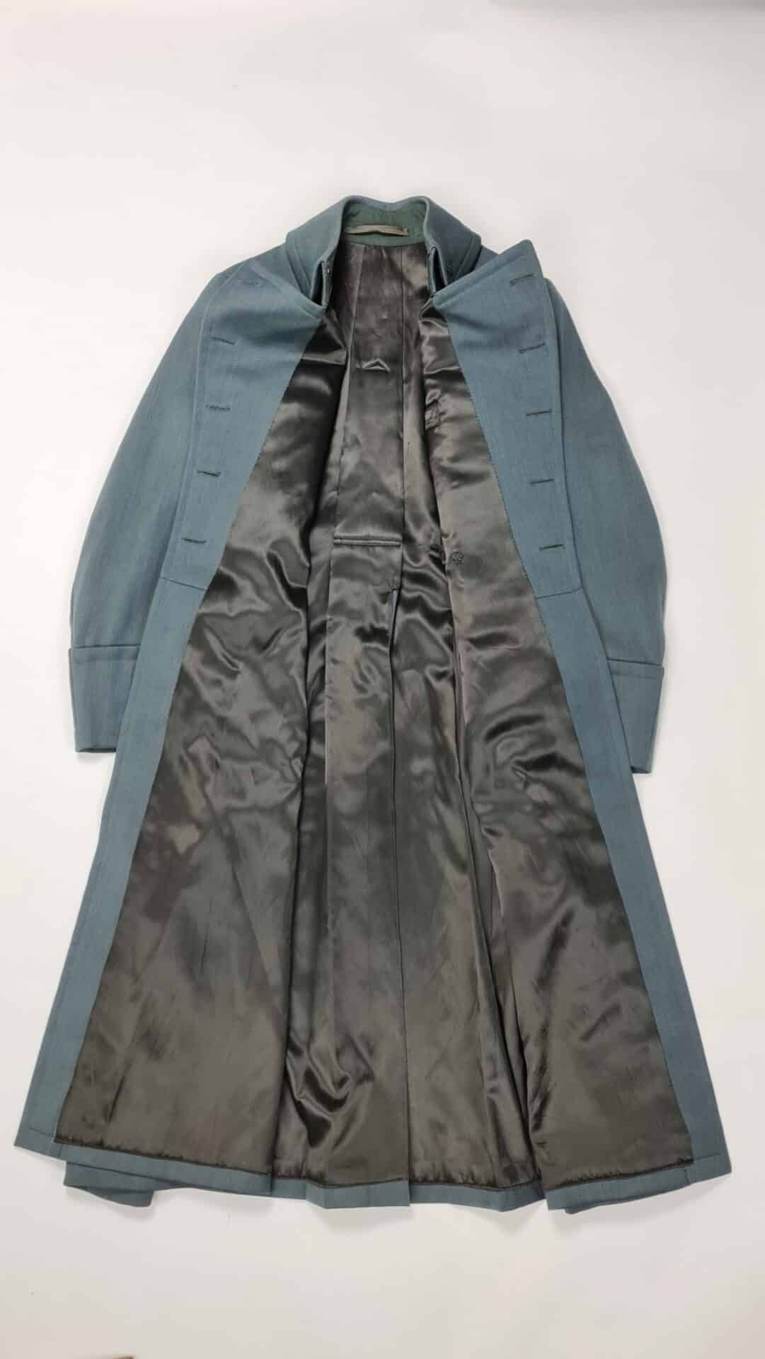Prachtige veldgrijzen buitenmodel aanmaak bereden overjas van een kapitein. De jas is gemaakt van een zeer goede kwaliteit veldgrijze ribcord stof. Kosten nog moeite zijn bespaard bij het maken van deze overjas. Zo is er extra stof aangebracht in de kraag om het draagcomfort te verhogen. Zelfs de binnenkant van de zakken zijn uitgevoerd met een luxe stof! De kapiteins sterren zijn gemaakt van gouddraad en mooi in geborduurd op de kraag. De jas heeft een mooie brede uitloop, zodat de overjas mooi over het paard heen viel. Er staan geen naam of makerslabel in de jas.  De jas verkeerd in een zeer goede staat en is misschien wel de mooiste overjas die op dit moment op de markt is!