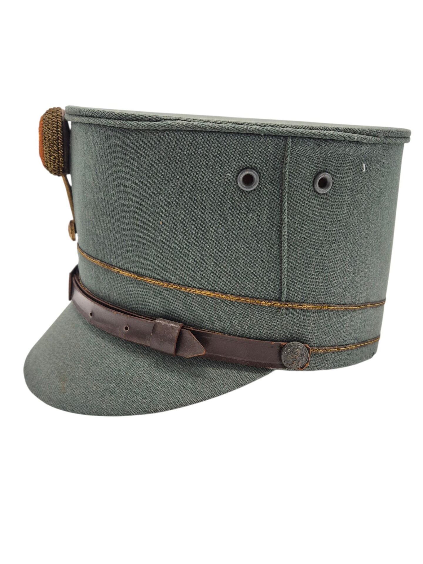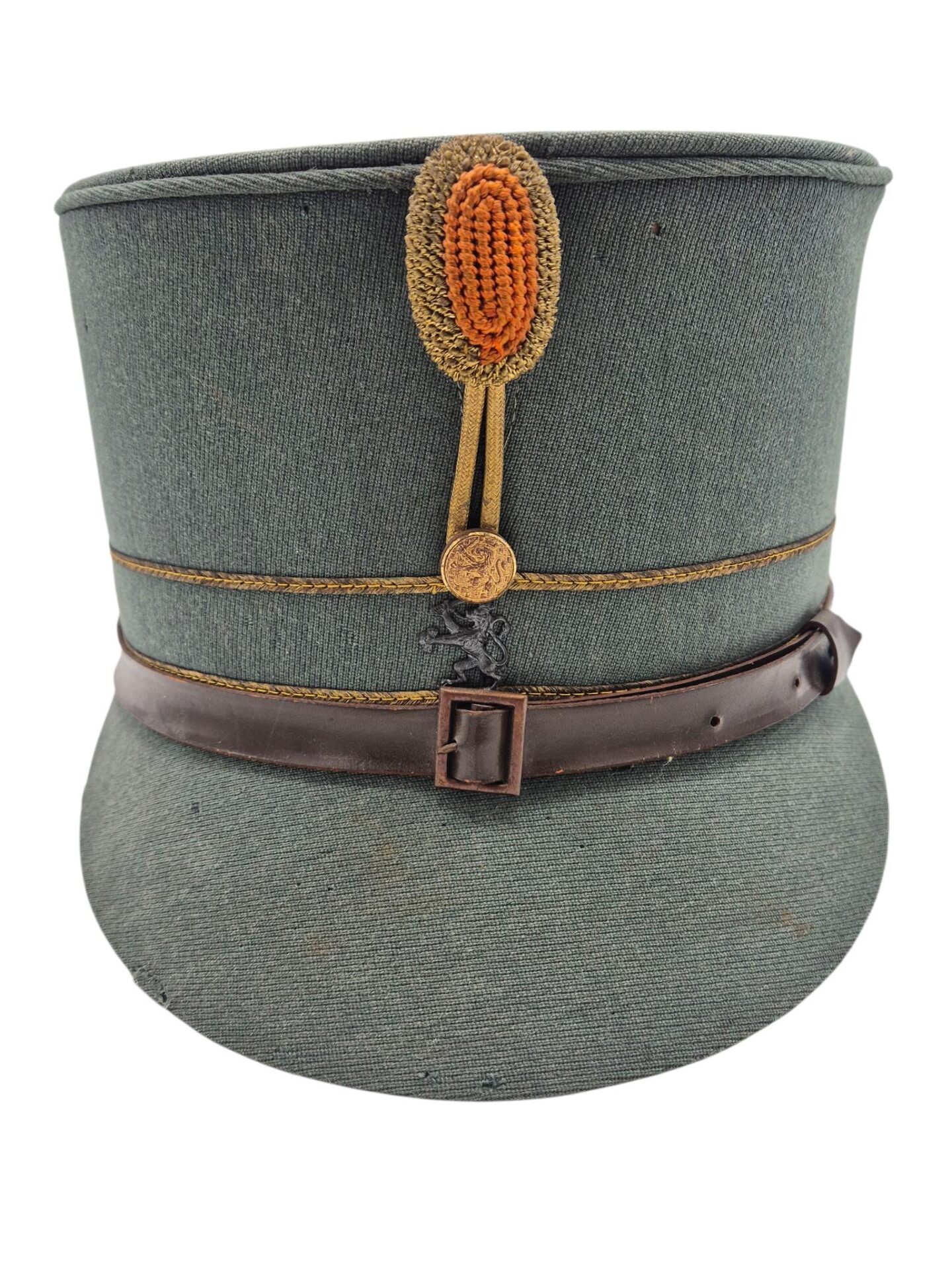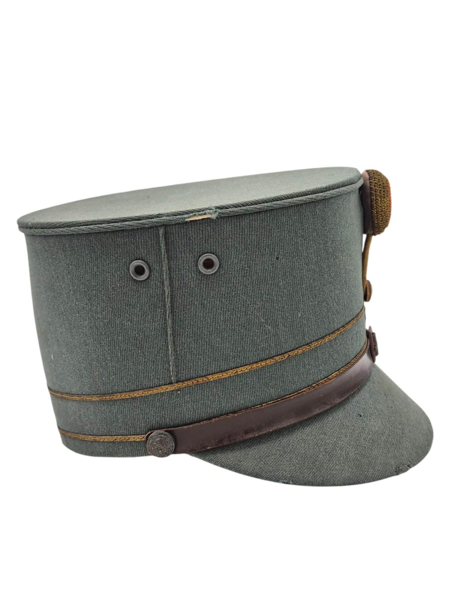 Mooie veldgrijze kepie van een officier. De kepie verkeerd in een goede staat met een aantal motplekjes. De kepie is gemaakt van midden jaren 30 ribcord. Op de kepie zit het leeuwtje . Hierboven zit de gouden kokarde en 2 gouden biezen, horende bij de rangaanduiding van een officier. De lederen stormriem verkeerd nog in een mooie staat. De binnenzijde van de kepie is nog in een zeer goede conditie met een soepele leren zweetband.