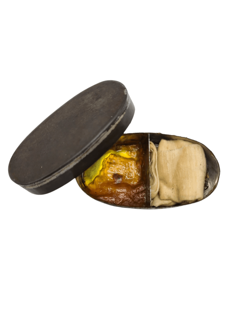 Mooi origineel vetdoosje voor het Hembrug M.95 geweer of voor de M.73 revolver. Het blikje verkeerd nog in een goede staat en heeft zelfs nog een deel van zijn originele groene verf. In het doosje zit nog een poetsdoekje en vet.