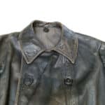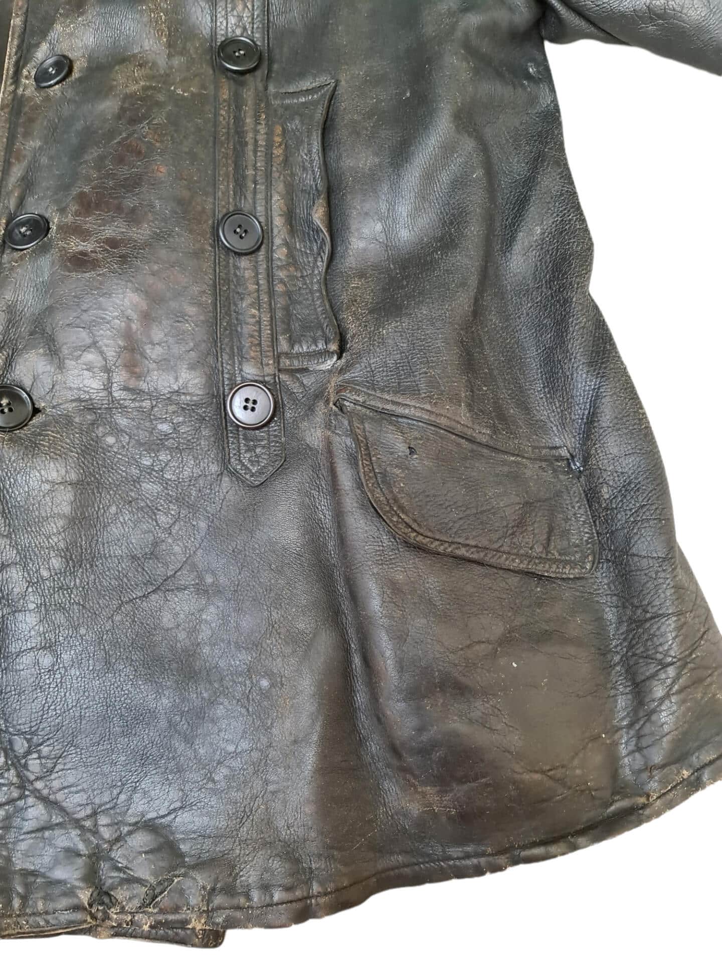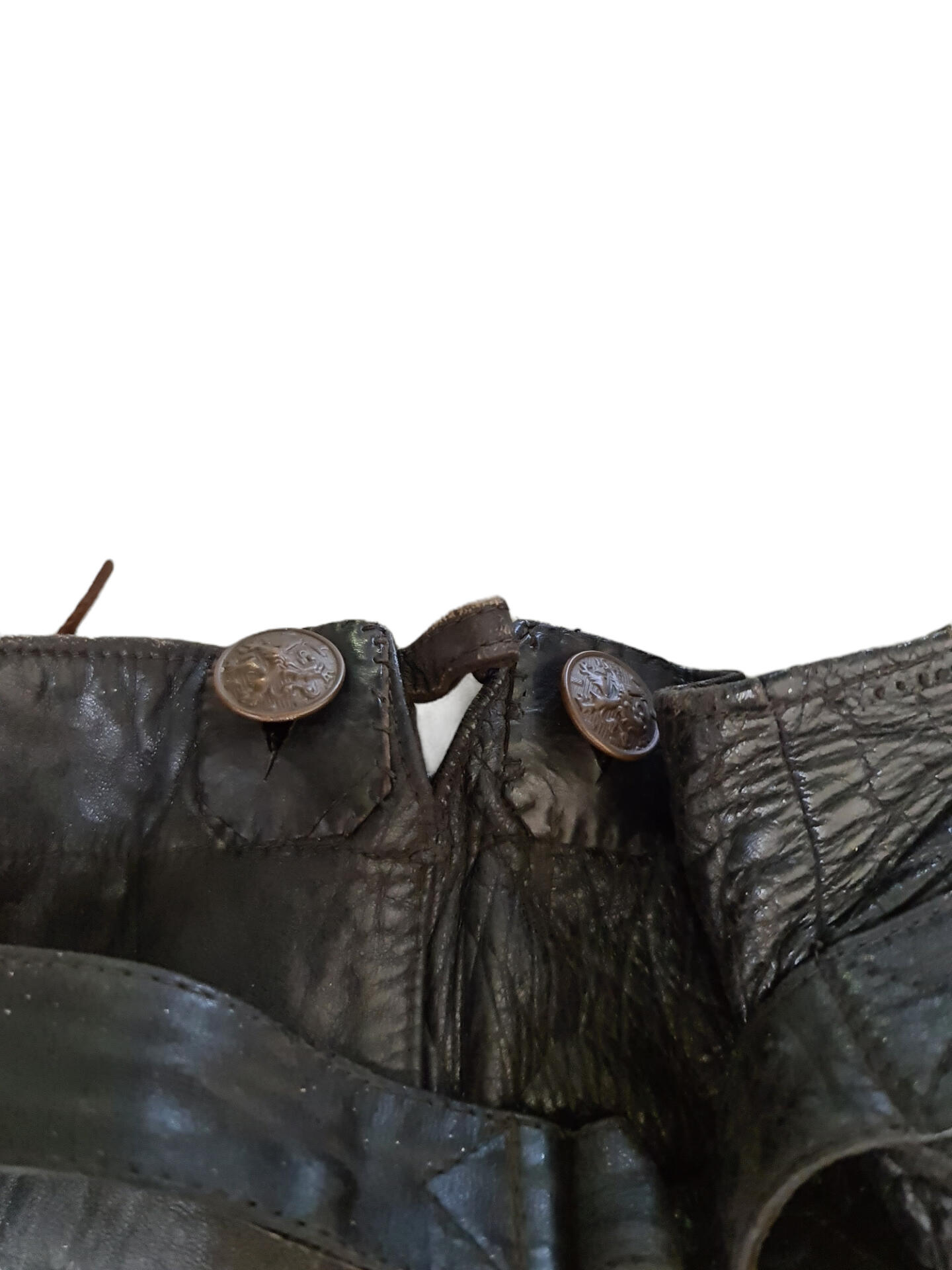 Vooroorlogs leren motor rijders pak, bestaande uit een jas en broek. De jas is het standaard model voor de motor rijders en ordonnansen en gemaakt van zwart chroomleer. De jas is voorzien van zijn originele knopen. De extra binnenvoering mist helaas, maar de drukknopen waar deze ingedrukt moest worden zijn nog allemaal aanwezig. Ook is de jas CM 1939 gemarkeerd aan de binnenzijde. De broek is van een afwijkend model maar wel voorzien van leeuwen knopen. Wellicht is dit een buitenmodel aanmaak. Helaas hebben wij hierover geen extra informatie kunnen vinden. De prijs is hier ook op aangepast!