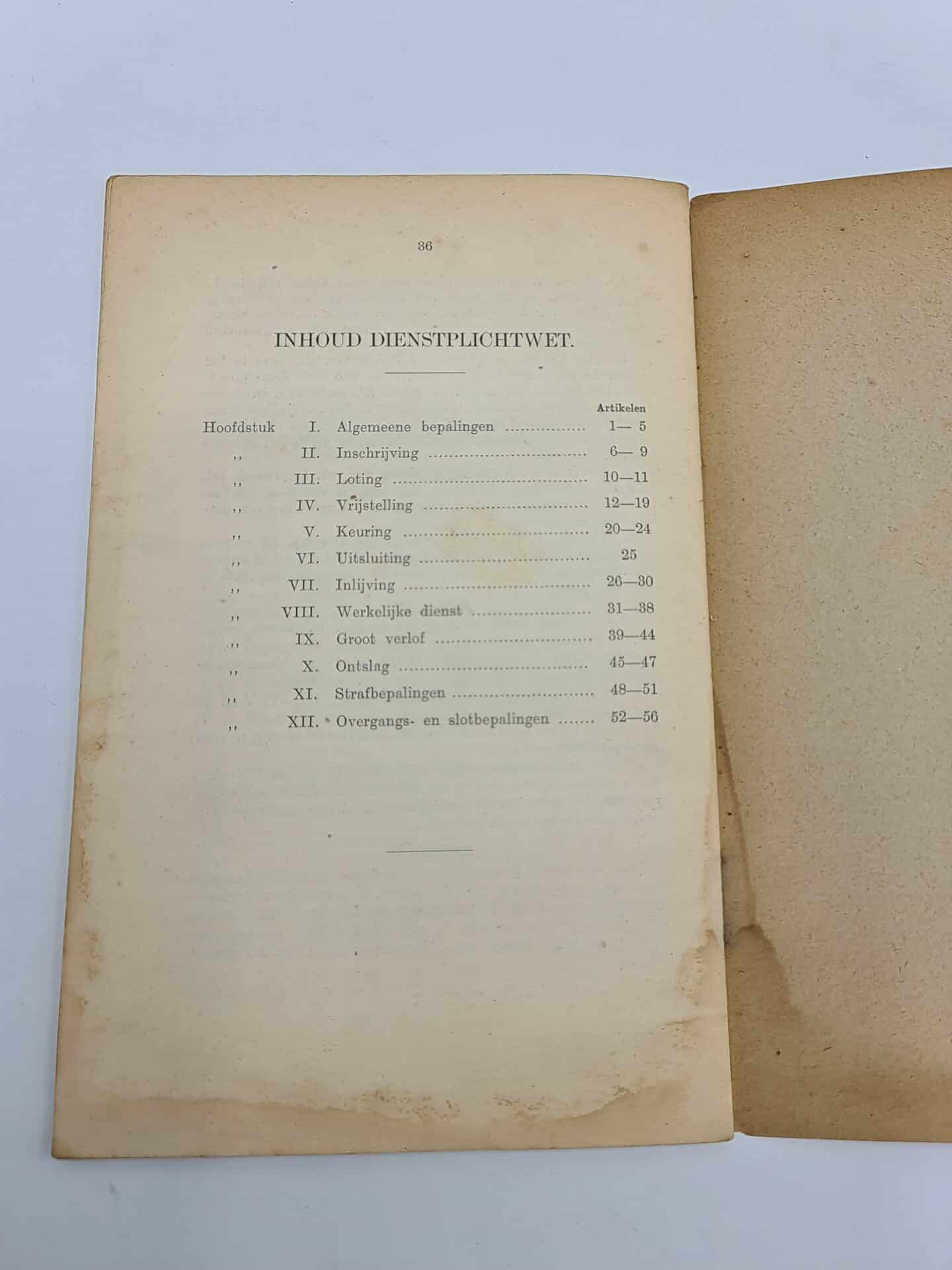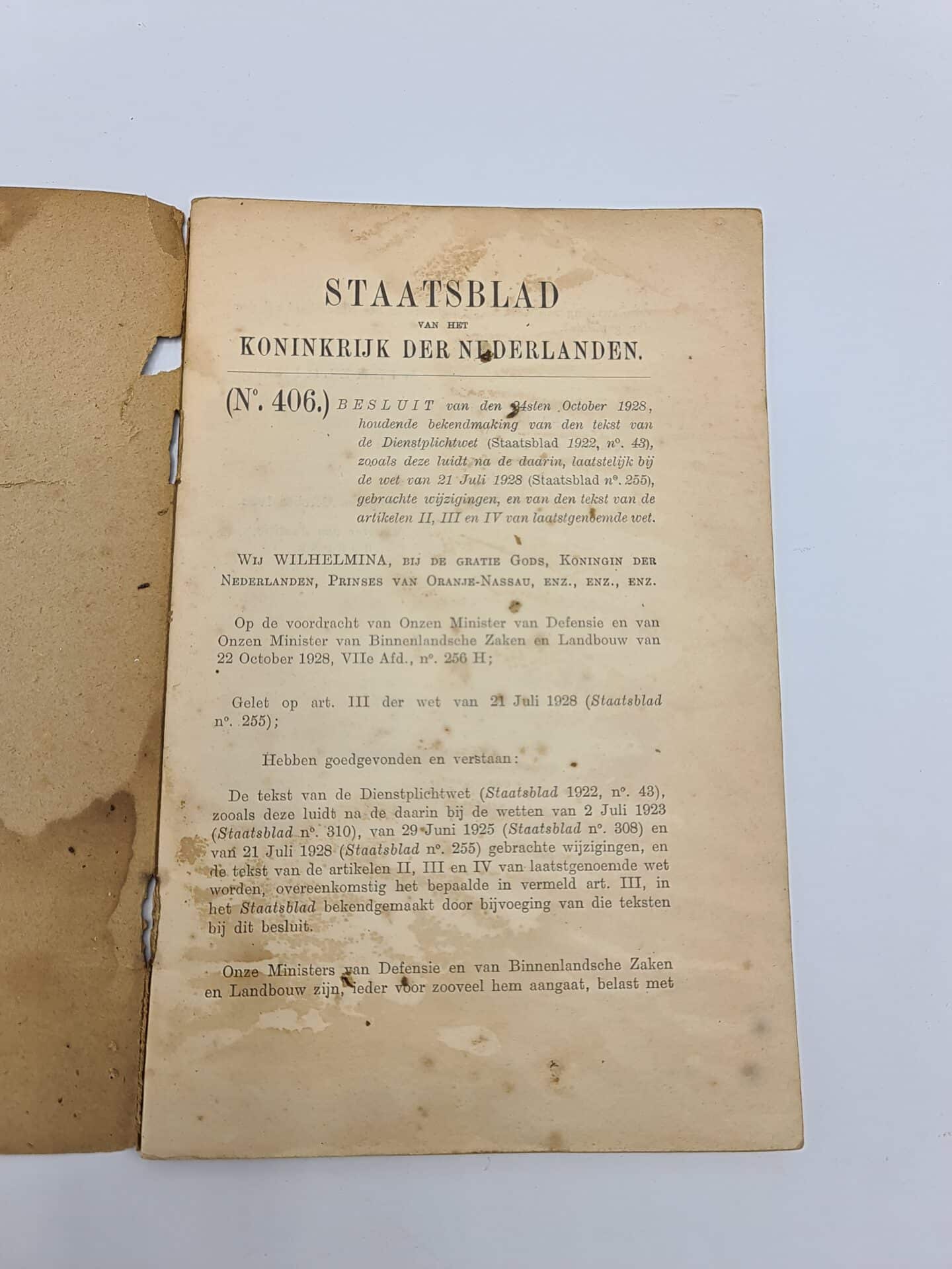 Voorschrift gewijzigde dienstplichtwet 5e depot bataljon. Het voorschrift verkeerd in een gebruikte staat en in uitgegeven in 1928.