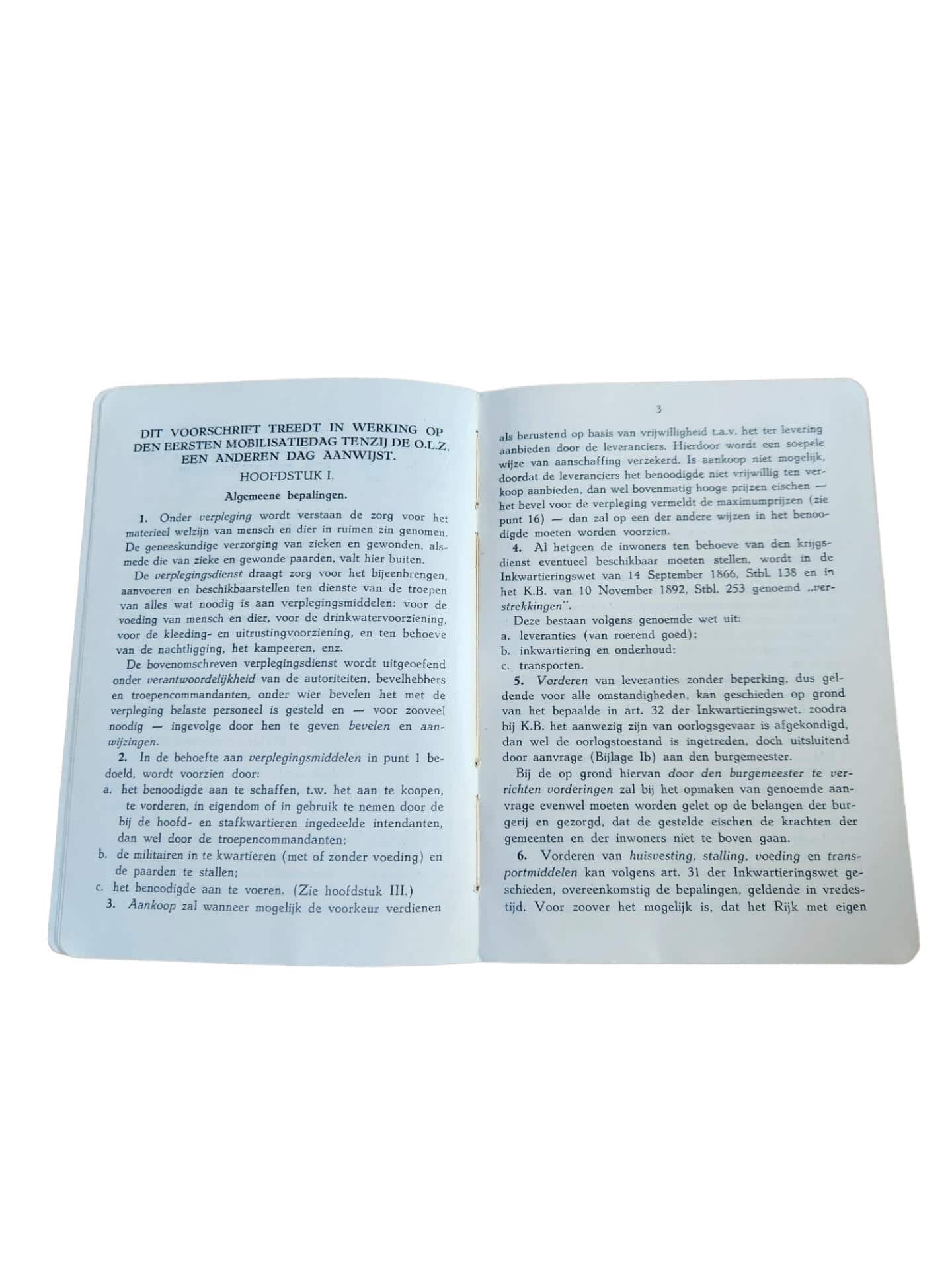 Vooroorlogs Nederlands voorschrift no.51a verpleging van de landmacht na afroep van de mobilisatie. Het voorschrift was eigendom van dienstplichtige sergeant majoor administrateur C.S.J van der Spek. Hij was ingedeeld bij het regiment grenadiers. Het voorschrift verkeerd in een goede staat.