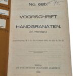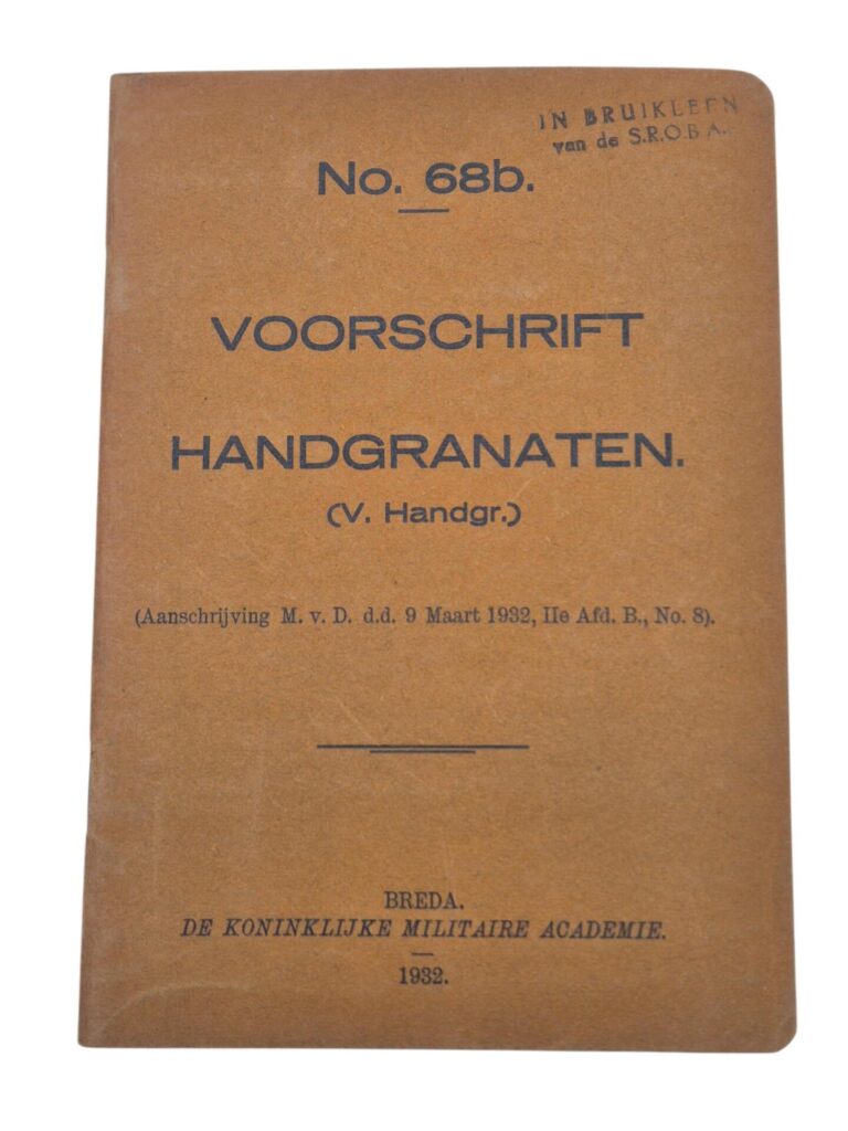 Nederlands voorschrift no 68b handgranaten. Zeer informatief boekje over de verschillende Nederlandse handgranaten. Het boekje verkeerd in een goede staat en is voorzien van aanpassingen. Mooi gestempeld SROBA en op naam van de heer V Mutserts.