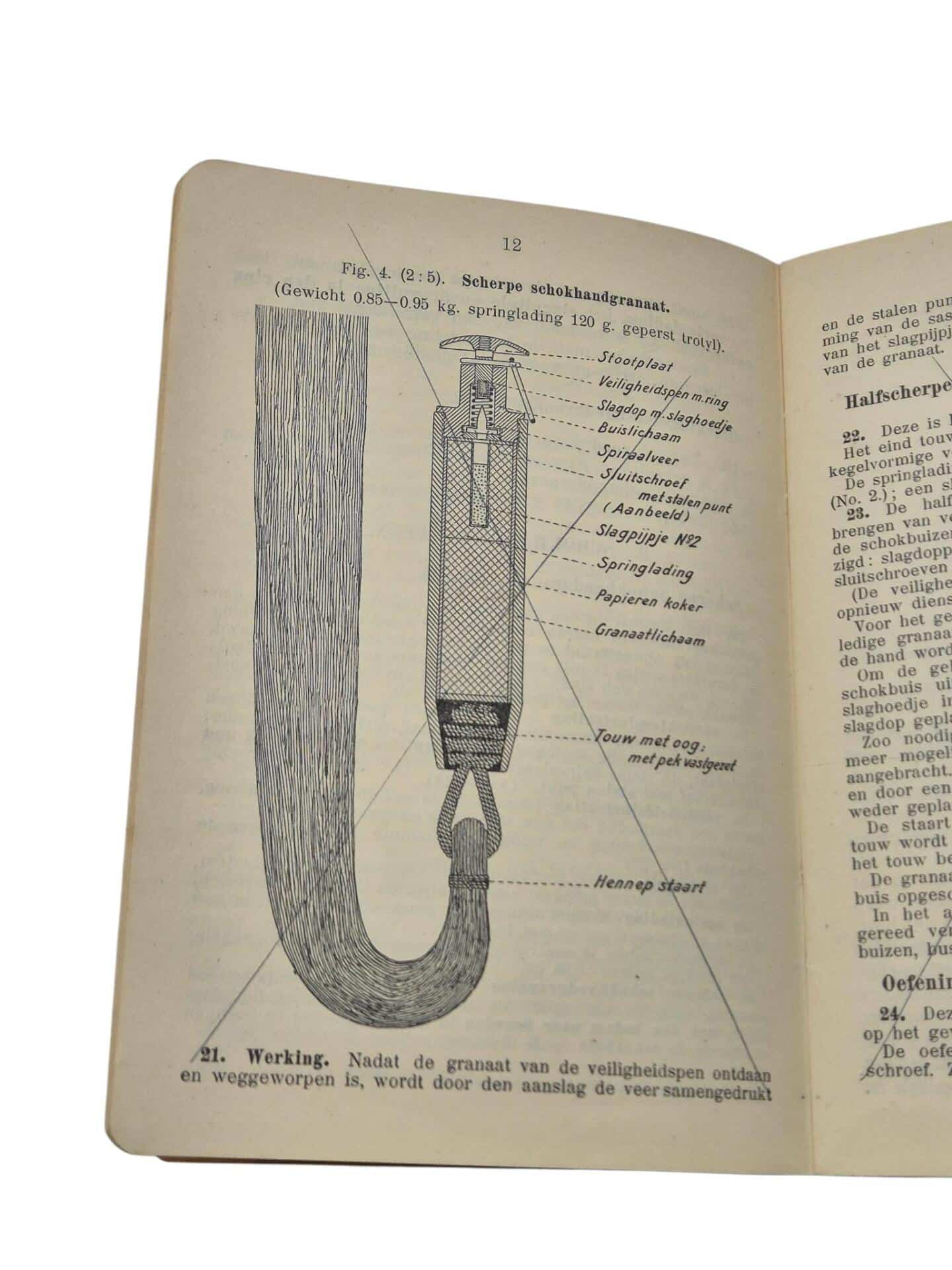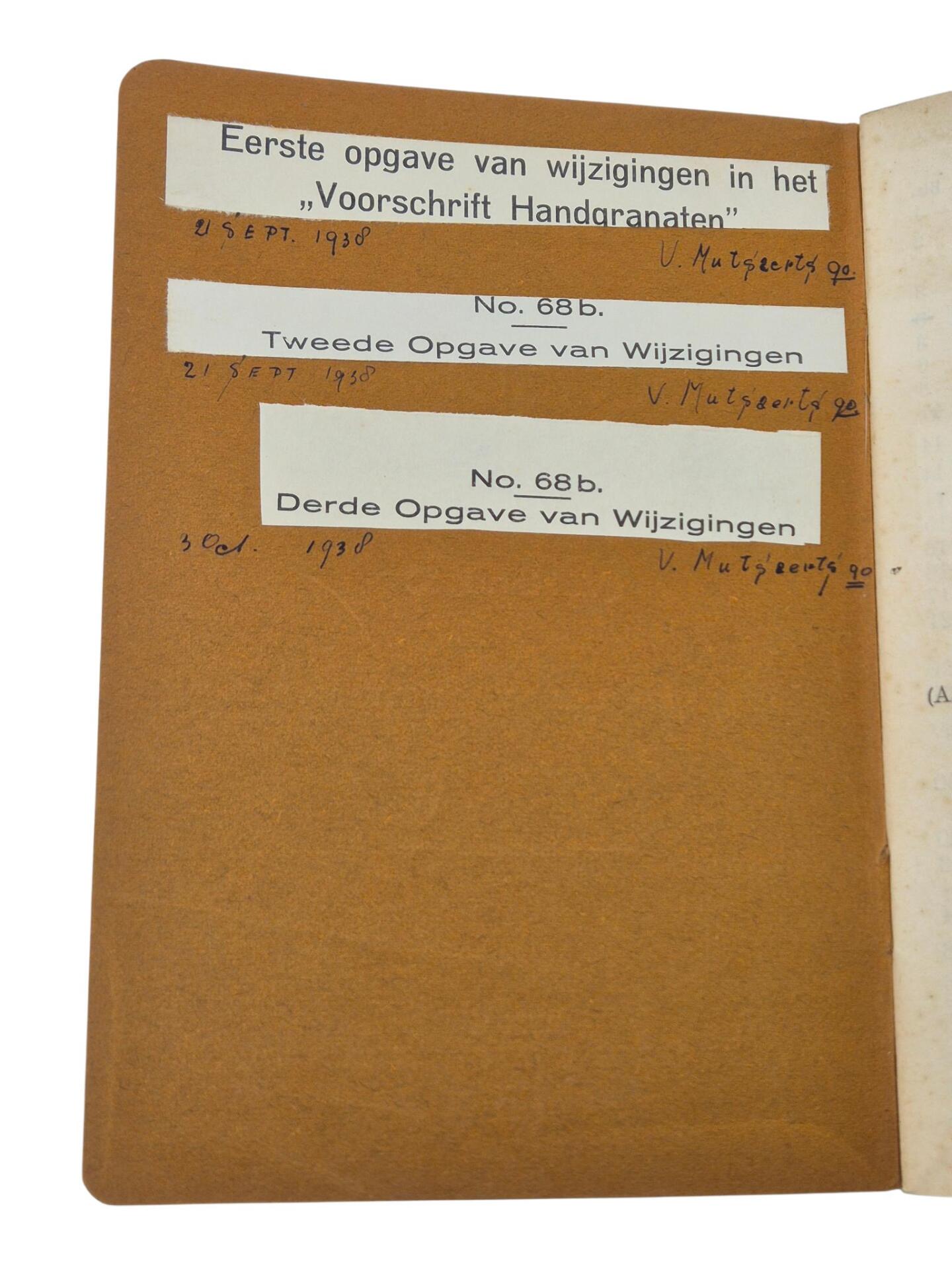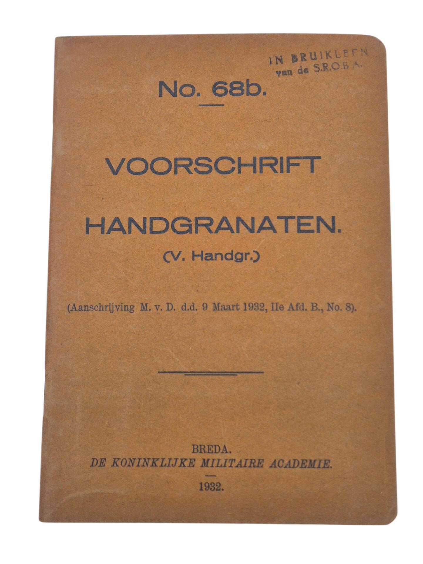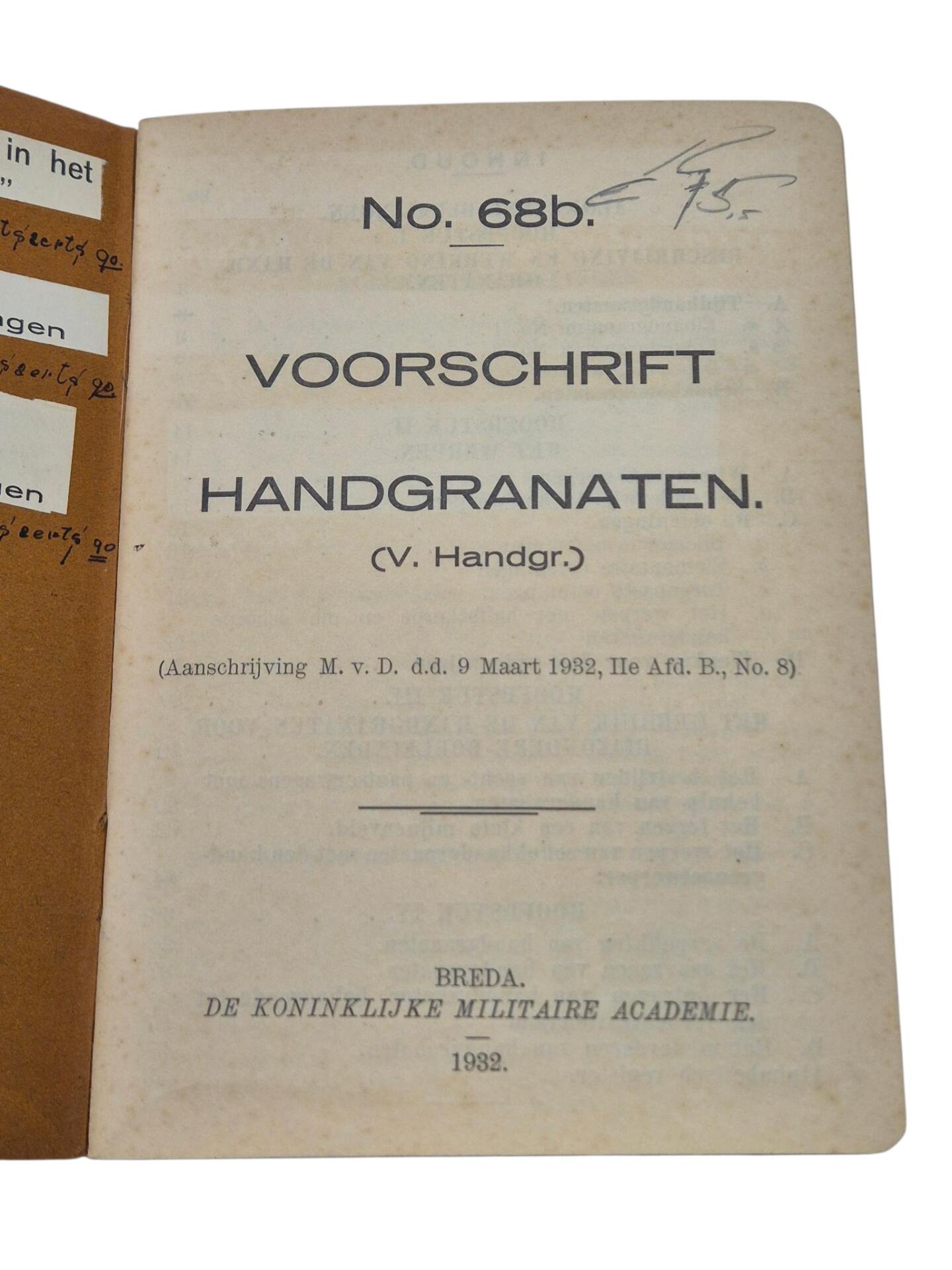 Nederlands voorschrift no 68b handgranaten. Zeer informatief boekje over de verschillende Nederlandse handgranaten. Het boekje verkeerd in een goede staat en is voorzien van aanpassingen. Mooi gestempeld SROBA en op naam van de heer V Mutserts.
