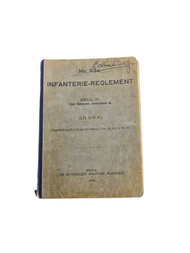 Nederlands voorshrift No.93 a Infanterie reglement deel 2 Het gevecht, onderdeel A. Het boekje verkeerd in een nette staat en is uitgegeven in 1934. Op de voorkant is de naam te lezen van de oorspronkelijke eigenaar, L.A van Lis jr.
