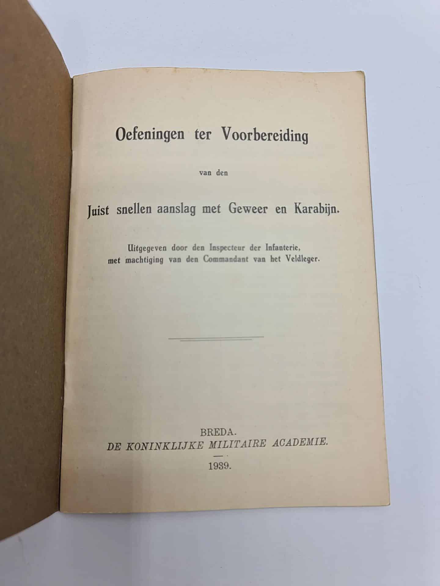 Voorschrift ter voorbereiding van den juist snellen aanslag met geweer en karabijn. Het boekje verkeerd in een goede staat en is uitgegeven in 1939.