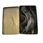 Very nice set of dust goggles. The goggles are in great condition, the rubber is still flexible as well as the elastic head band. The lenses are very clear and without serious scratches. The goggles are dated 41. The spare lenses are mint in the original pouch. The metal storage container is in a great condition as well with a lot of the original finish. Hard to improve set of goggles.