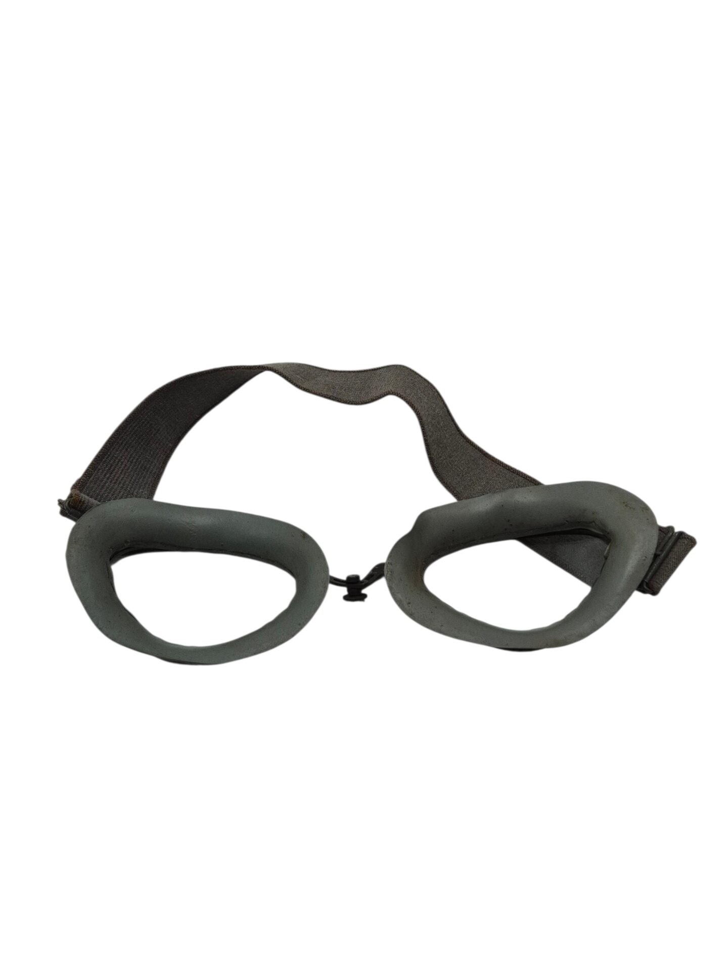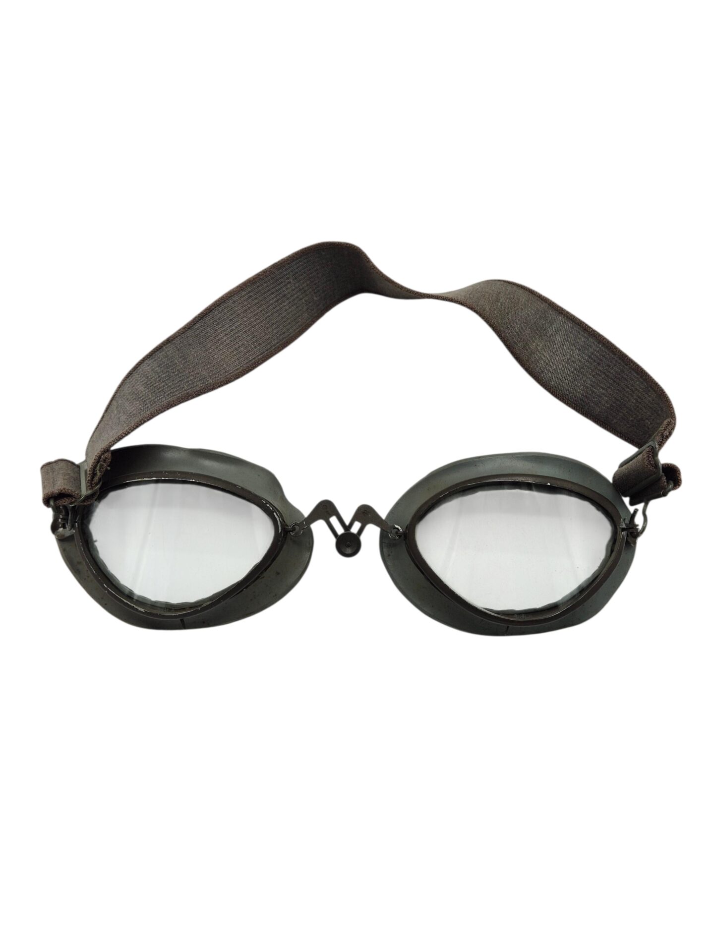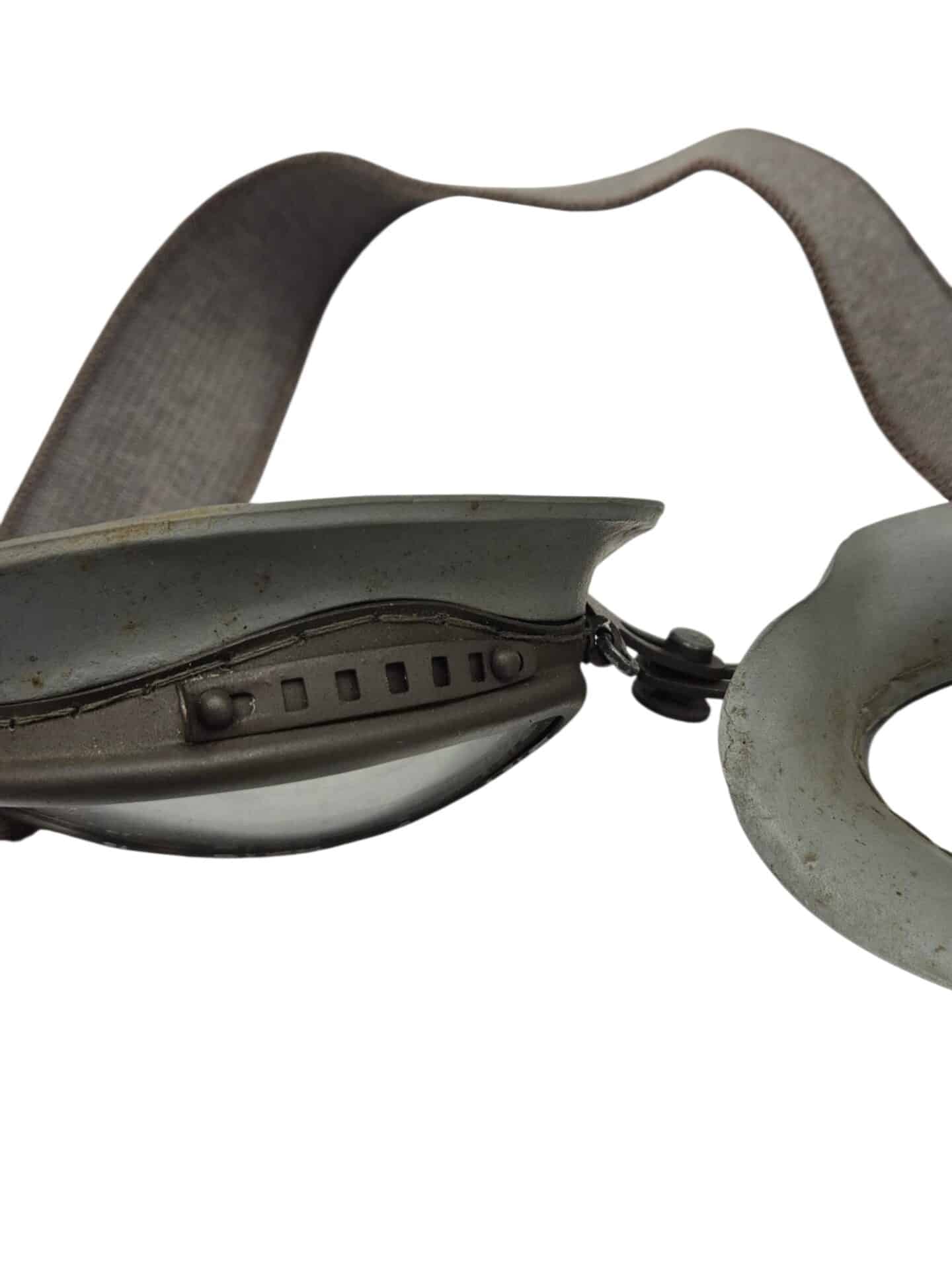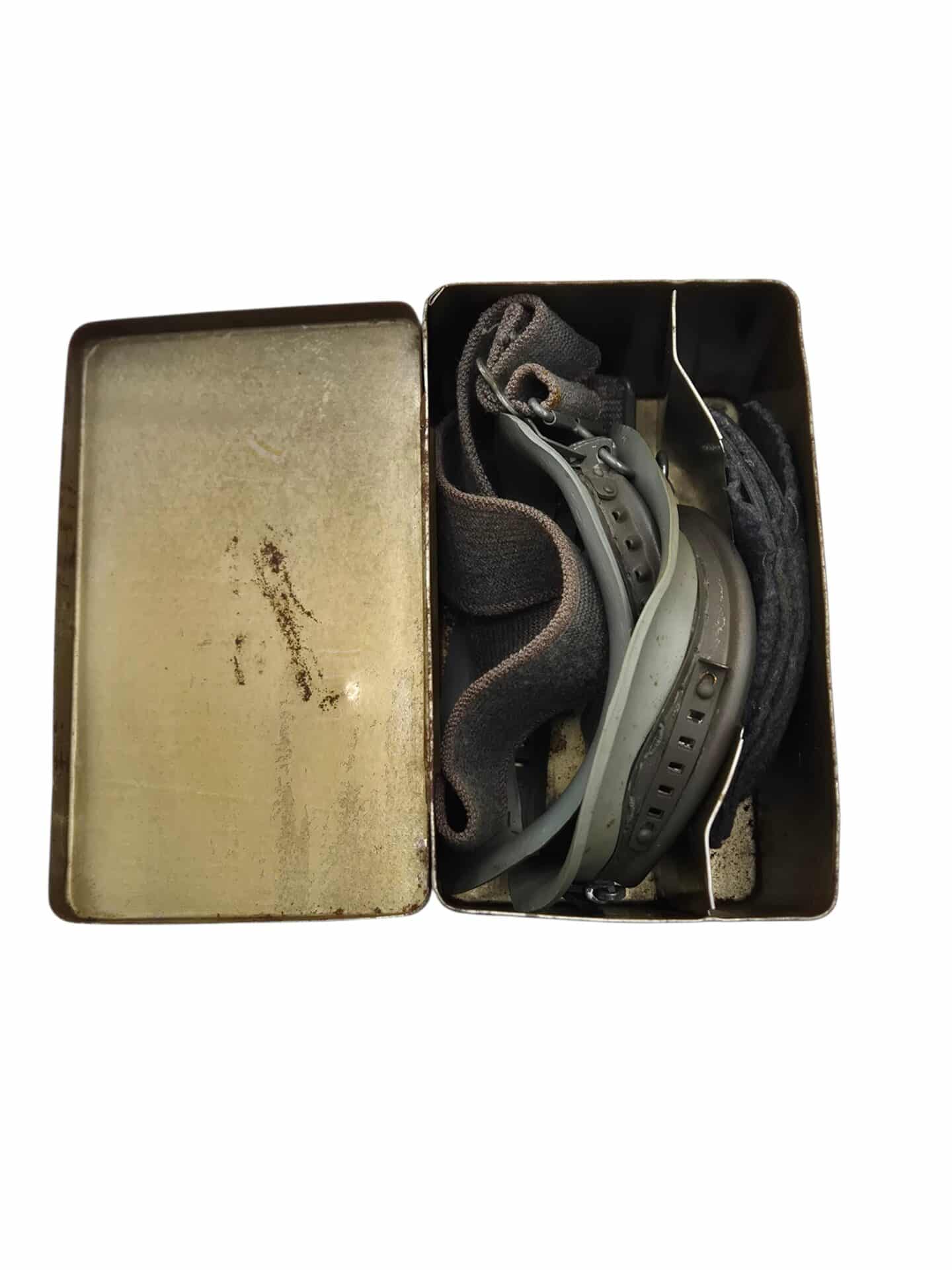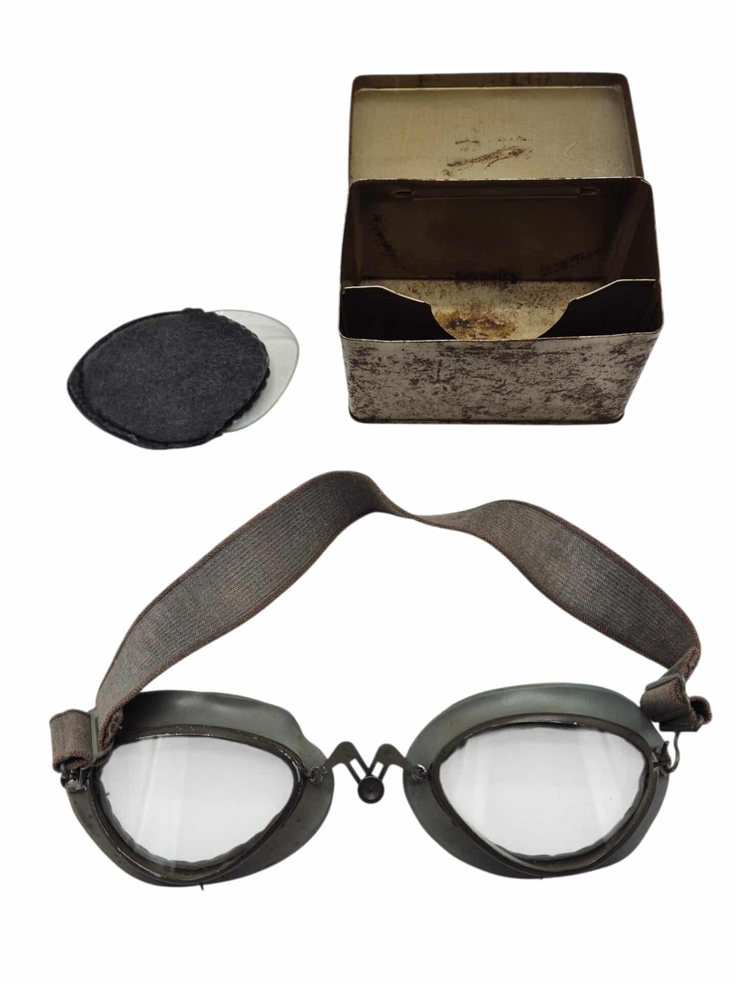Very nice set of dust goggles. The goggles are in great condition, the rubber is still flexible as well as the elastic head band. The lenses are very clear and without serious scratches. The goggles are dated 41. The spare lenses are mint in the original pouch. The metal storage container is in a great condition as well with a lot of the original finish. Hard to improve set of goggles.